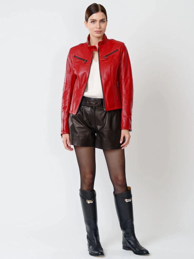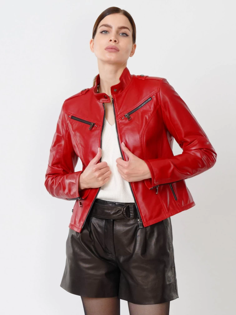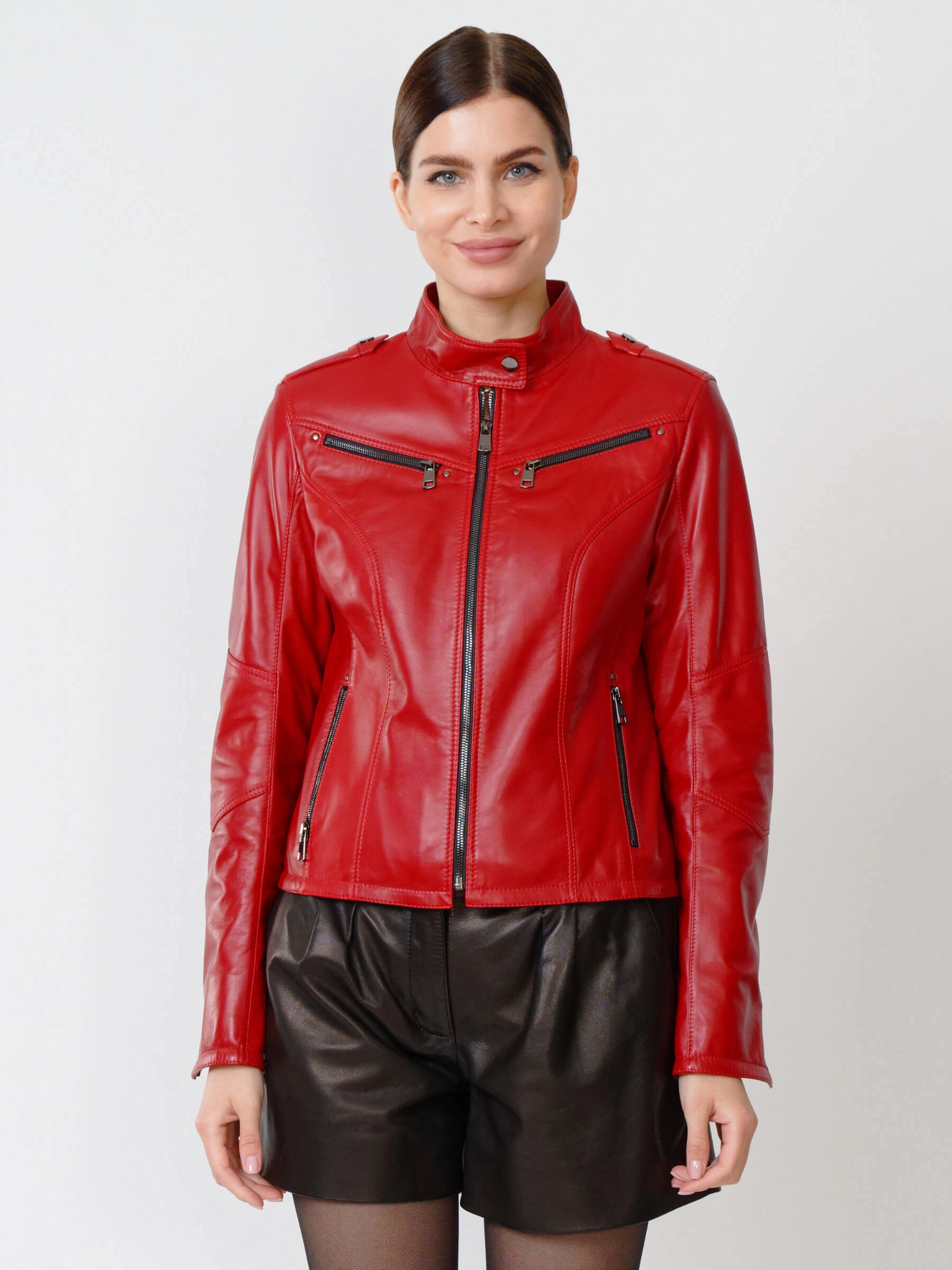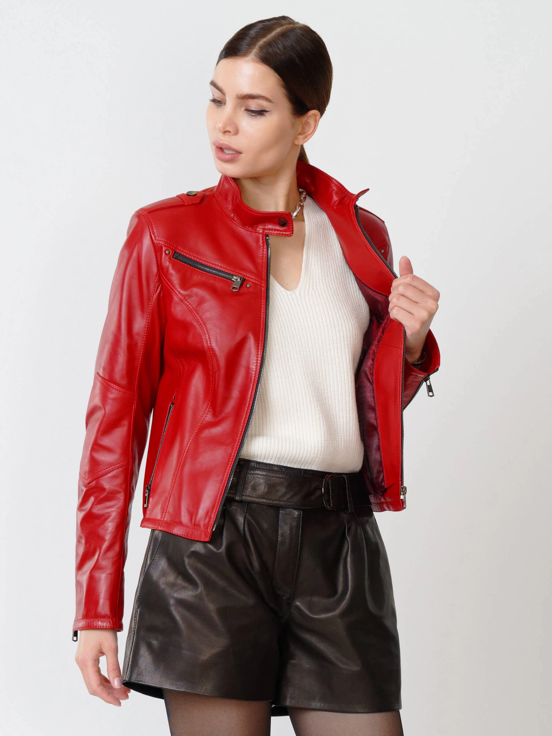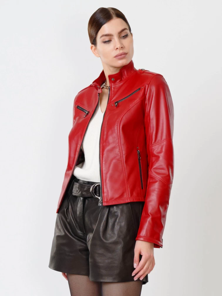 Товар кожаная куртка женская 399, красная, размер 48, артикул 90921 выполнен из натуральной кожи с застежкой молния. Рассчитан на сезон: весна-лето. Длина изделия 51 см, силуэт приталенный .