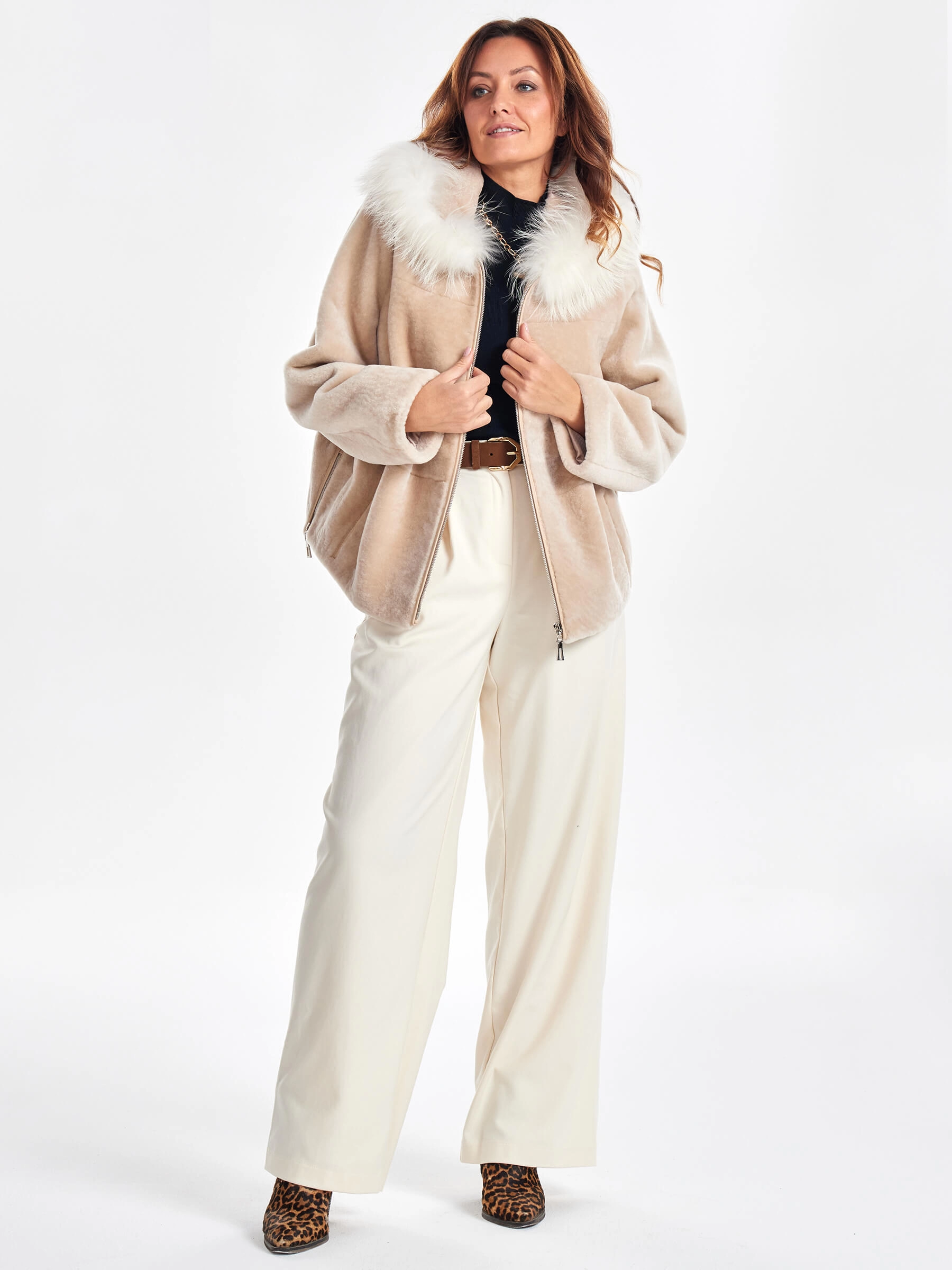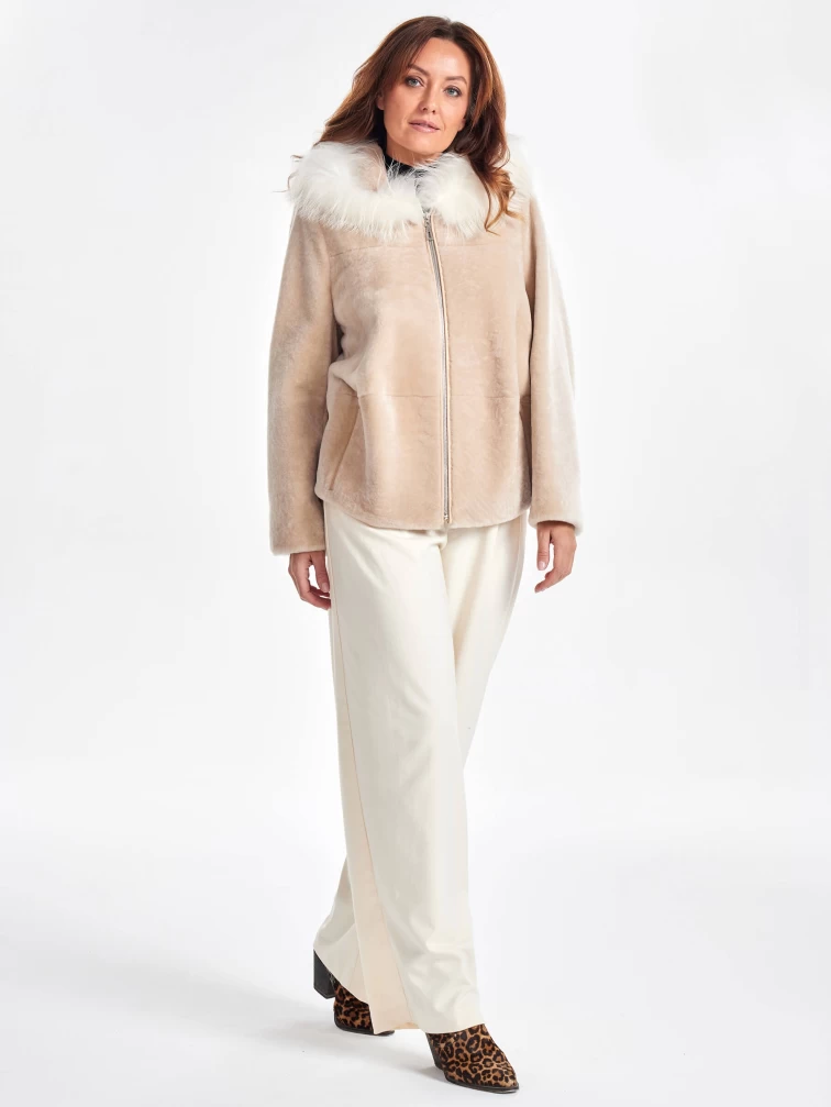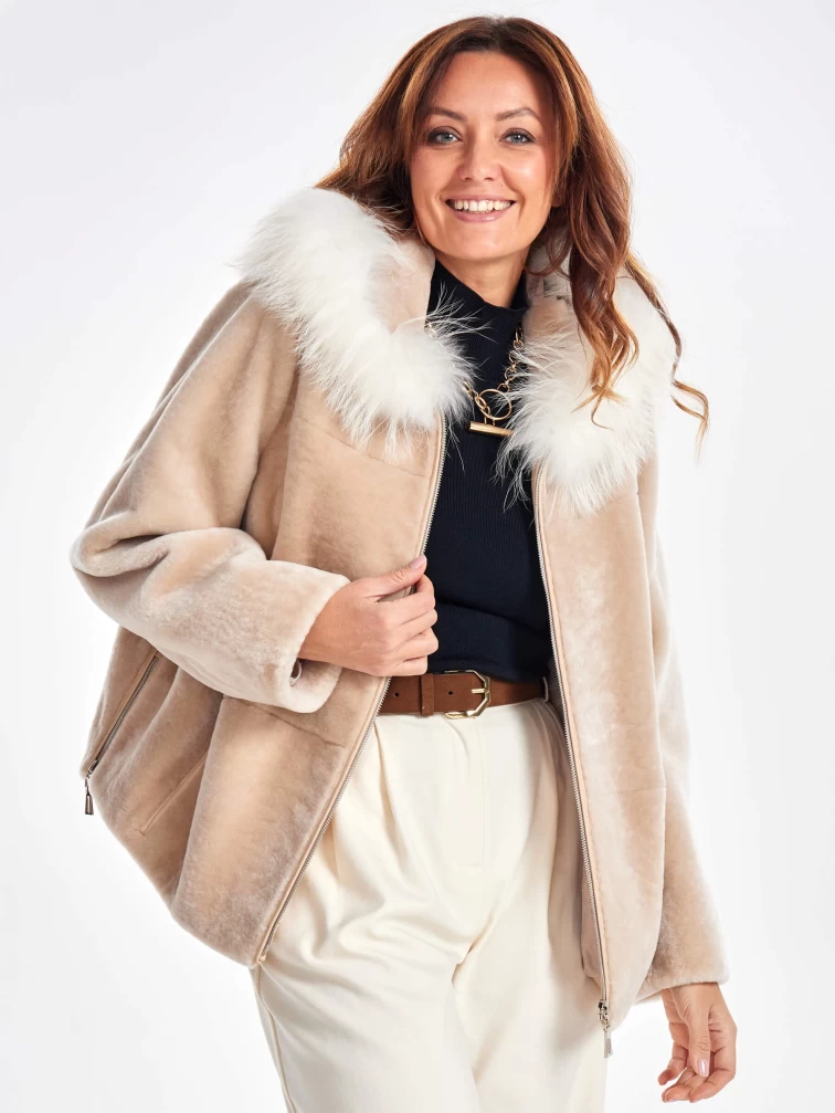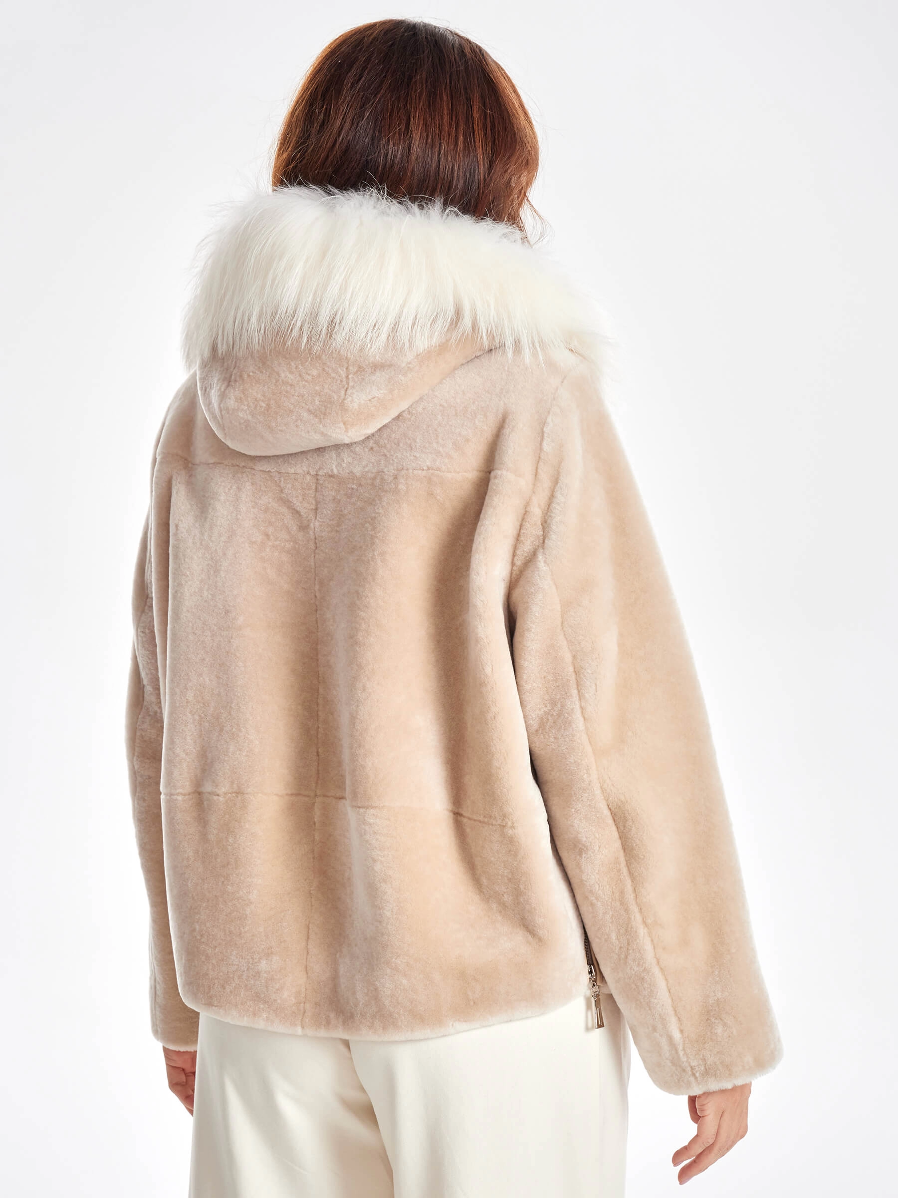 Короткая женская дубленка из астрагана с капюшоном и отделкой мехом песца 48мех, бежевая, размер 46, артикул 17580
