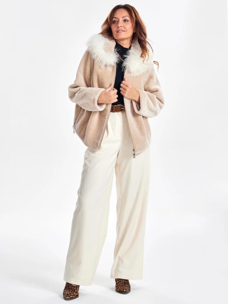 Товар короткая женская дубленка из астрагана с капюшоном и отделкой мехом песца 48мех, бежевая, размер 46, артикул 17580 выполнен из астраган с застежкой молния. Рассчитан на сезон: осень-зима. Длина изделия 68 см, силуэт свободный.
