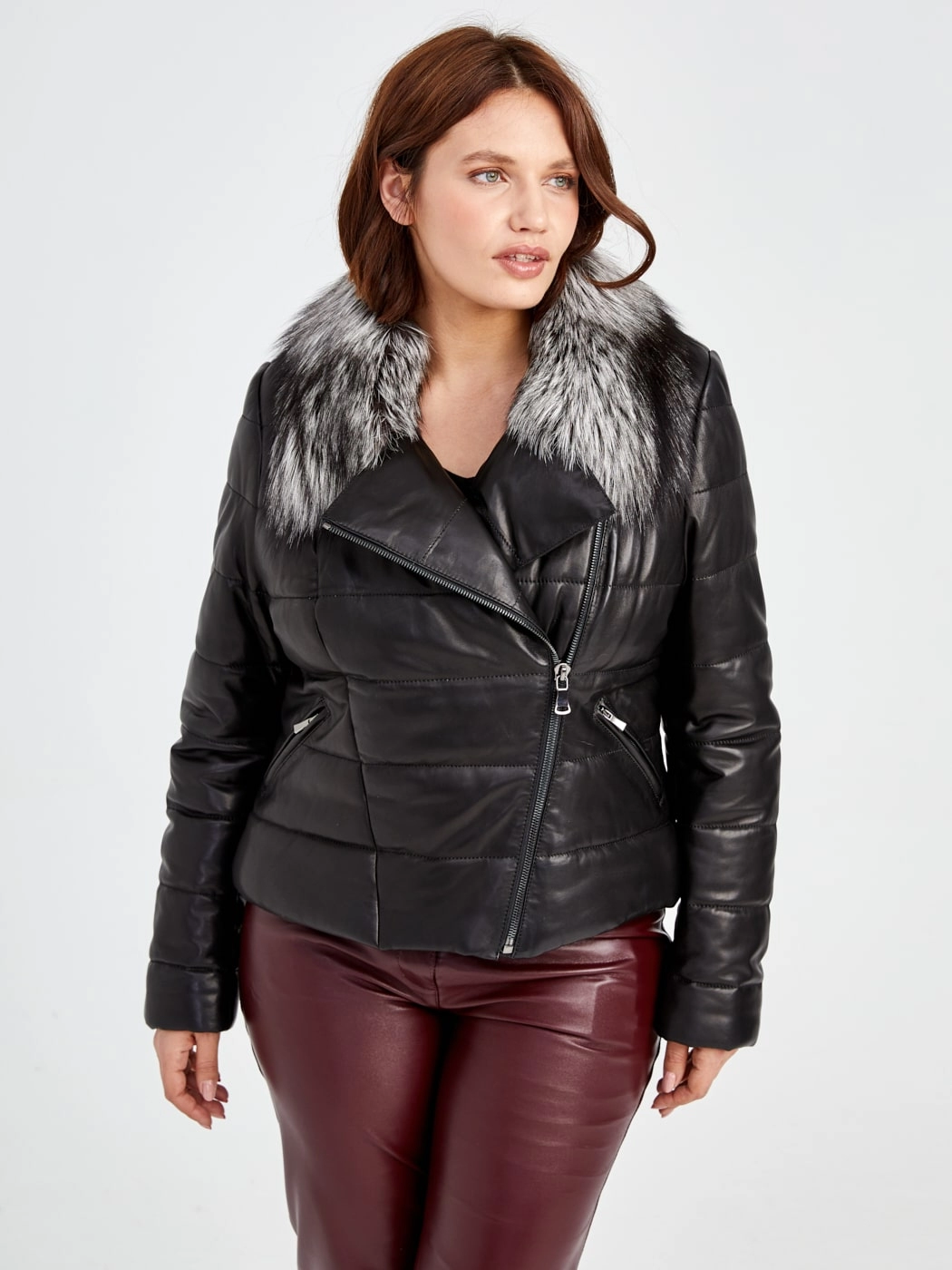 Современная утеплённая кожаная куртка-косуха. Кожаные детали скомбинированы с итальянской плащёвкой. Утеплитель синтепон. Воротник из меха серебристо-чёрной лисы. Карманы-листочки на молнии.