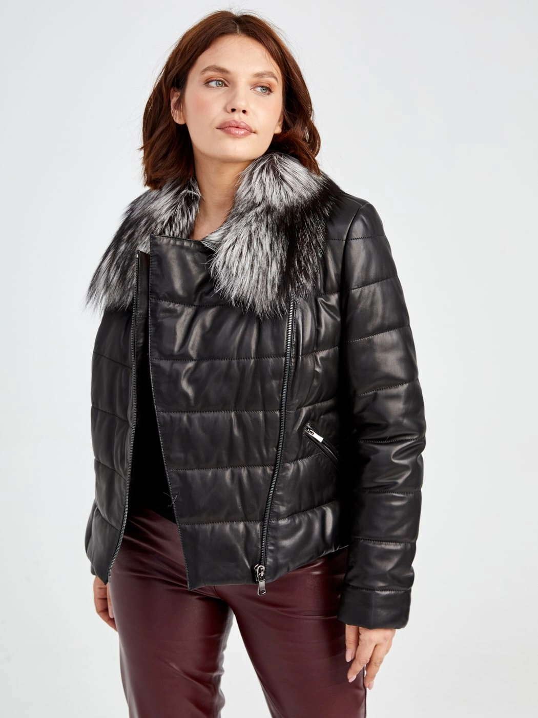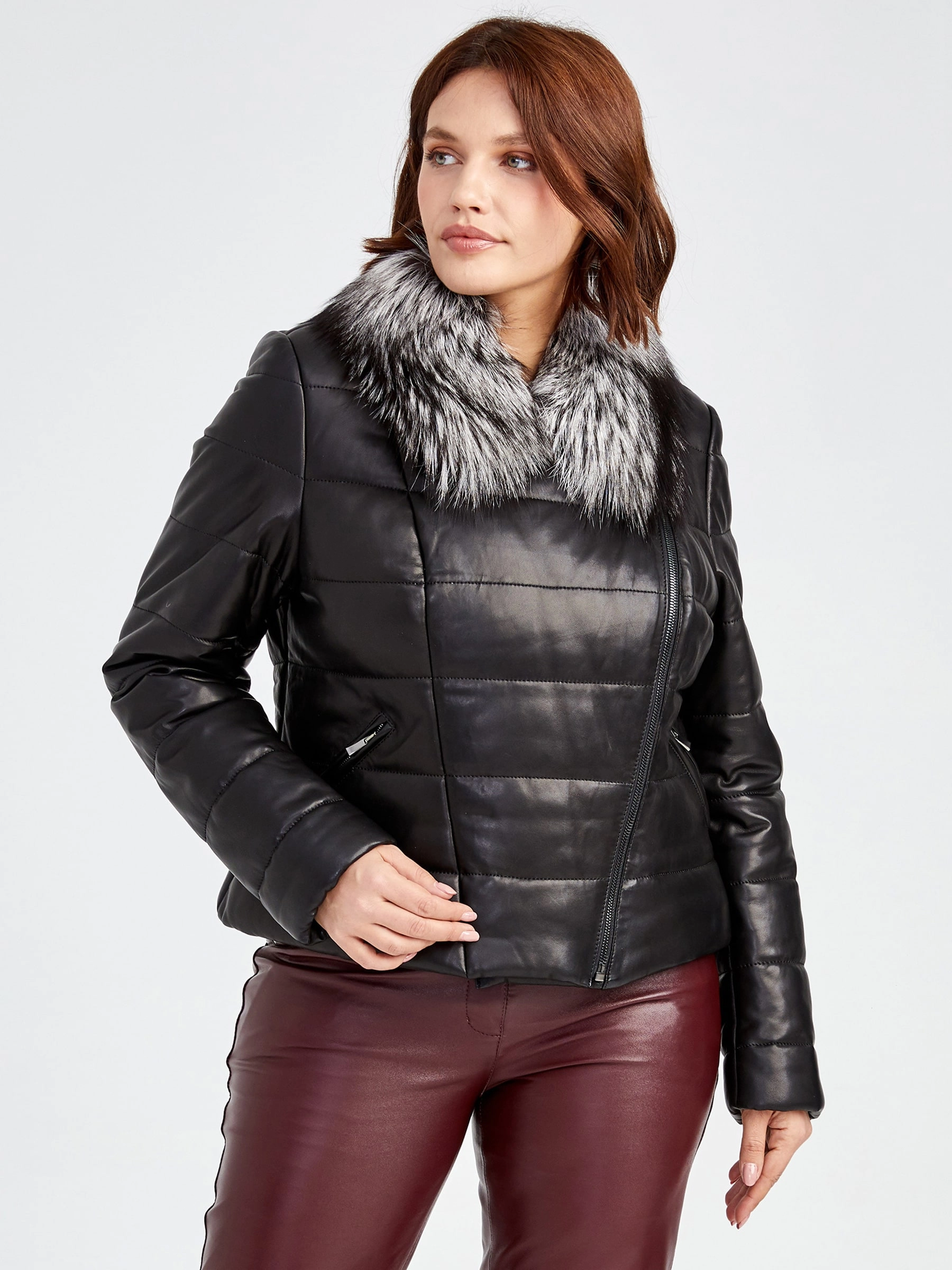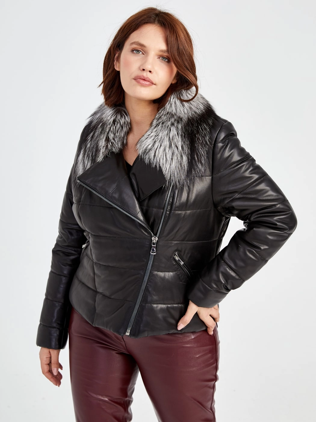 Кожаная утепленная женская косуха с мехом лисицы 706т, черная, размер 42, артикул 23740