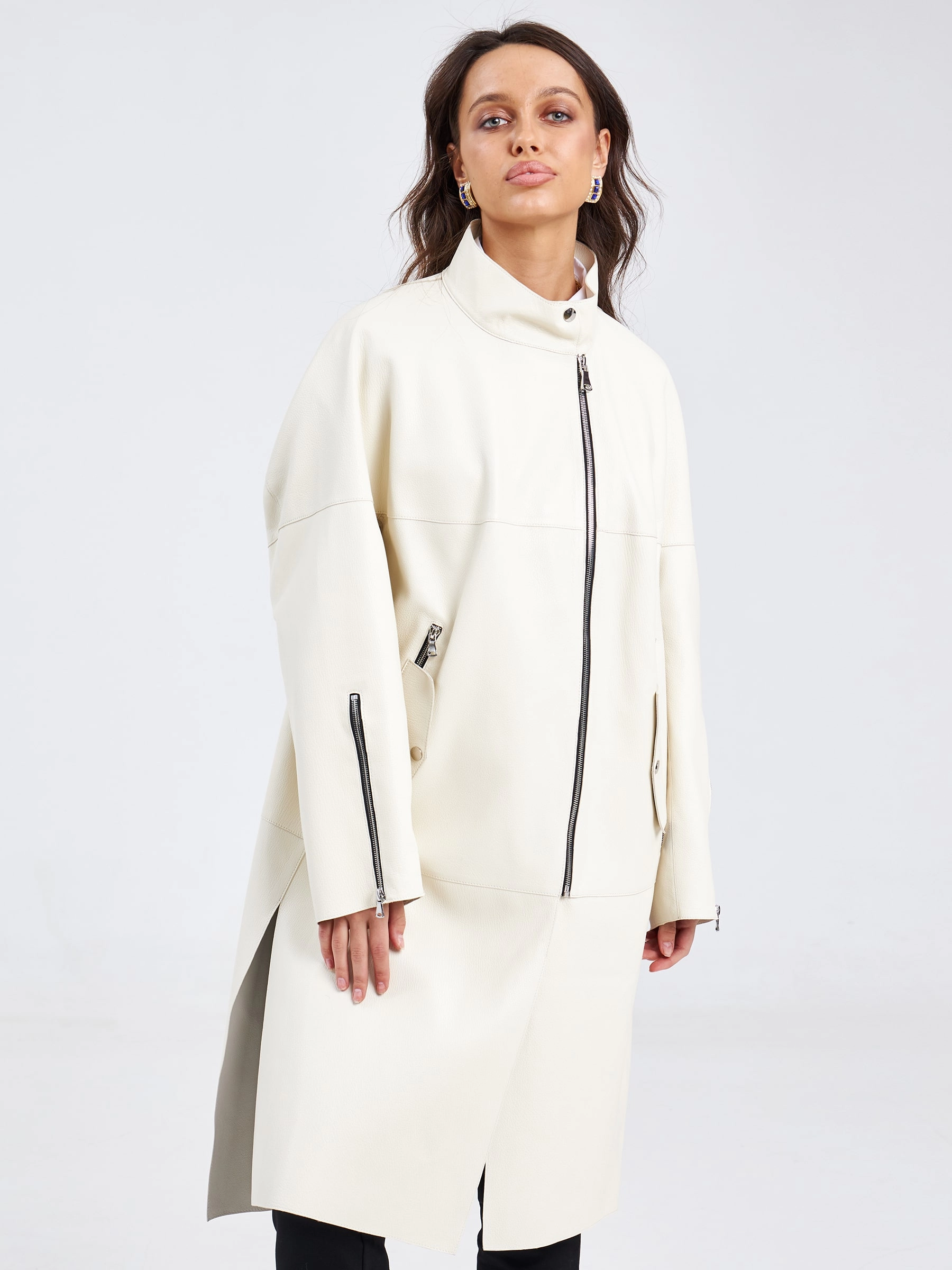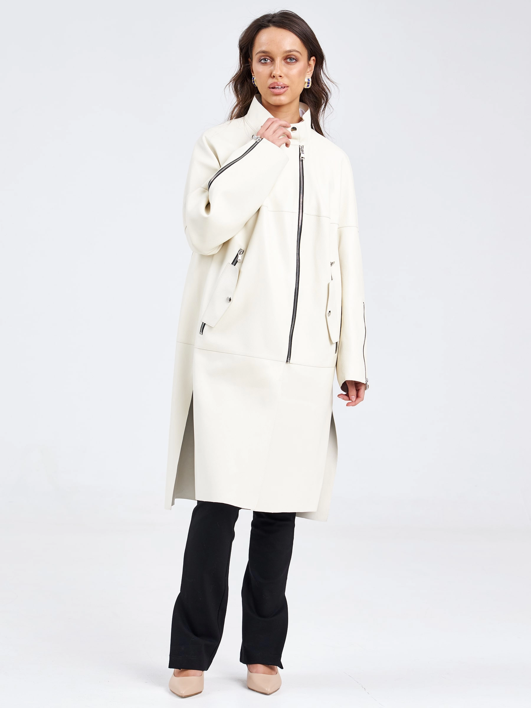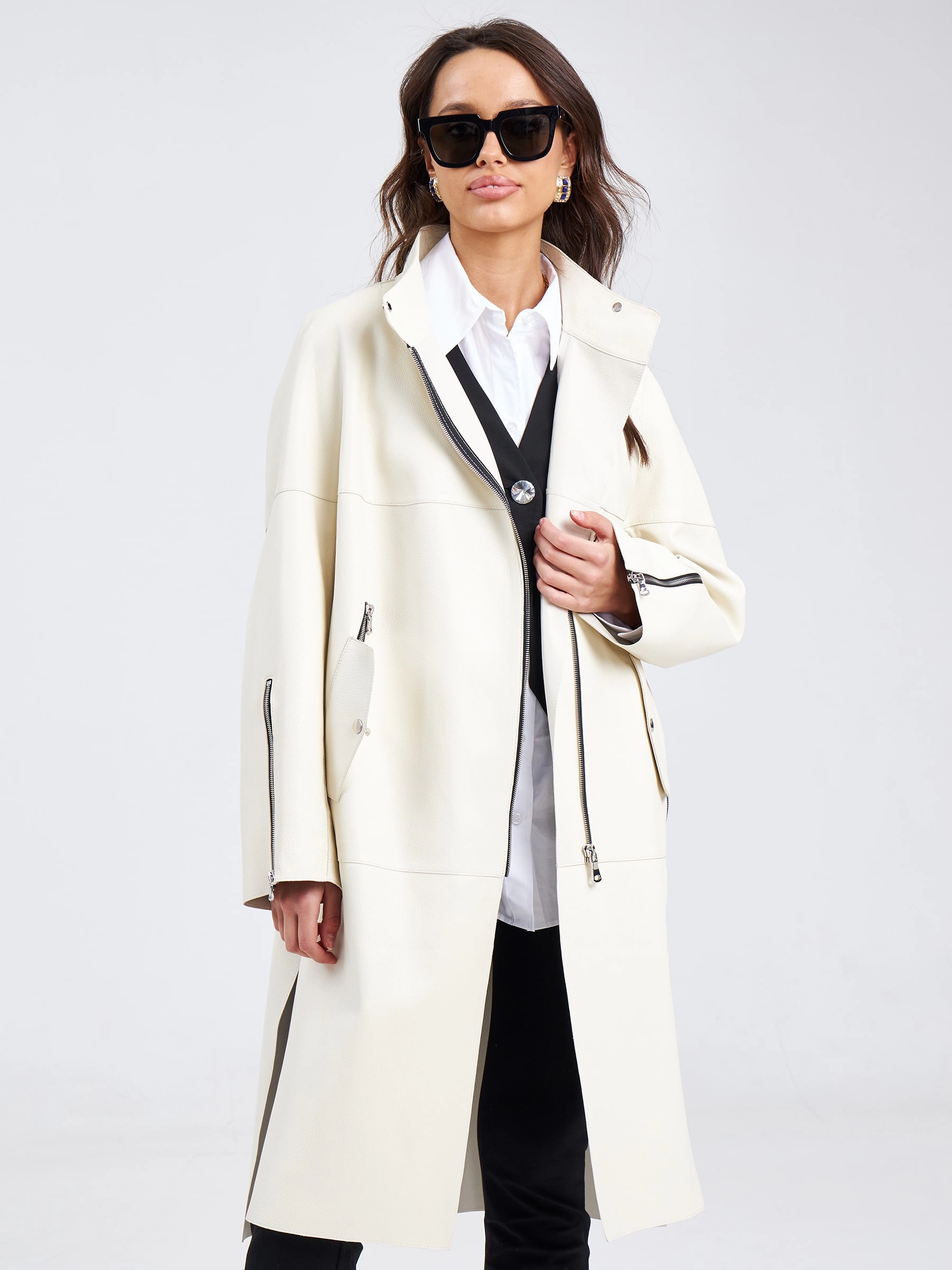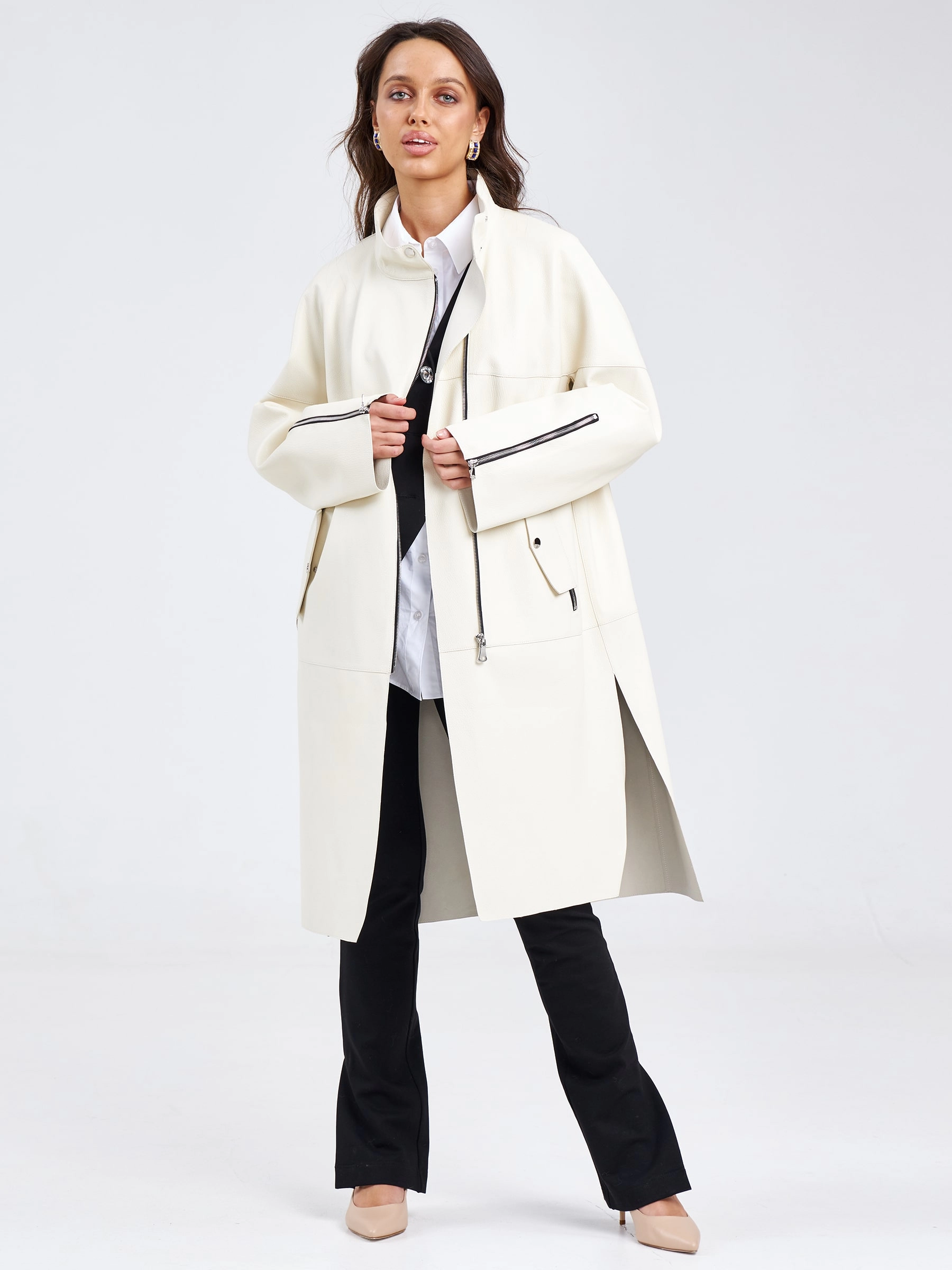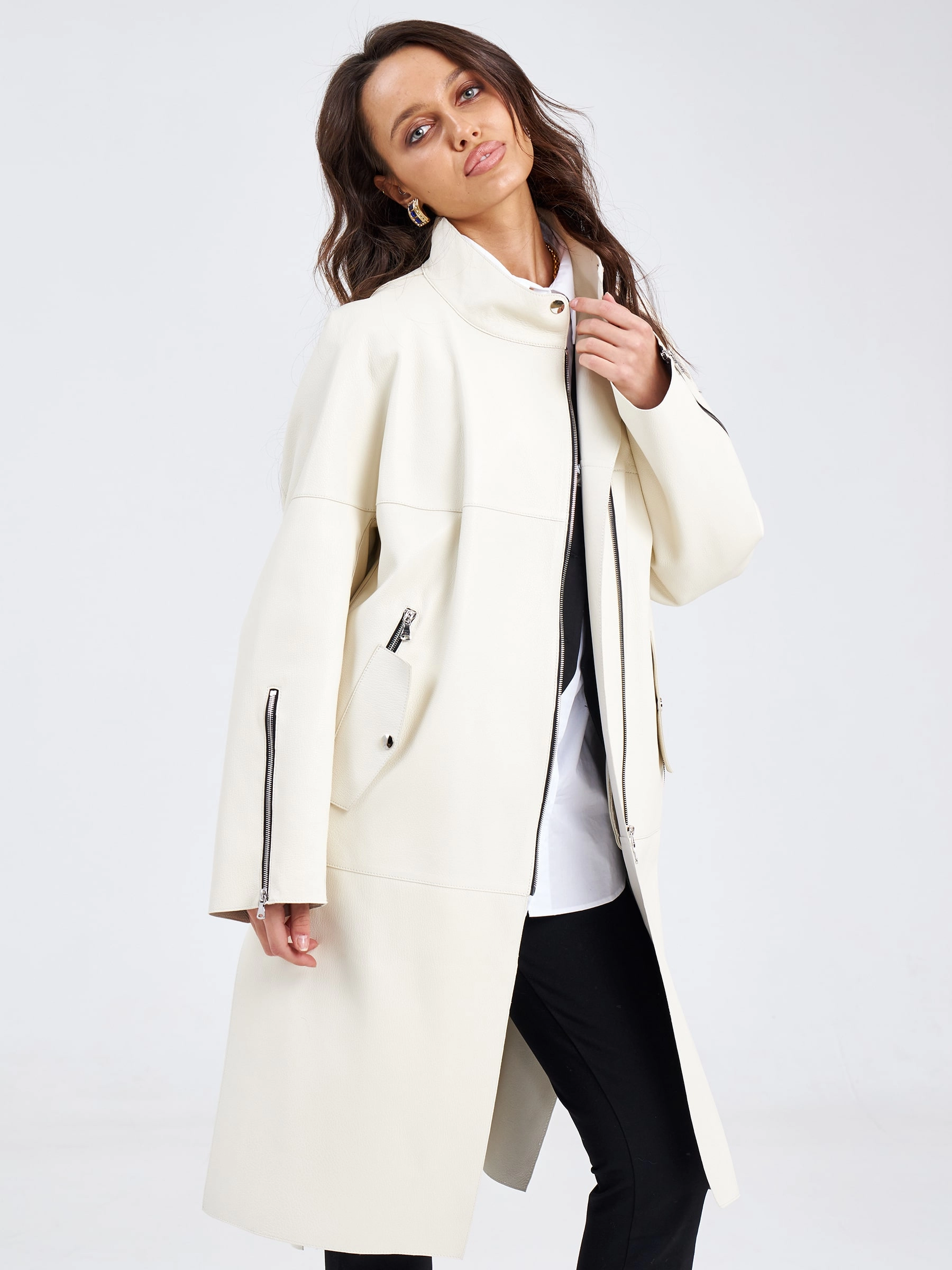 Товар модное женское кожаное пальто на молнии премиум класса 3041, белое, размер 48, артикул 63410 выполнен из натуральной кожи с застежкой молния. Рассчитан на сезон: весна-лето. Длина изделия 105 см, силуэт свободный.