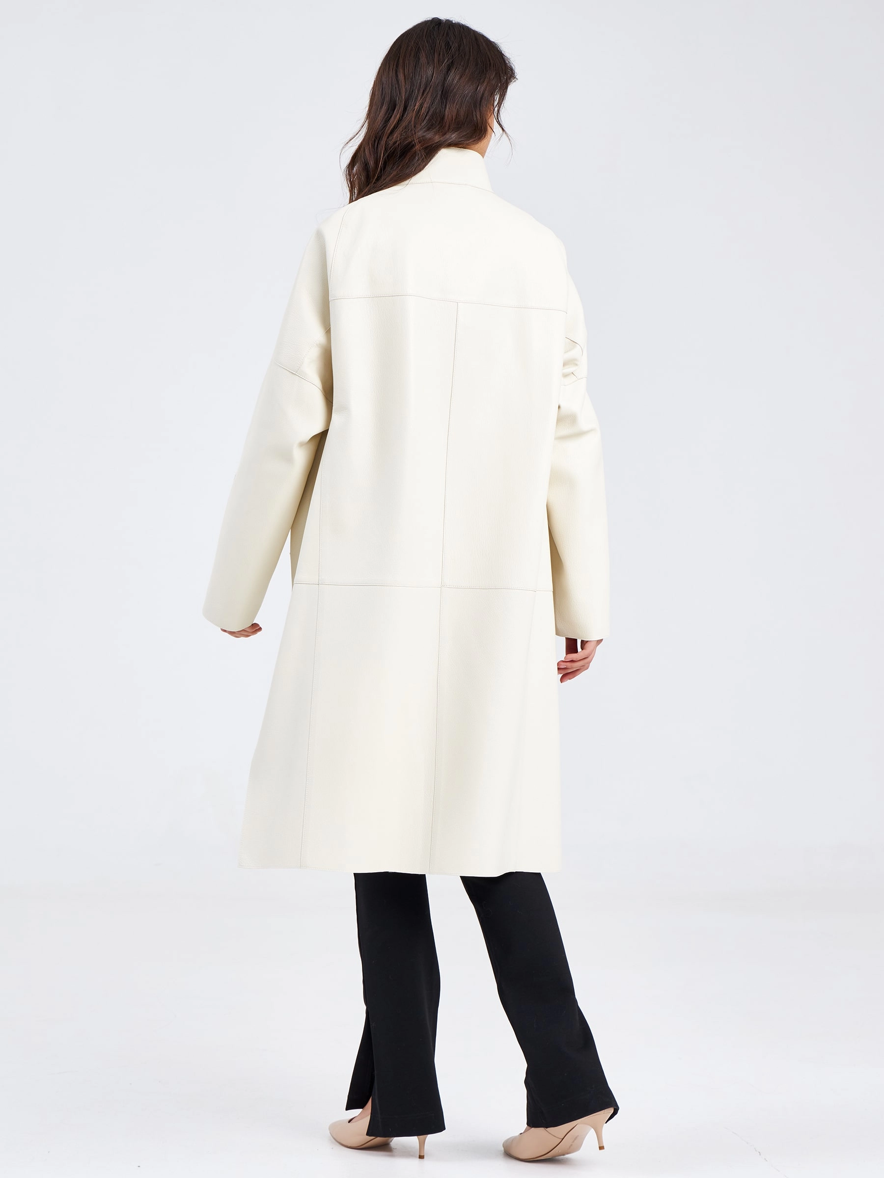 Это пальто из нежной натуральной кожи премиум-класса, с его аутентичной фактурой и благородным блеском, станет главным акцентом весенне-летнего гардероба. Модель длиной 105 см выполнена в свободном, воздушном крое со спущенным плечом и широкими рукавами, создавая элегантный, расслабленный и при этом невероятно стильный силуэт. Дизайн подчёркивают строгий воротник-стойка, выразительные глубокие разрезы по бокам для свободы движения, а также продуманные функциональные детали: центральная застёжка-молния, вместительные карманы с клапанами на кнопках и декоративные молнии на рукавах. Лёгкая, дышащая конструкция без подкладки и лишней отделки делает этот кожаный плащ идеальным выбором для тёплого сезона, предлагая защиту от ветра и лёгкую прохладу в один момент. Совет от стилиста: для создания эффектного городского образа наденьте плащ поверх однотонного платья-миди или комбинации облегающей водолазки с широкими кюлотами — такая игра пропорций подчеркнёт его архитектурный крой и добавит образу лёгкости и динамики.