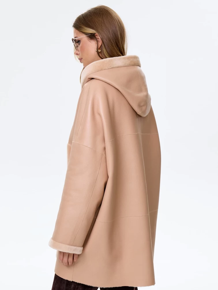 Товар молодежная комбинированная женская дубленка с капюшоном премиум класса 2056, бежевая, размер 48, артикул 64130 выполнен из овчина "мерино" с застежкой молния. Рассчитан на сезон: осень-зима. Длина изделия 81 см, силуэт свободный.