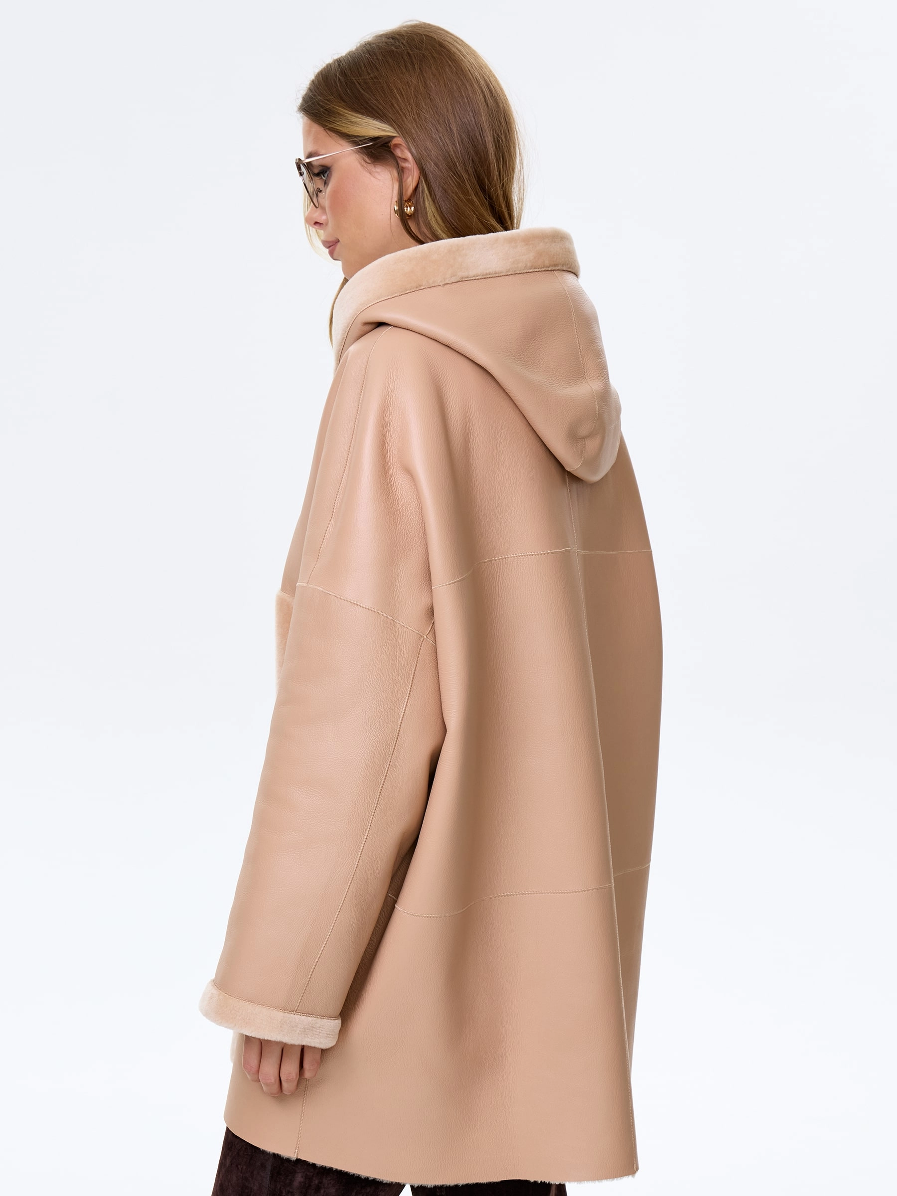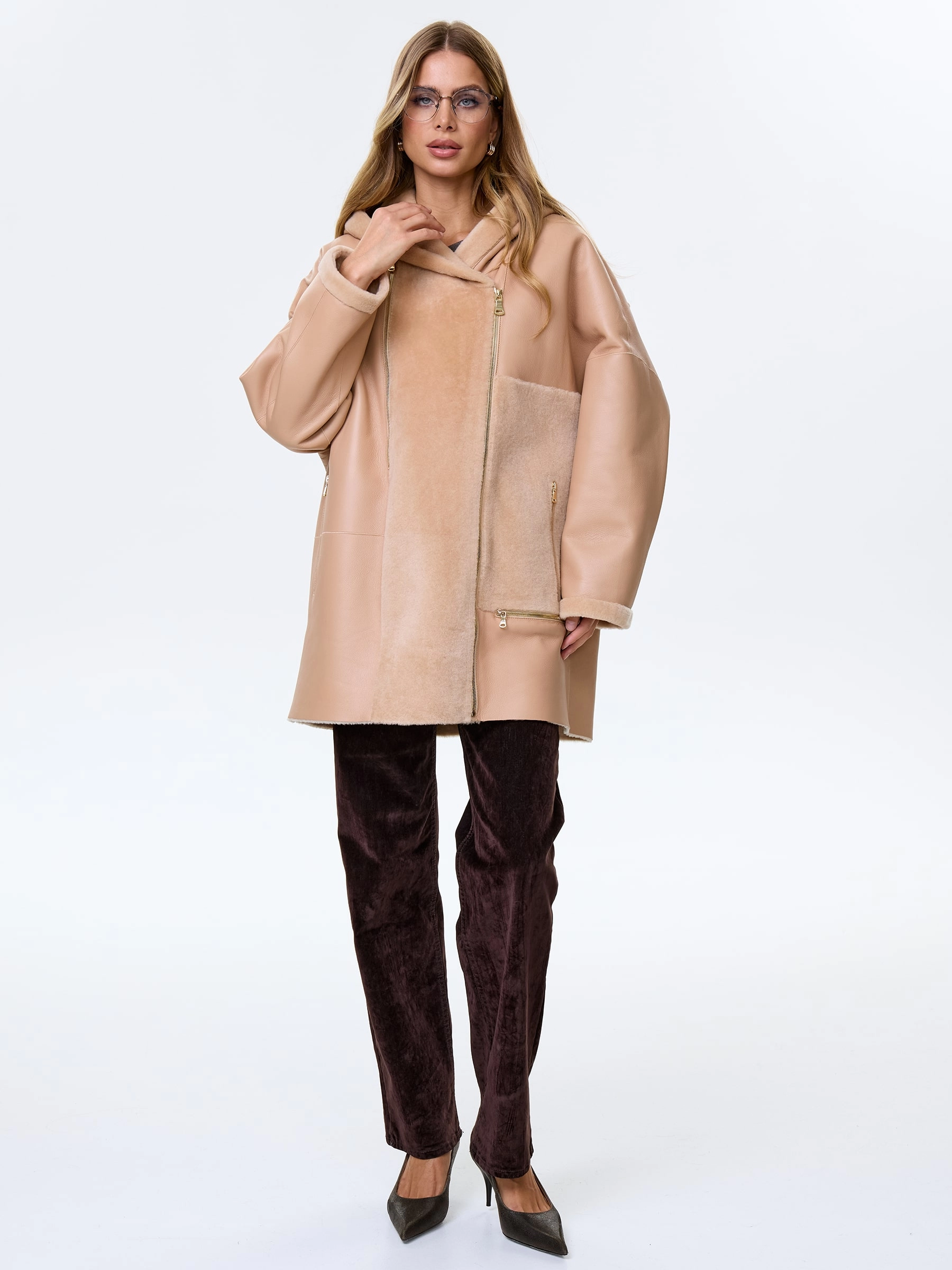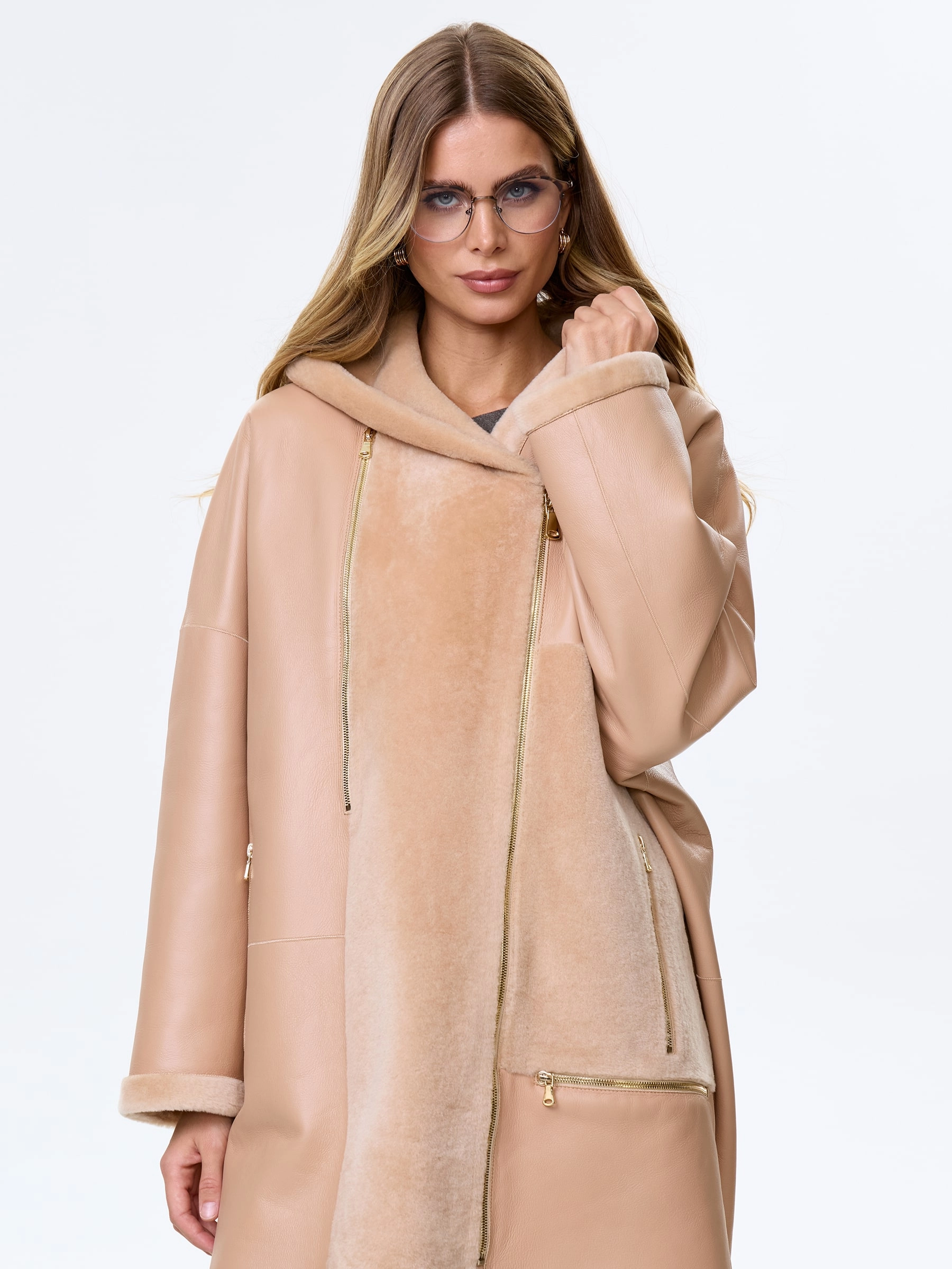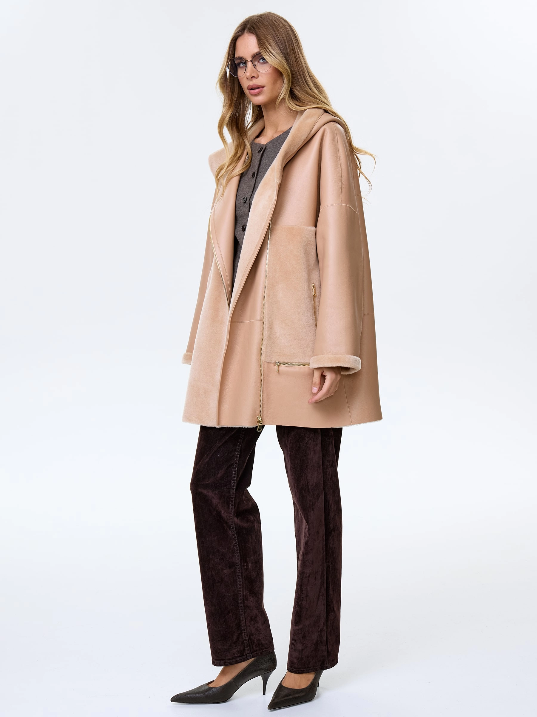 Товар молодежное полупальто из натуральной овчины для женщин с капюшоном премиум класса 2056, бежевое, размер 52, артикул 64350 выполнен из овчина "мерино" с застежкой молния. Рассчитан на сезон: осень-зима. Длина изделия 81 см, силуэт свободный.