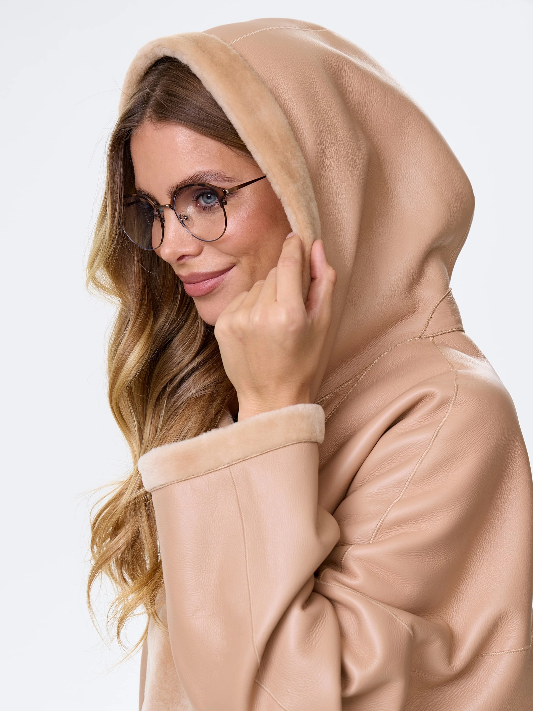 Молодежное полупальто из натуральной овчины для женщин с капюшоном премиум класса 2056, бежевое, размер 52, артикул 64350