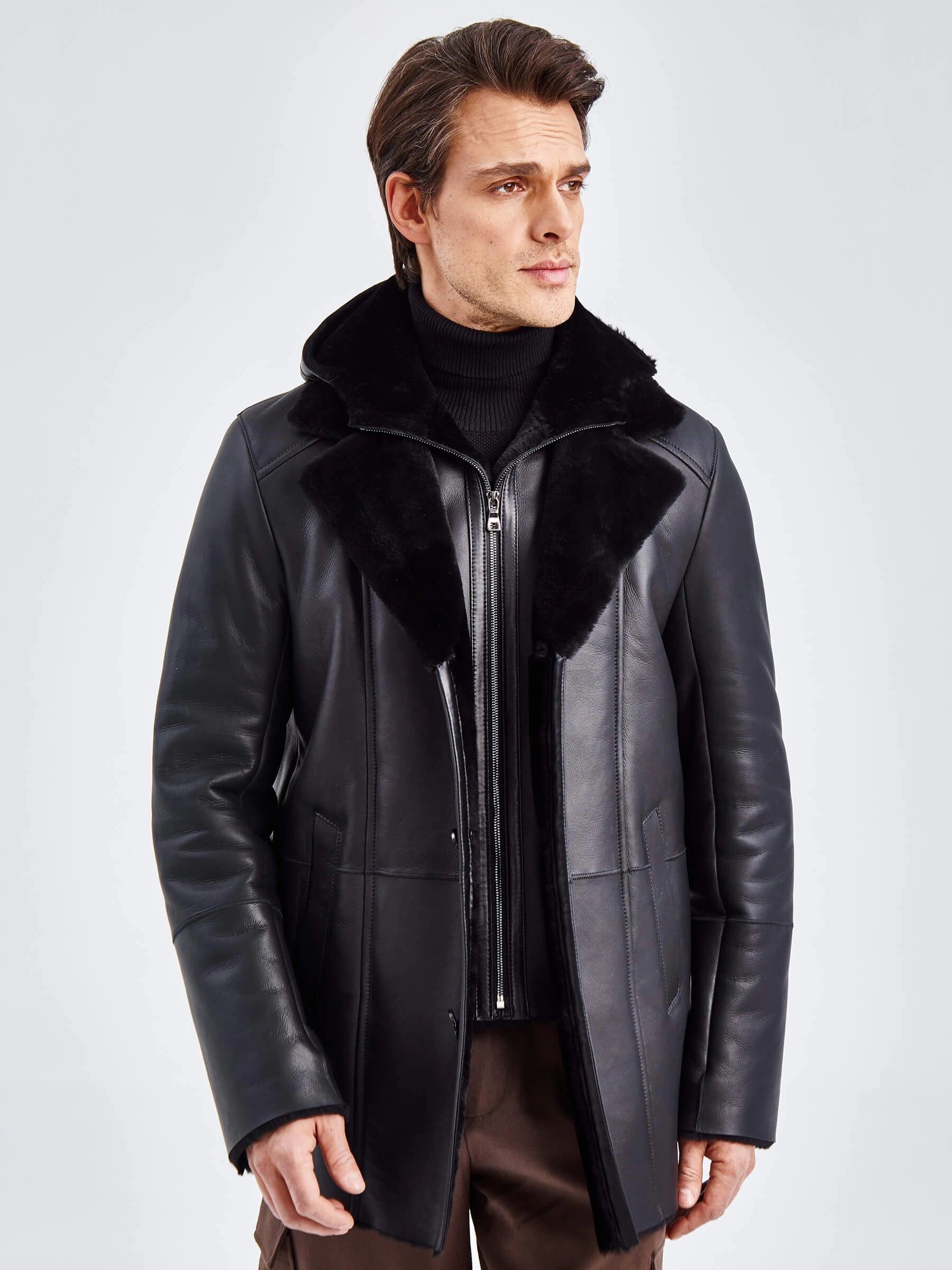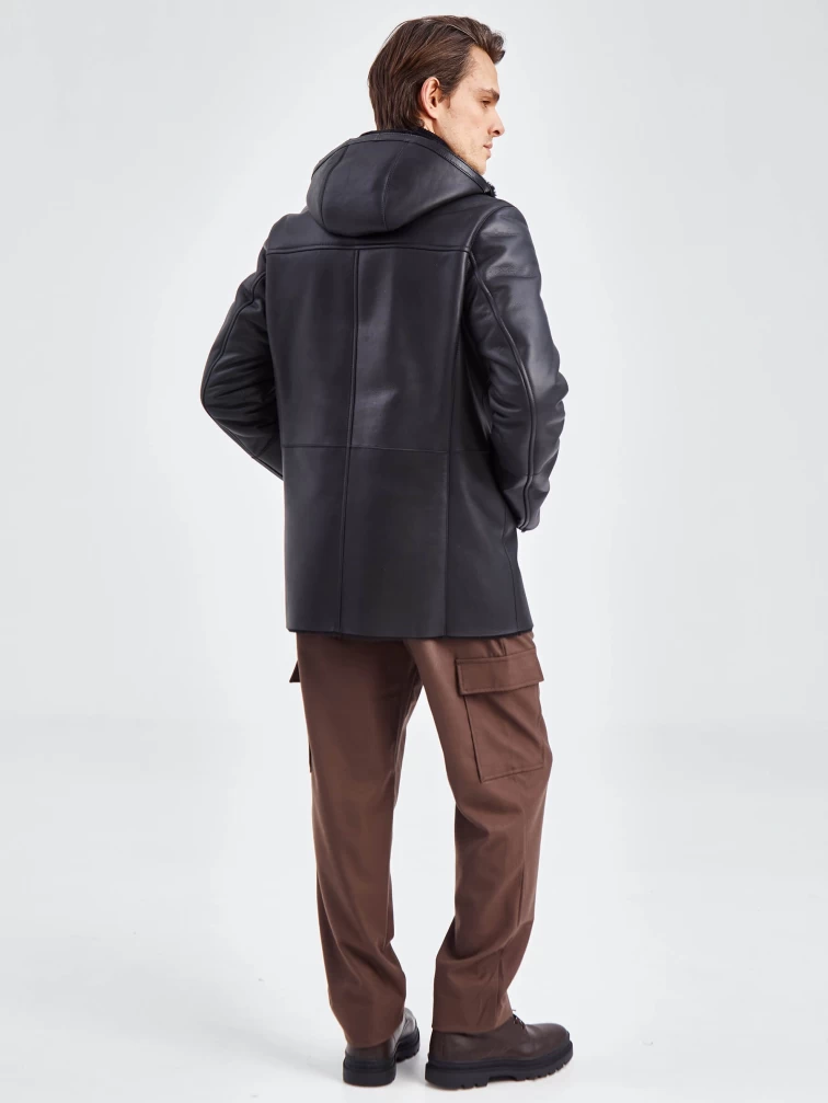Мужская классическая дубленка премиум класса со съемным капюшоном 436, черная, размер 48, артикул 71450