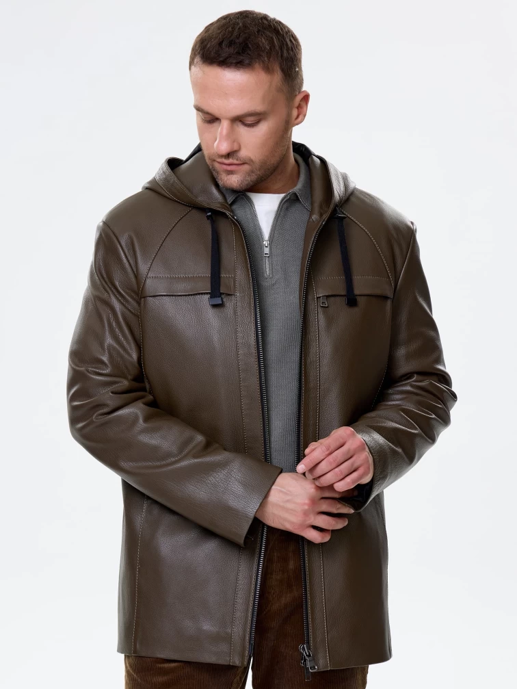 Товар мужская кожаная куртка с капюшоном премиум класса 552, хаки, размер 48, артикул 41130 выполнен из натуральной кожи с застежкой молния. Рассчитан на сезон: демисезон. Длина изделия 80 см, силуэт прямой.