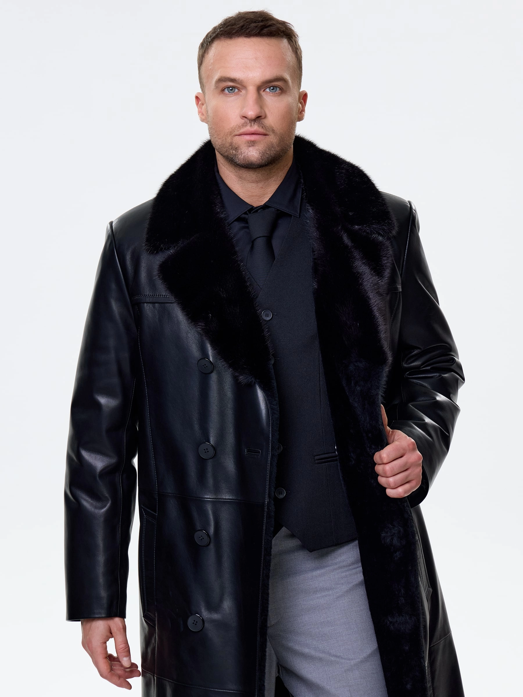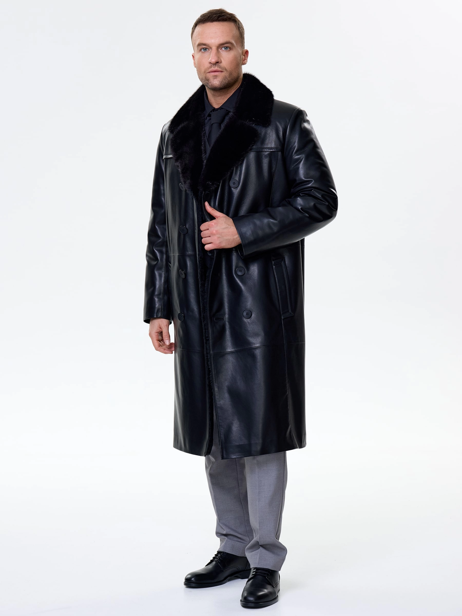 Товар мужское зимнее кожаное пальто с норковым воротником премиум класса 563мех, черное, размер 48, артикул 41110 выполнен из натуральной кожи с застежкой пуговицы. Рассчитан на сезон: осень-зима. Длина изделия 115 см, силуэт прямой.