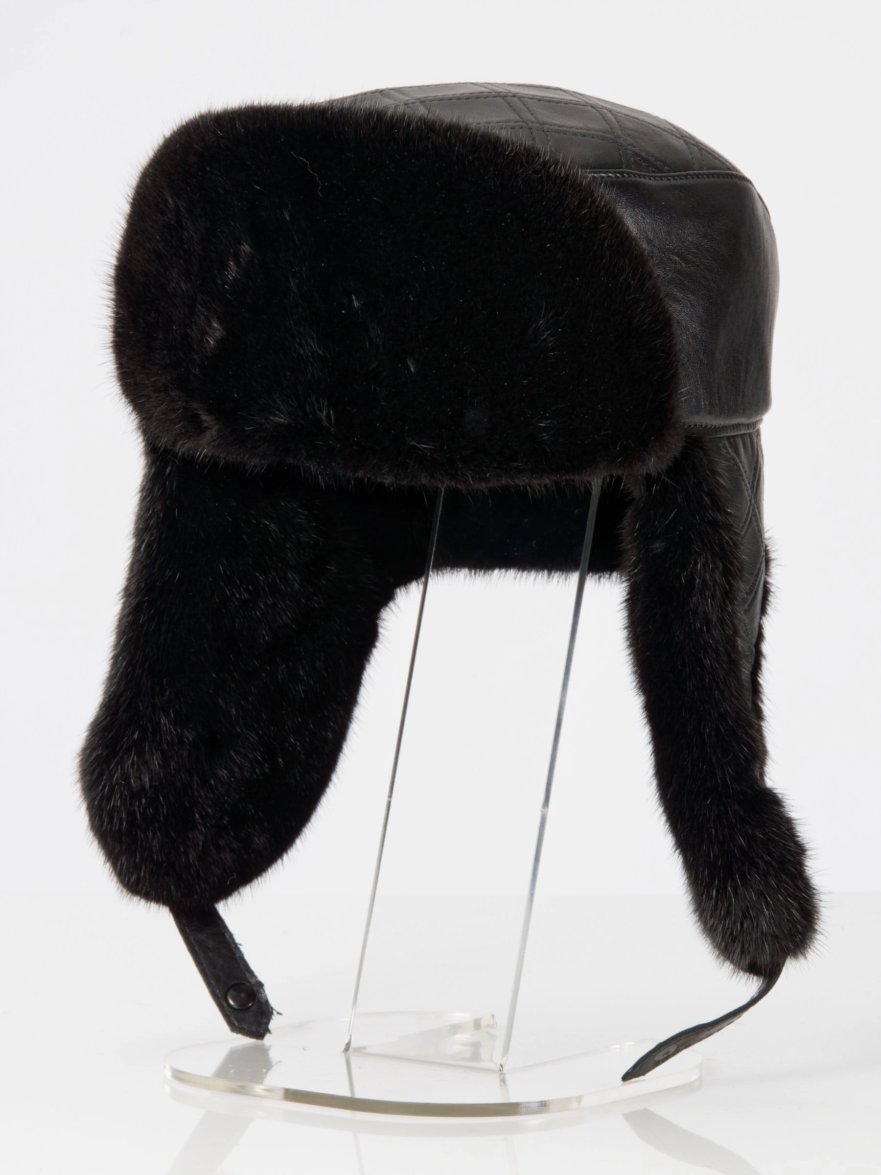 Классическая шапка-ушанка- эту модель мастера выполнили из мягкой черной кожи в сочетании с густым коротковорсовым мехом норки- аксессуар получился необыкновенно теплым и приятным на ощупь. Меховые ушки можно легко застегнуть под подбородком для максимальной защиты от мороза или сзади с помощью двух кнопок на узких ремешках, размер головного убора удобно регулировать скрытой кулисой.