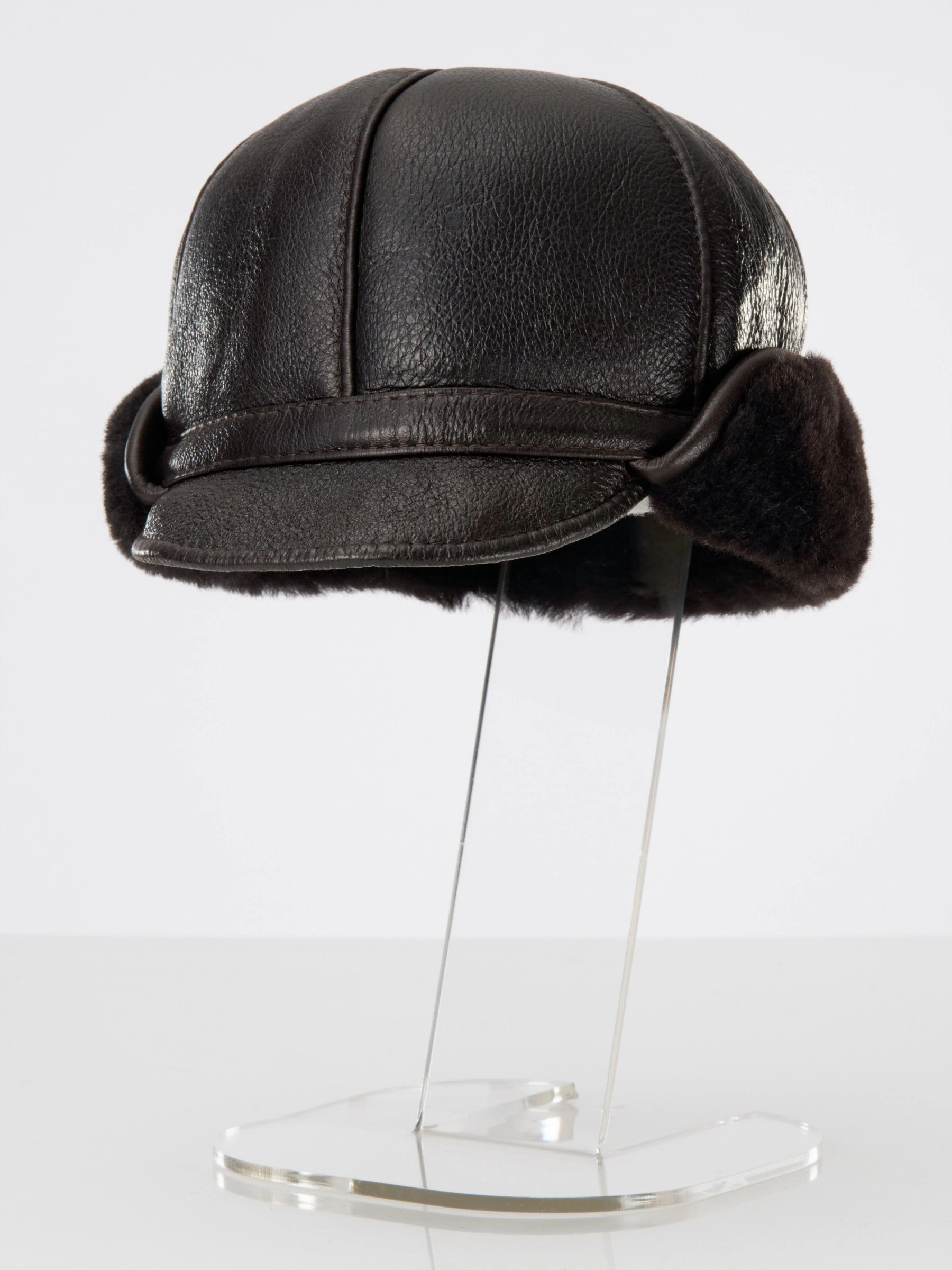 Мужской головной убор выполнен из меха натуральной овчины. Все тыльные части , козырек и тулья выполнены из натуральной мягкой дубленочной кожи. Модель имеет ветрозащитный меховой отворот, который фиксируется кнопками.