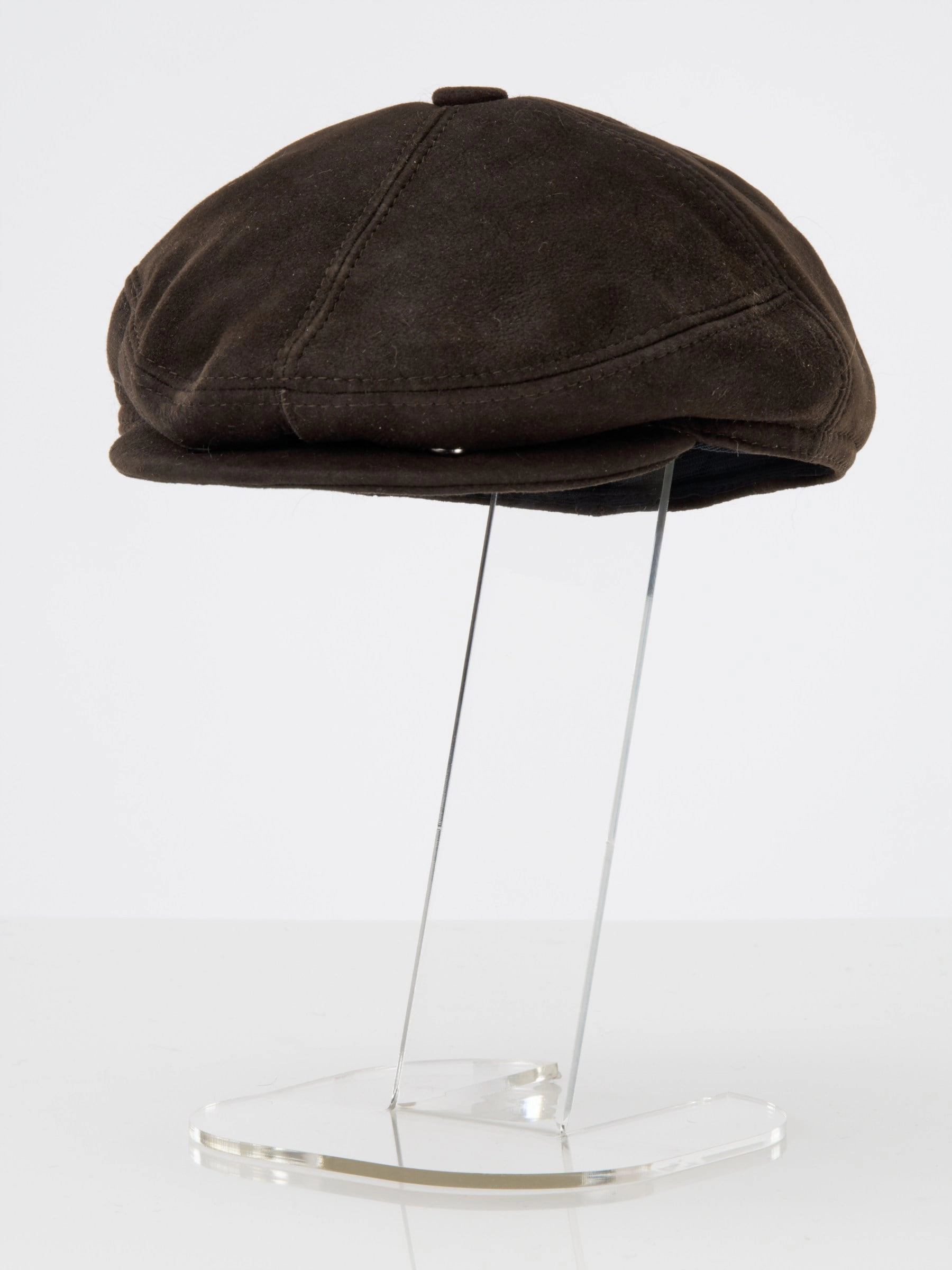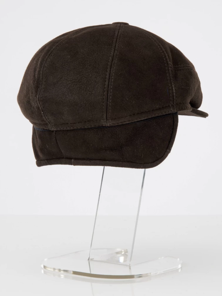 Коричневую кепку-выполнили из натуральной замши. Удобная посадка, небольшой козырек фиксируется кнопками, а в качестве подкладки использовали натуральную овчину. Кепка получилась очень легкой и комфортной. Для использования в холодную погоду предусмотрен ветрозащитный отворот.