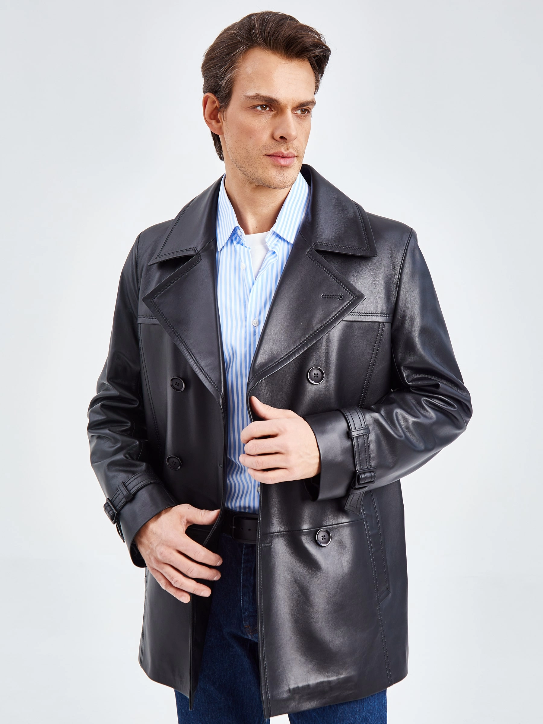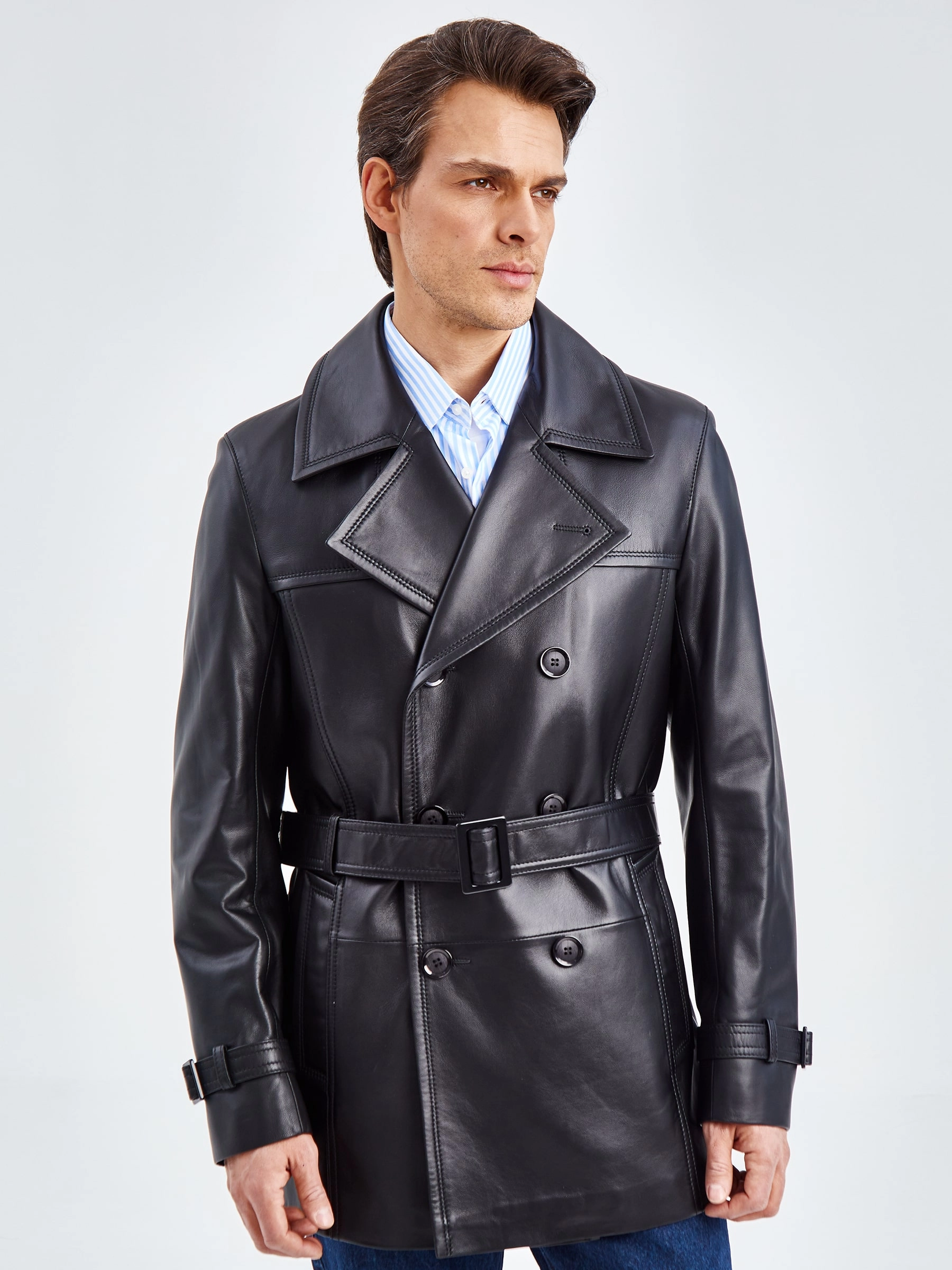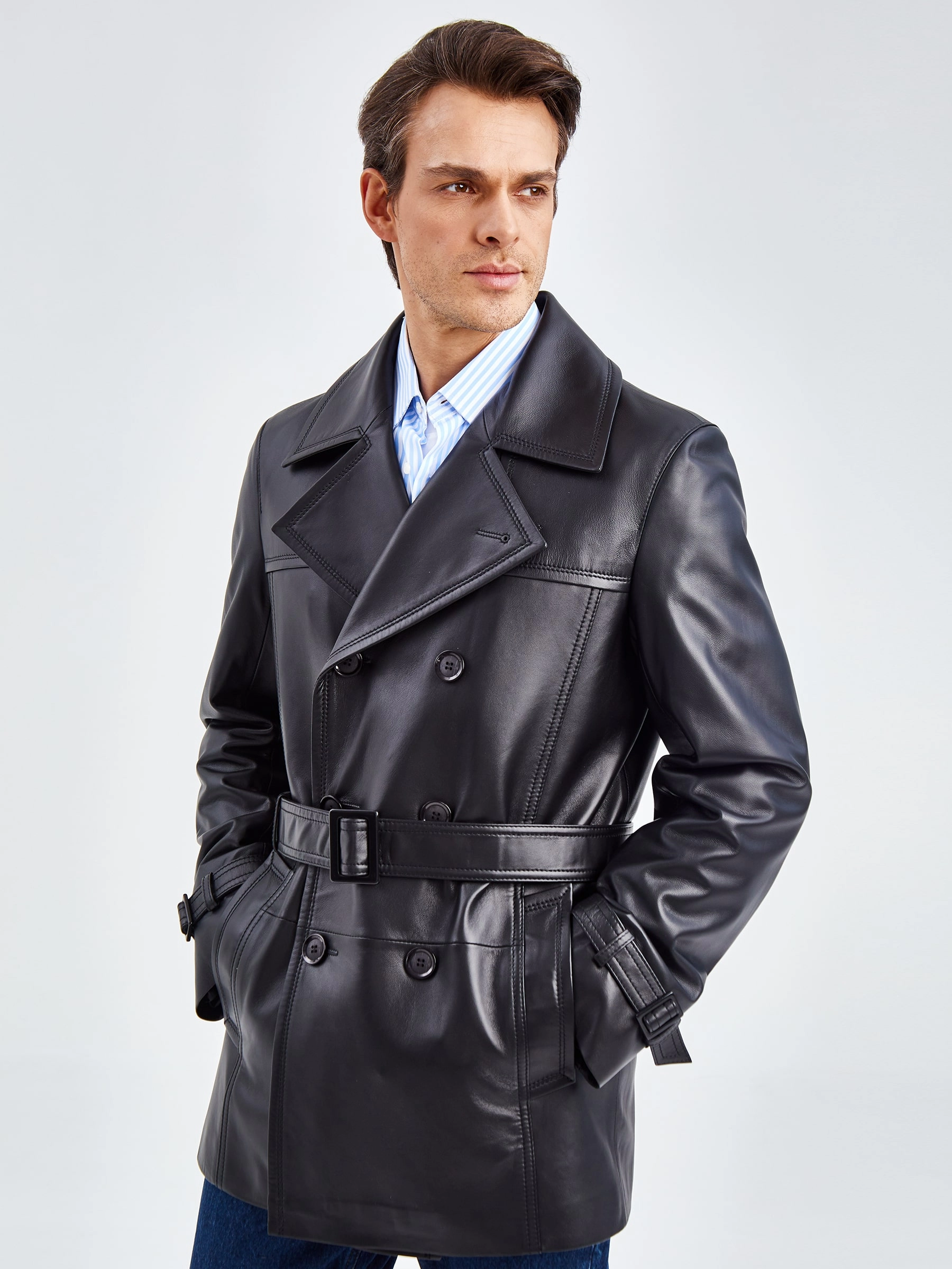 Двубортный бушлат прямого кроя с широкими лацканами и двумя врезными карманами -это стиль уверенных в себе мужчин. Для пошива изделия выбрали мягкую гладкую кожу премиального качества. Благодаря классическому крою, модель идеально подружится как со строгим деловым костюмом, так и со свободной одеждой. Посадку по талии можно регулировать поясом с пряжкой.