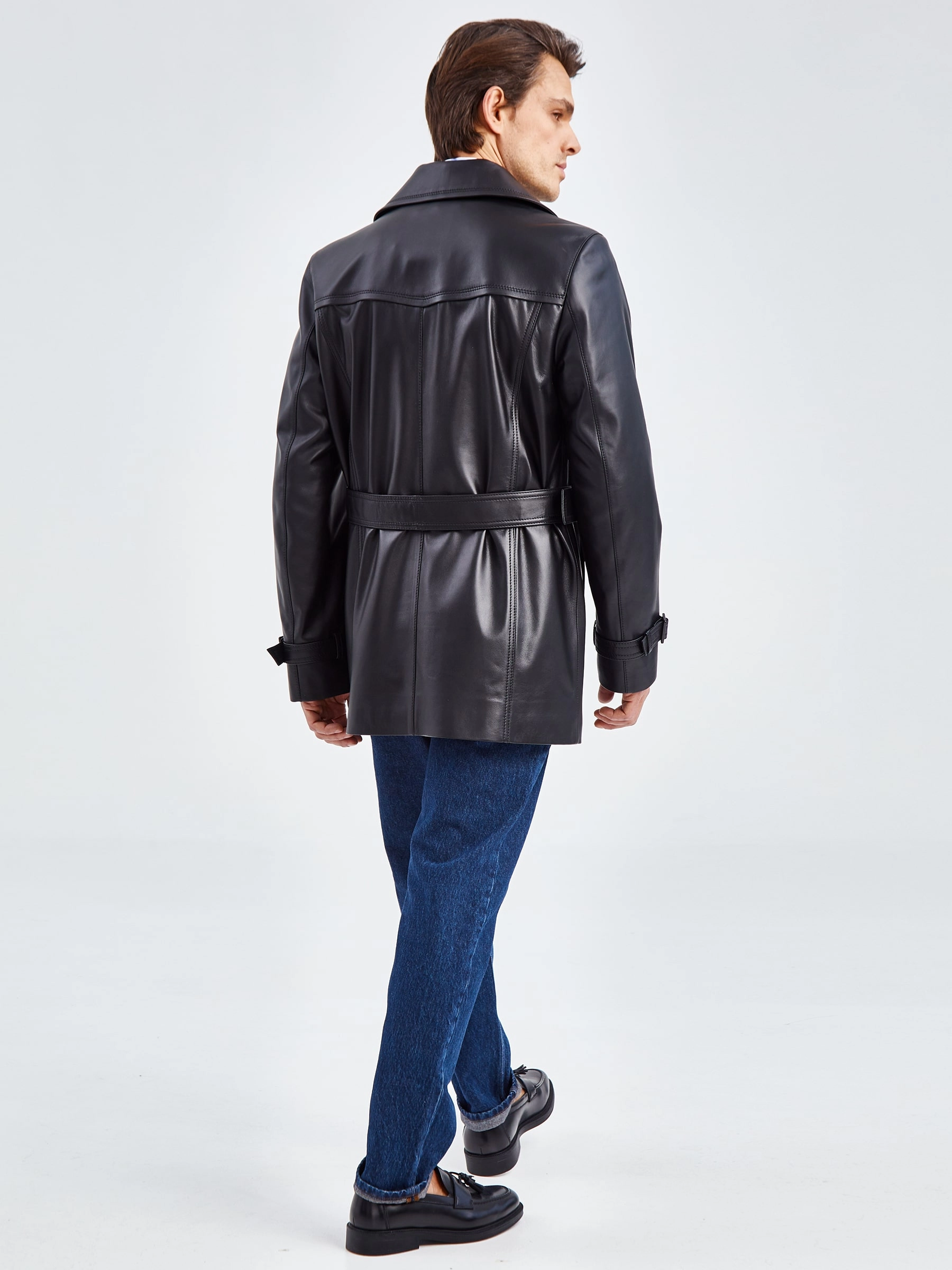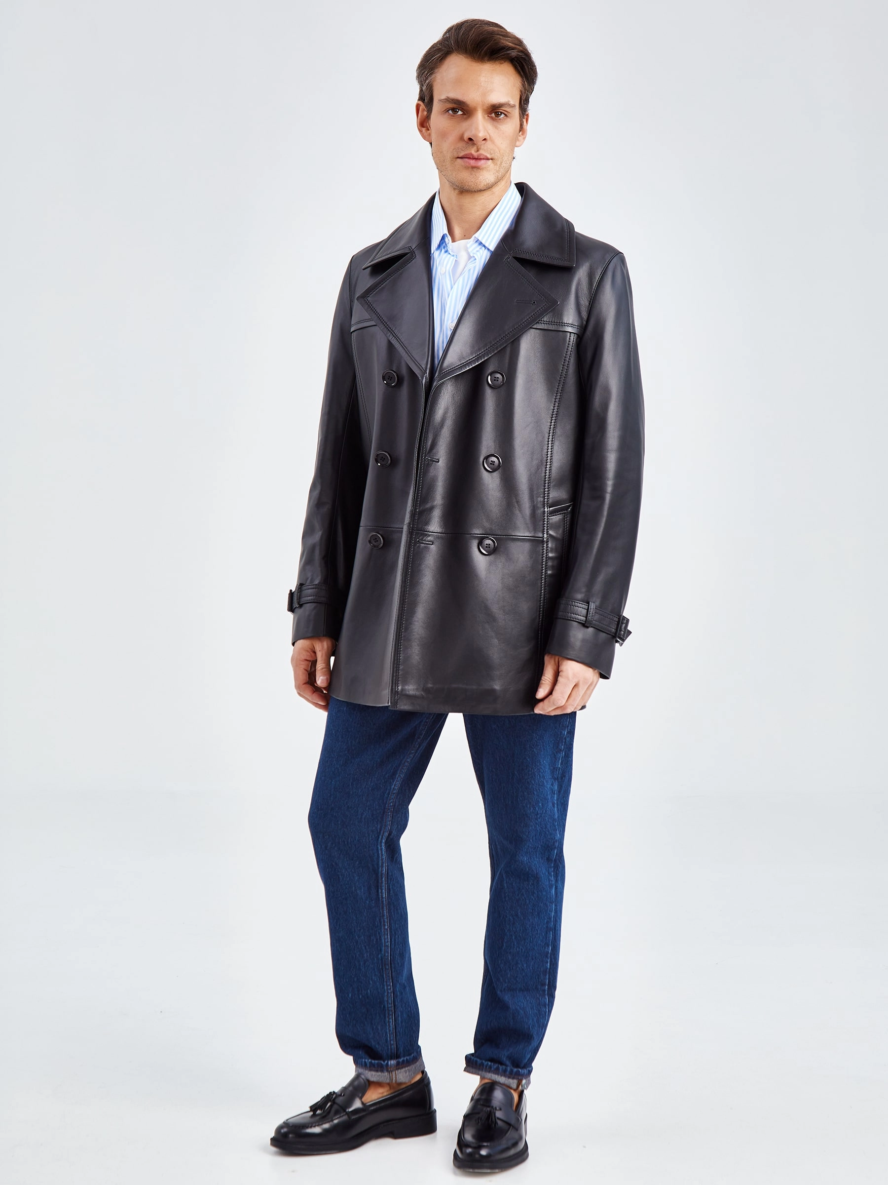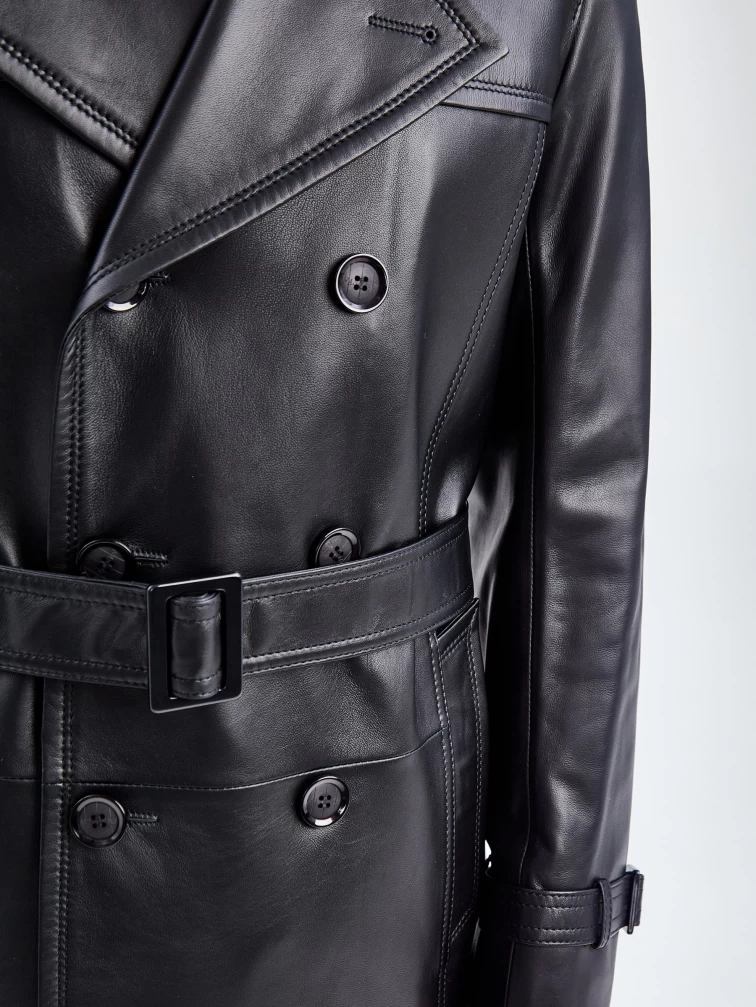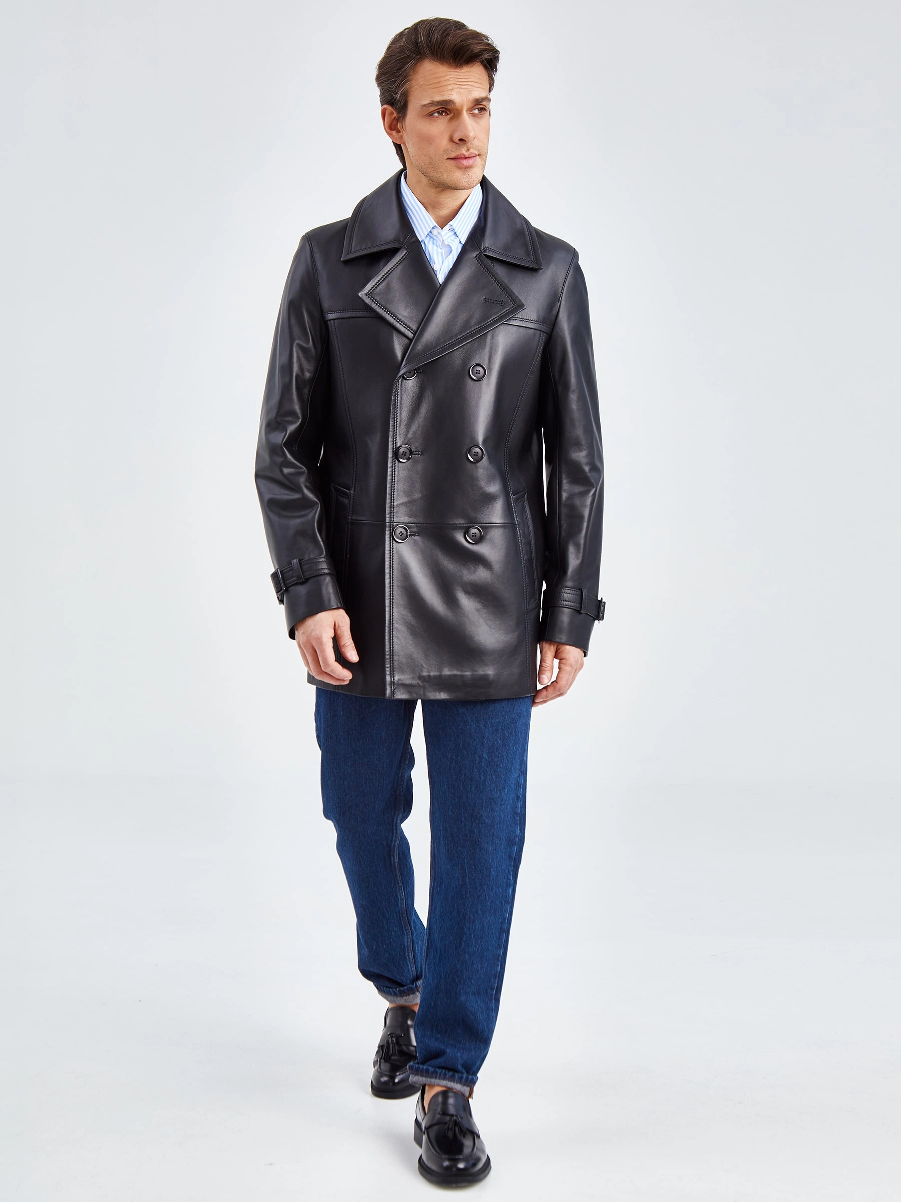 Двубортный бушлат прямого кроя с широкими лацканами и двумя врезными карманами -это стиль уверенных в себе мужчин. Для пошива изделия выбрали мягкую гладкую кожу премиального качества. Благодаря классическому крою, модель идеально подружится как со строгим деловым костюмом, так и со свободной одеждой. Посадку по талии можно регулировать поясом с пряжкой.
