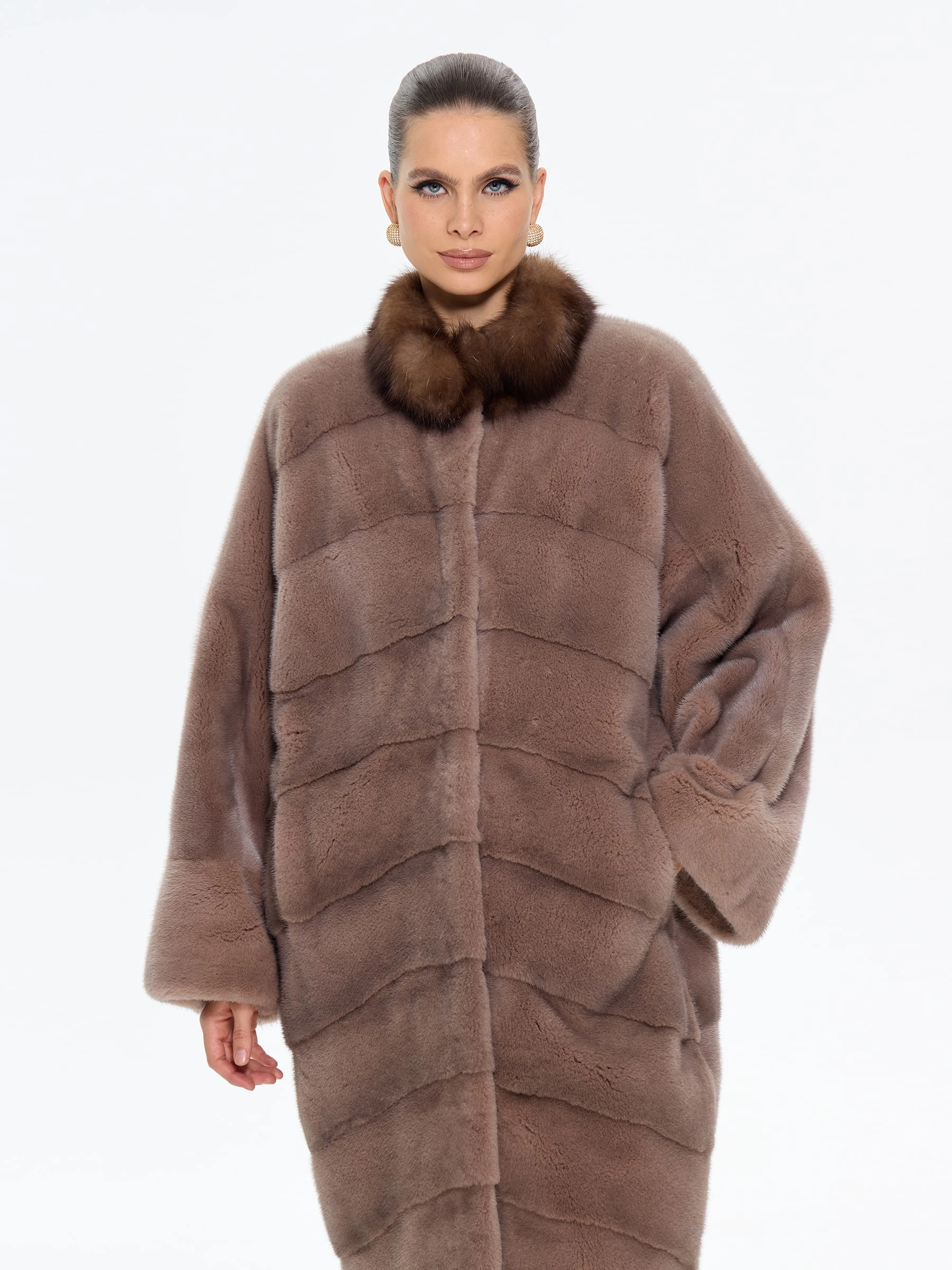 Роскошная длинная шуба из меха норки премиум-класса в шоколадном оттенке "какао" с элегантной стойкой, отделанной мехом соболя. Модель прямого силуэта длиной 110 см с диагональной раскладкой меха и свободным рукавом кимоно подчеркивает аристократическую элегантность и неповторимый шарм. Стилисты рекомендуют носить эту шубу с кожаными сапогами-челси и узкими брюками для повседневного образа или с платьем-футляром и жемчужными серьгами для вечернего выхода. Идеальное сочетание вечной классики и современной роскоши для истинных ценительниц утонченного стиля.