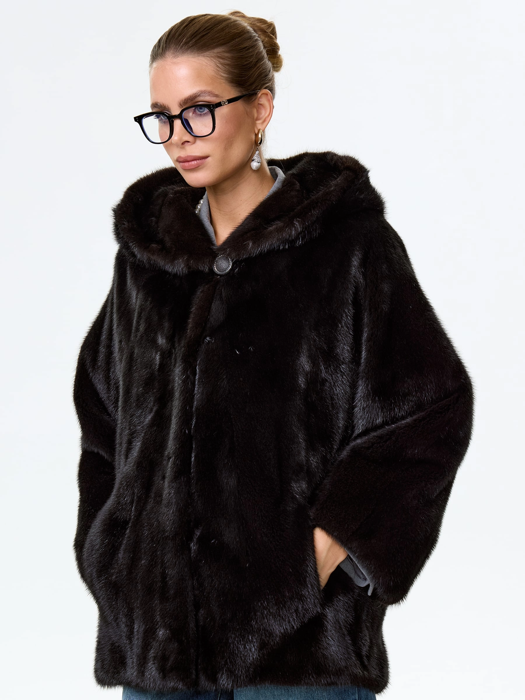 Лаконичная норковая шуба с двумя боковыми карманами и шалевидным капюшоном. Прямой крой, великолепная посадка по фигуре, застежка-клипсы. Изделие хорошо сочетается с повседневным и строгим гардеробом.