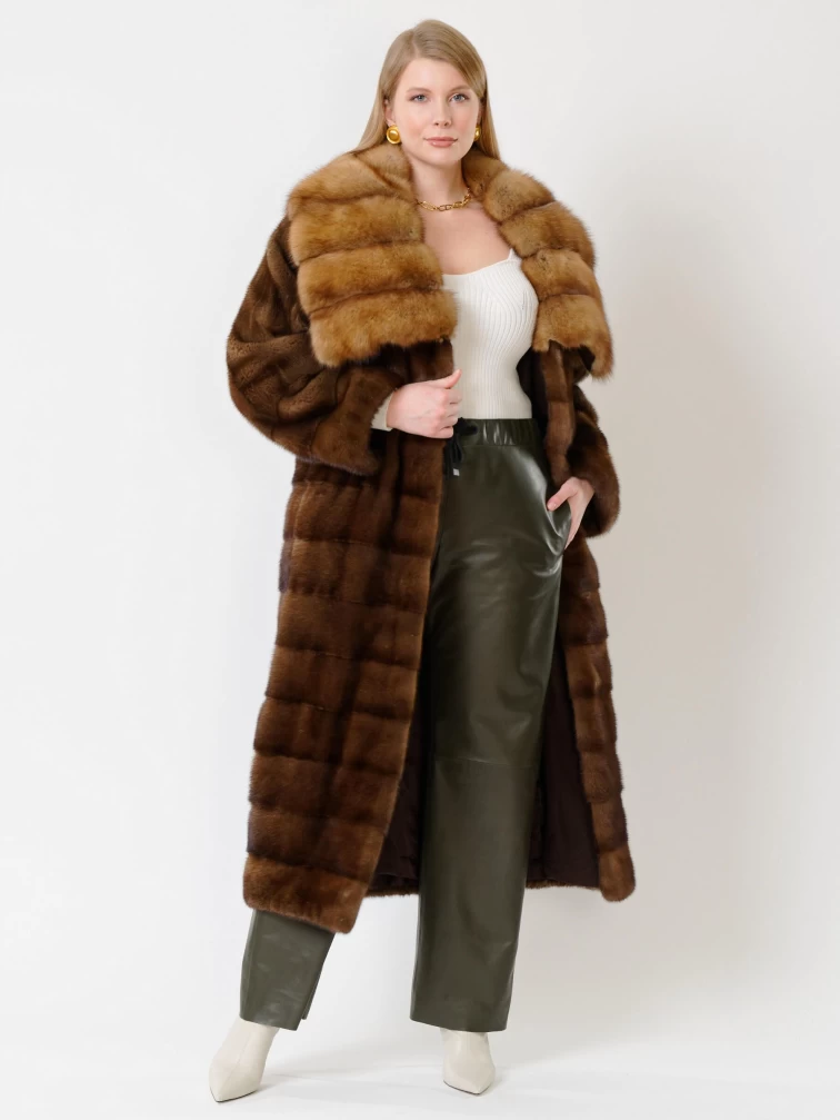 Товар женская норковая шуба с воротником меха соболя 1150(вс), пастельная, размер 44, артикул 33400 выполнен из норка крашенной с застежкой клипсы. Рассчитан на сезон: осень-зима. Длина изделия свыше 90 см, силуэт прямой.