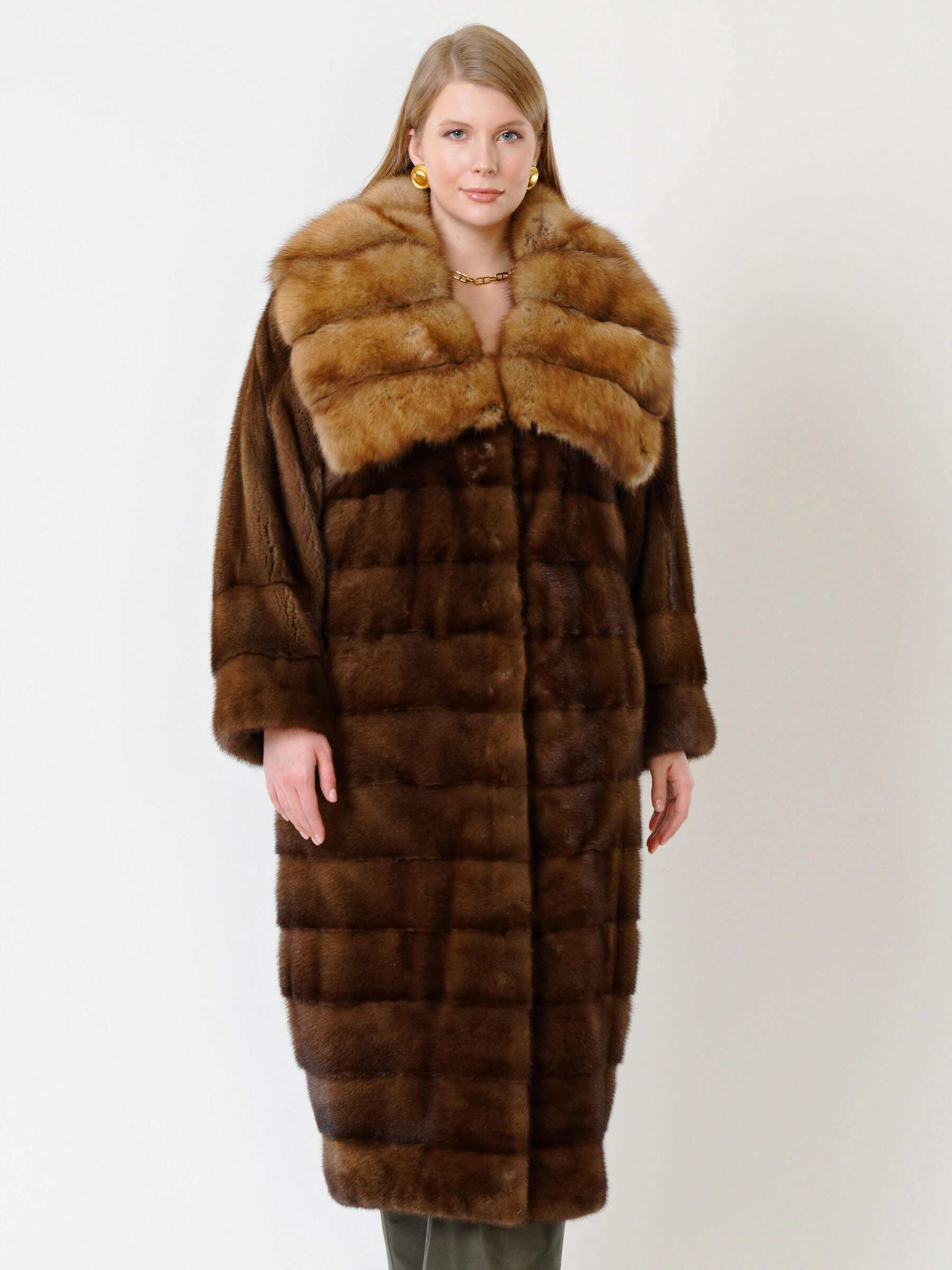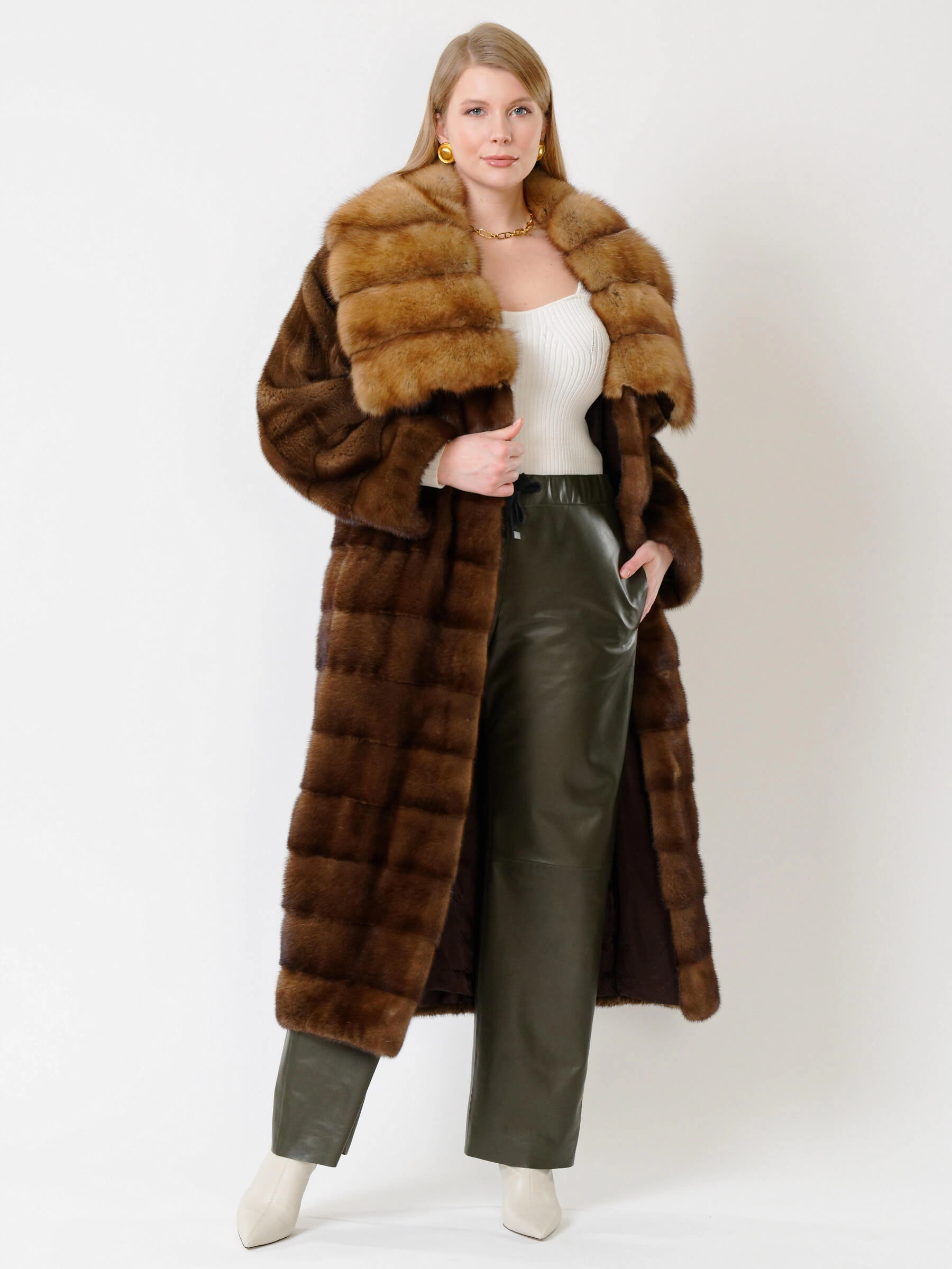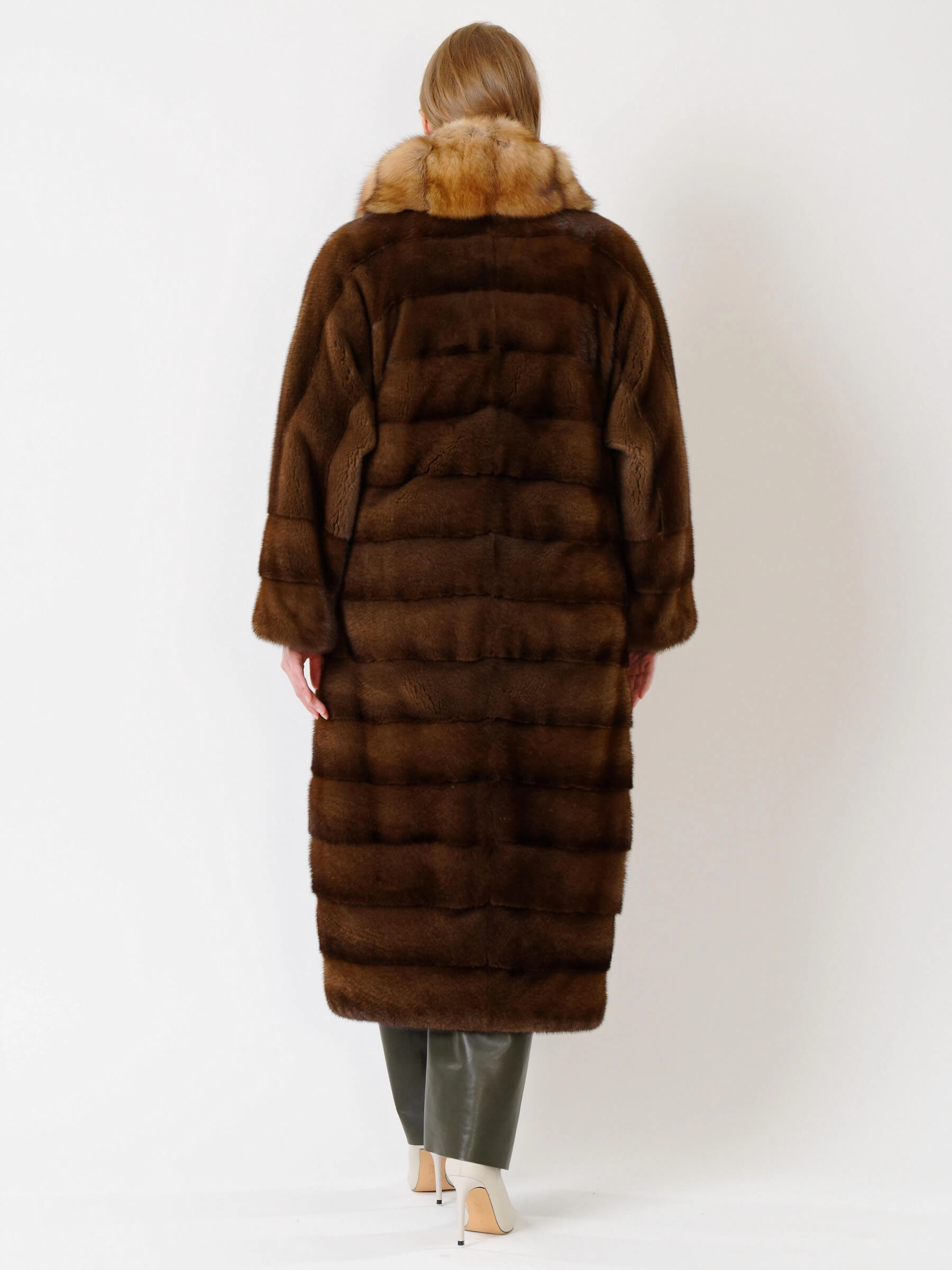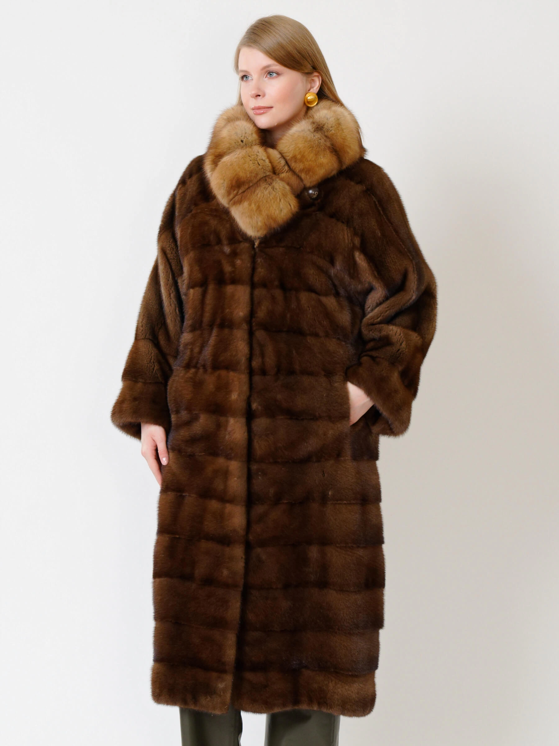 Эффектное пальто из меха норки датской селекции. Нежнейший мех, максимально густой, с коротким остевым волосом. Шикарный воротник-трансформер из меха соболя. Борт, область вокруг кармана, низ рукавов и воротник продублированы бортовкой из льна с вкраплением конского волоса. Безупречный подбор меха. Ювелирная работа наших портных. Бесподобный комфорт. Премиальное качество.