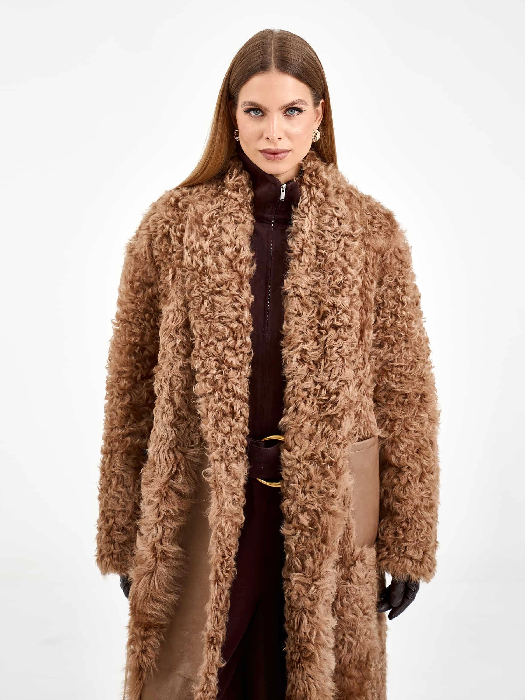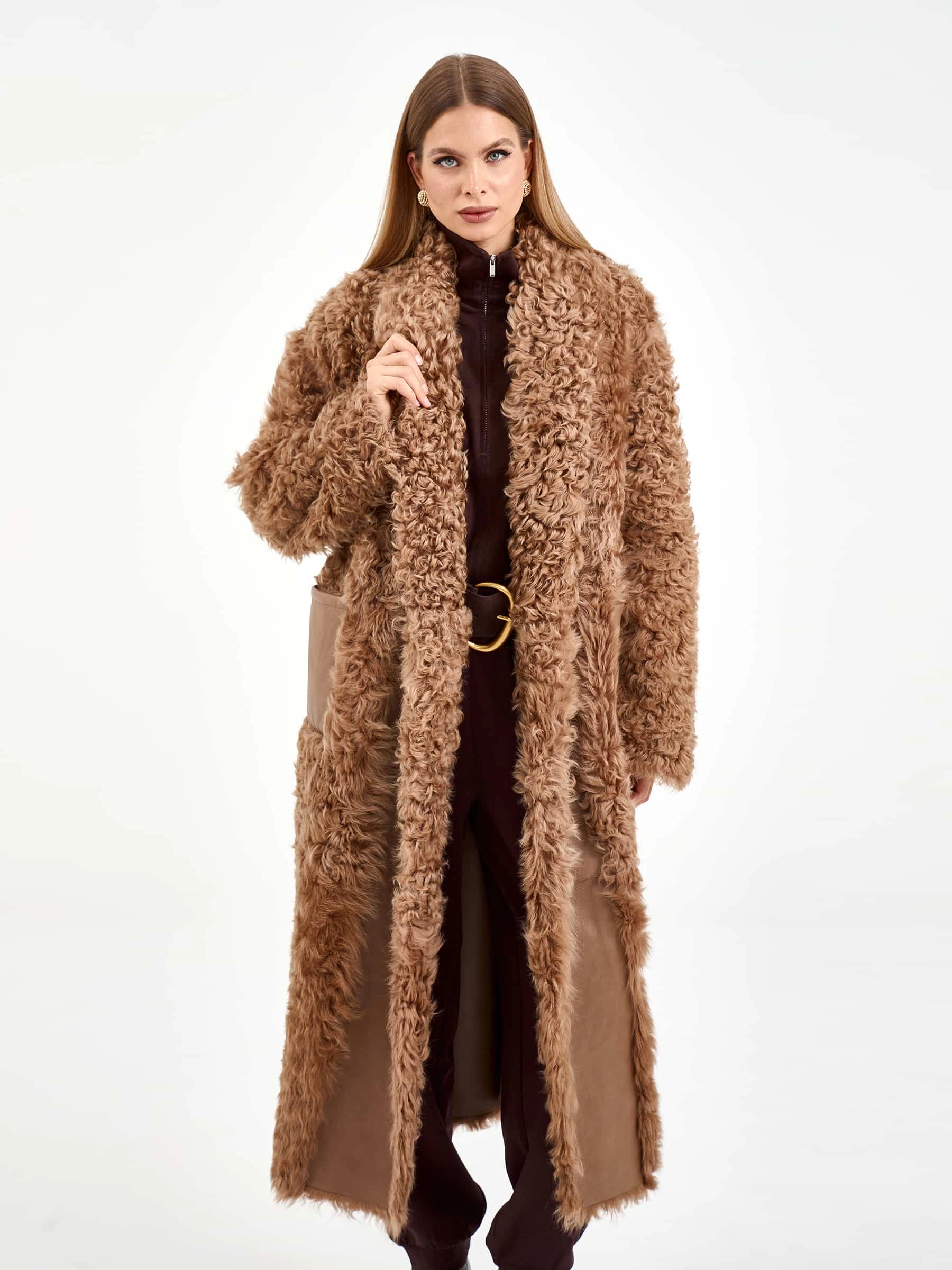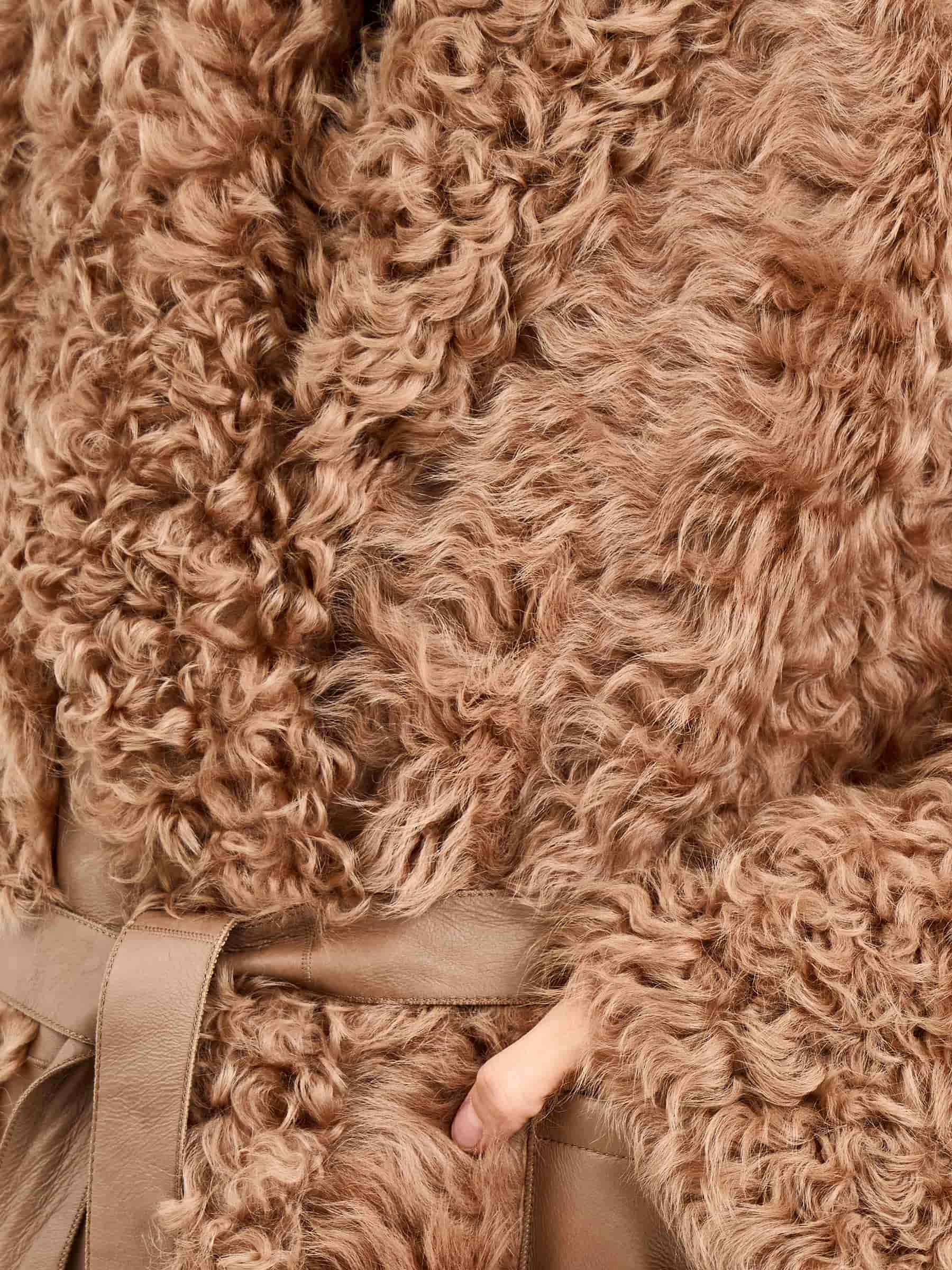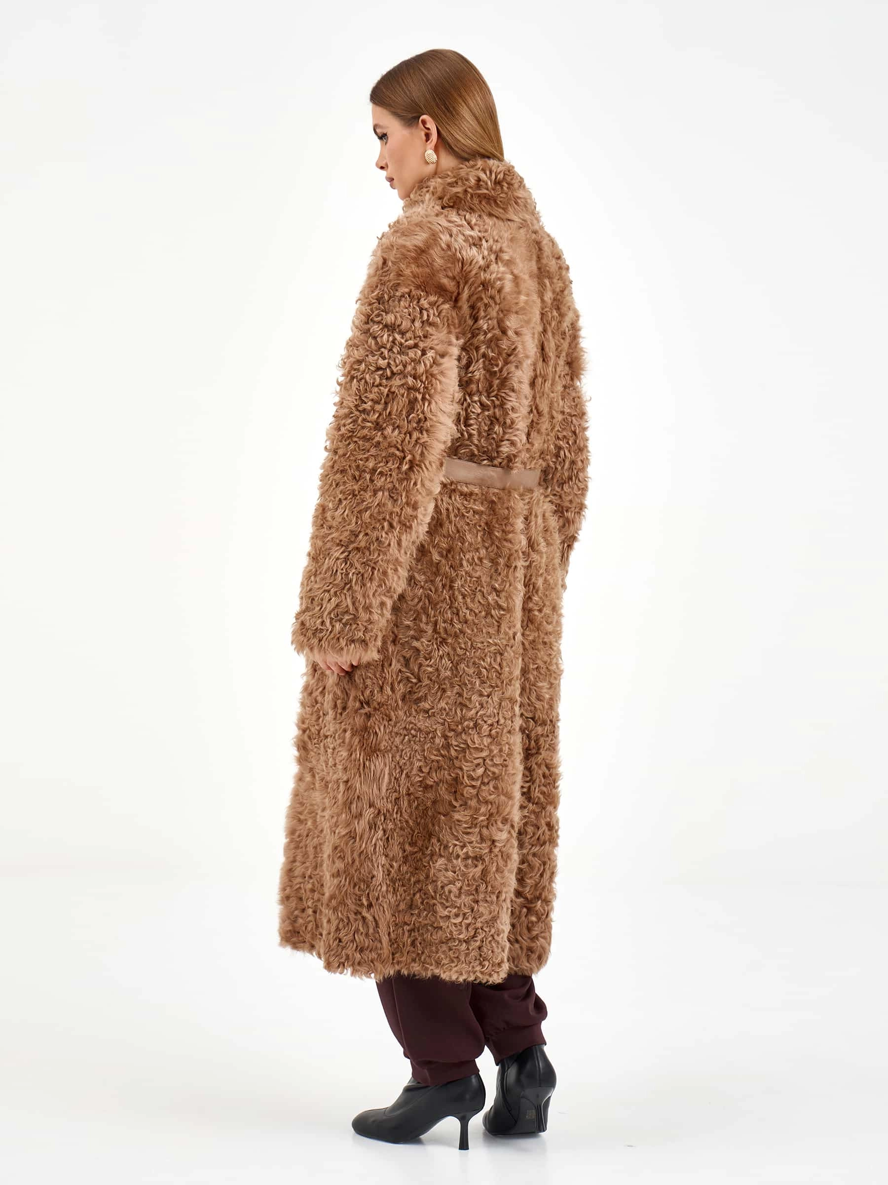 Товар пальто из натуральной овчины тиградо для женщин премиум класса 2020, светло-коричневое, размер 44, артикул 64300 выполнен из овчина "тиградо" с застежкой пояс. Рассчитан на сезон: осень-зима. Длина изделия 122 см, силуэт прямой.