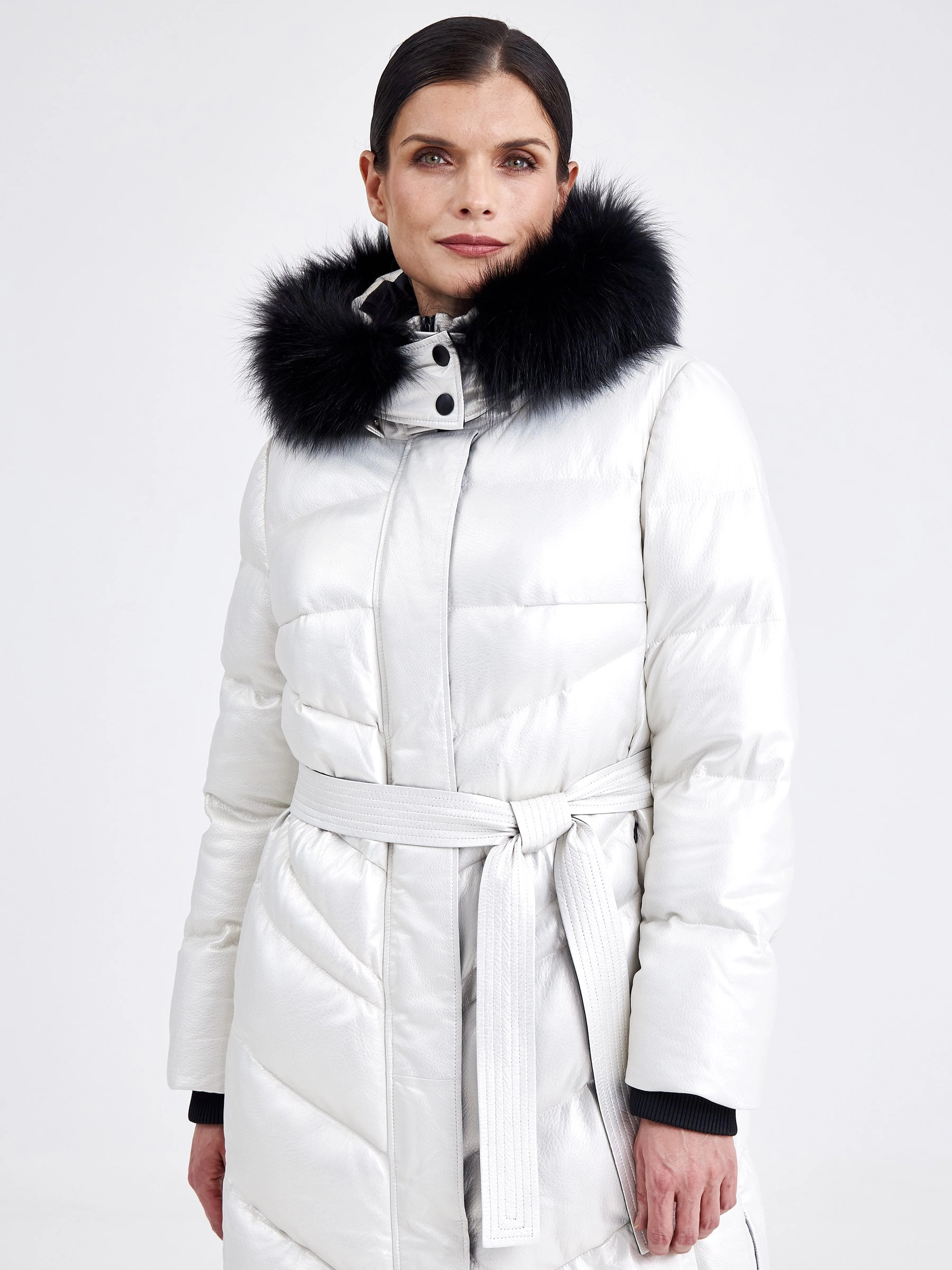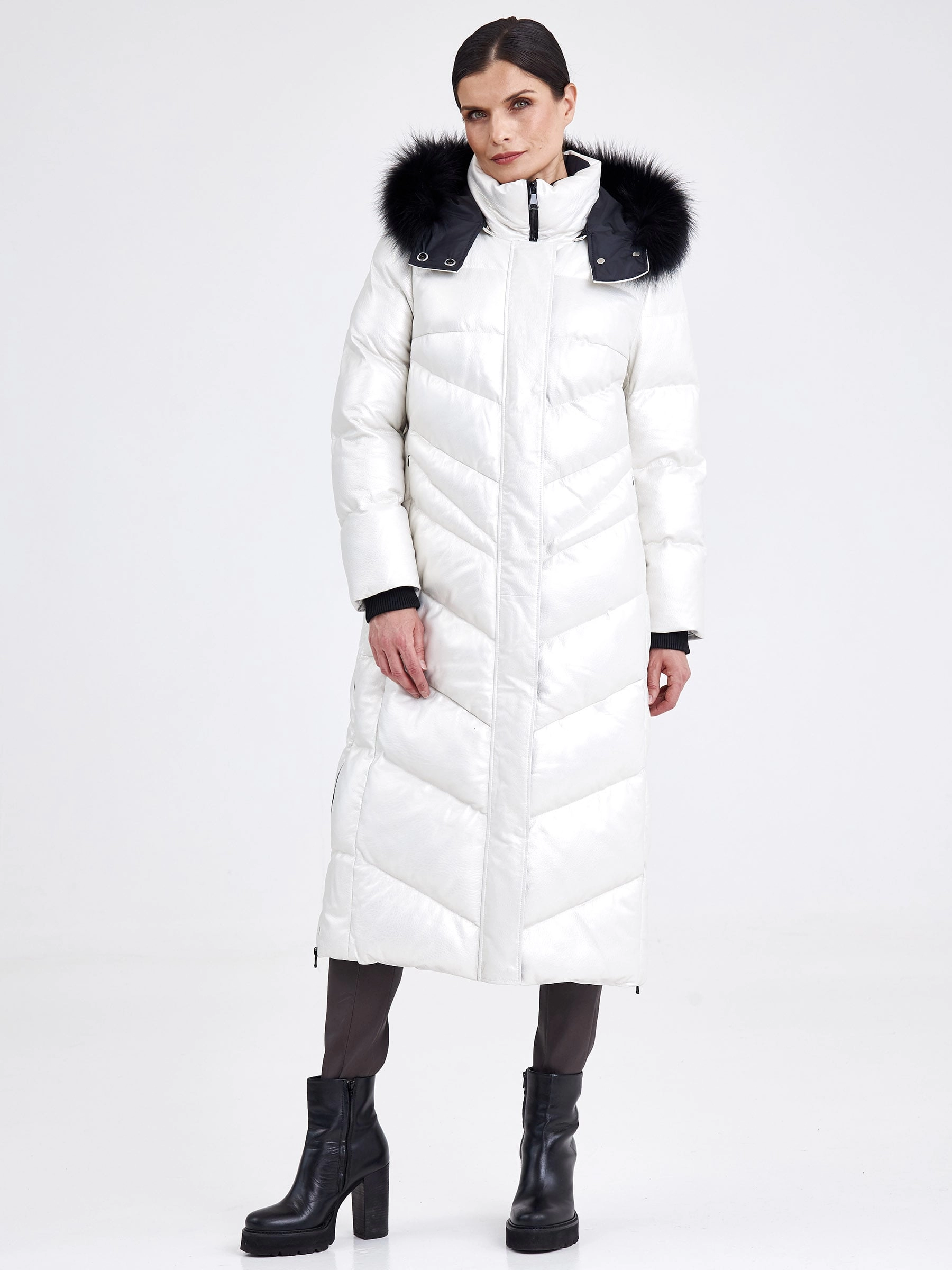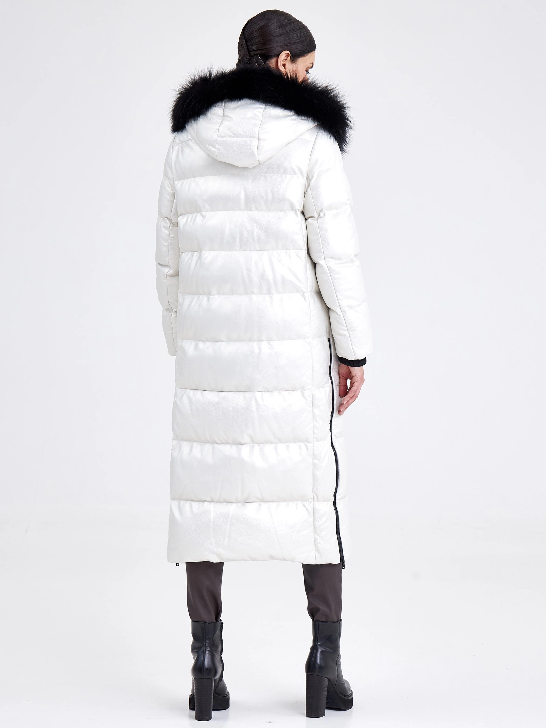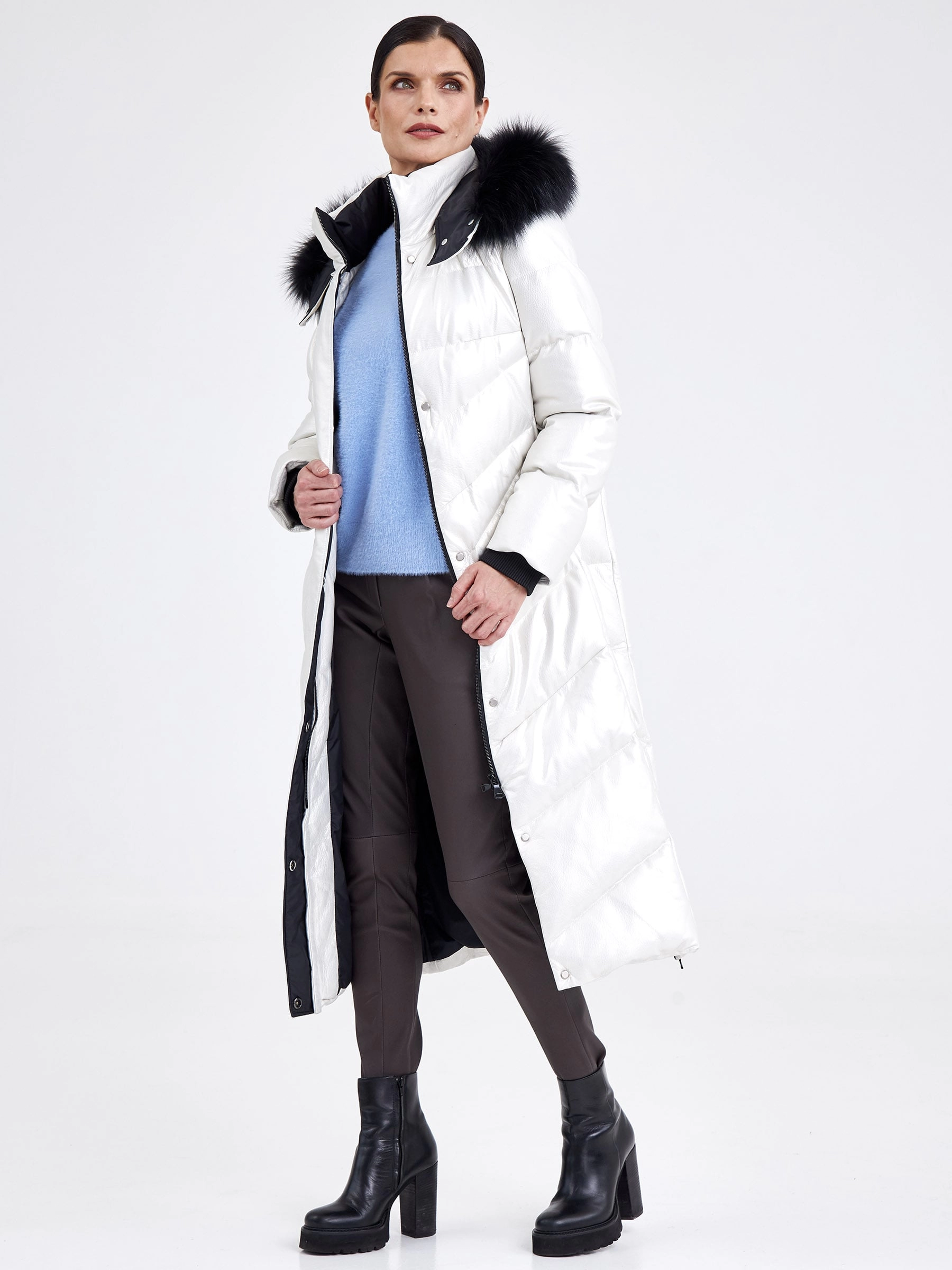 Прямое стеганное пальто выполнили из белой зернистой перламутровой кожи. Застежка - молния закрыта клапоном. Изменить силуэт можно при помощи широкого пояса. Утеплителем послужил немецкий синтепон Френденберг. За дополнительный комфорт отвечают глубокий съемный капюшон который декорировали пушистым мехом песца. Завершили модель высокими боковыми разрезами застегивающимися молнией.