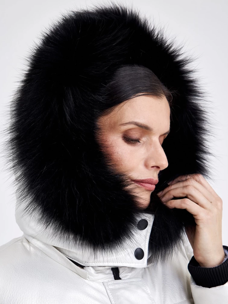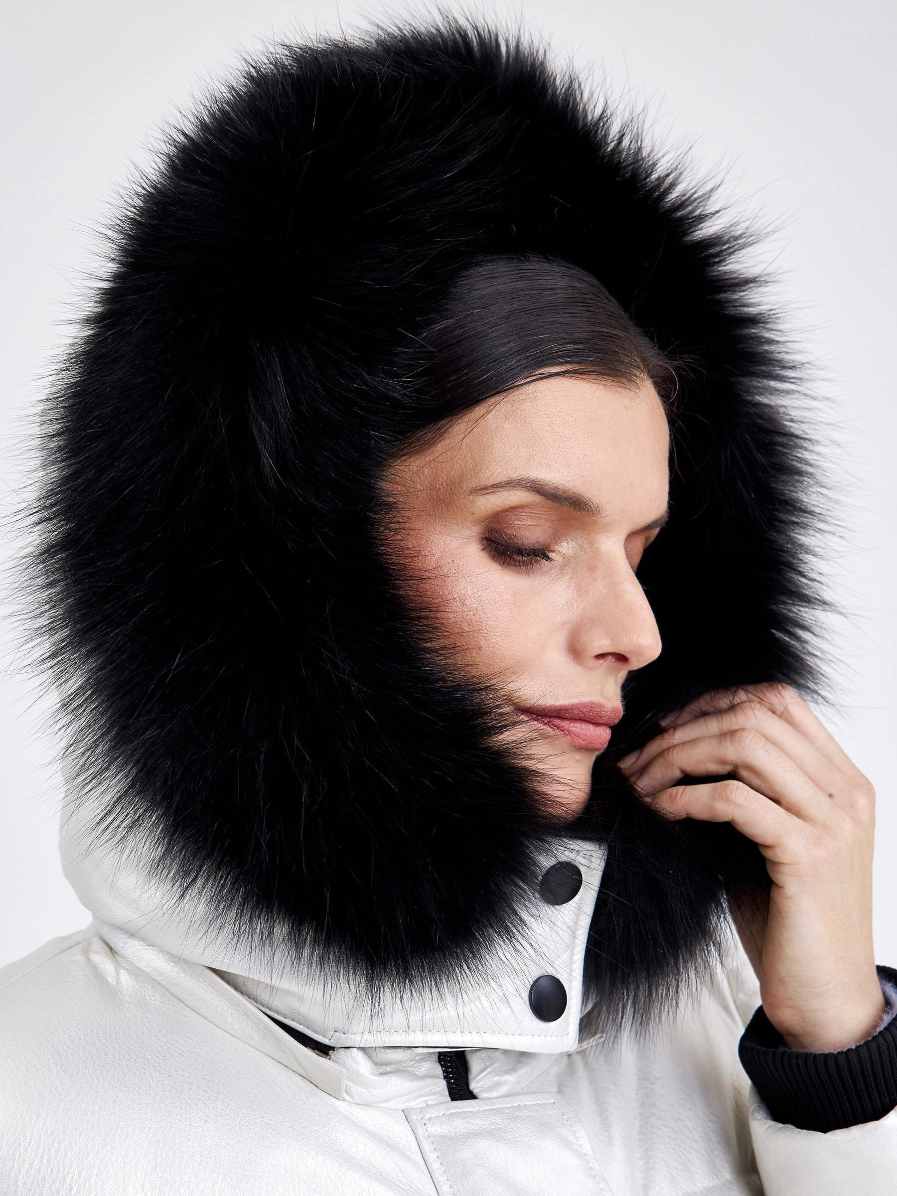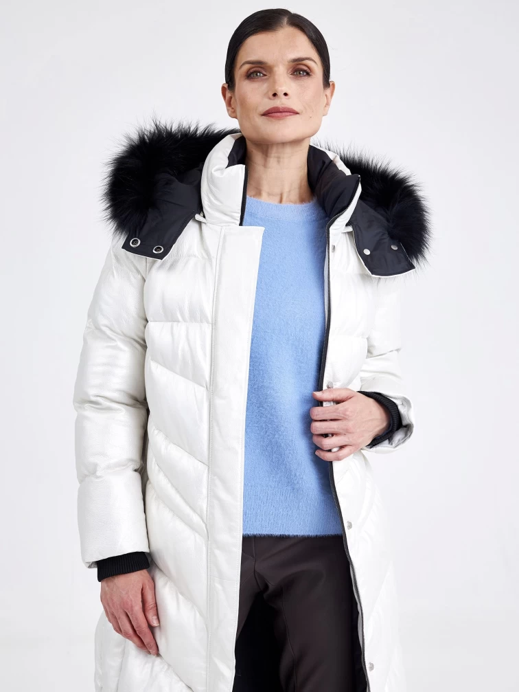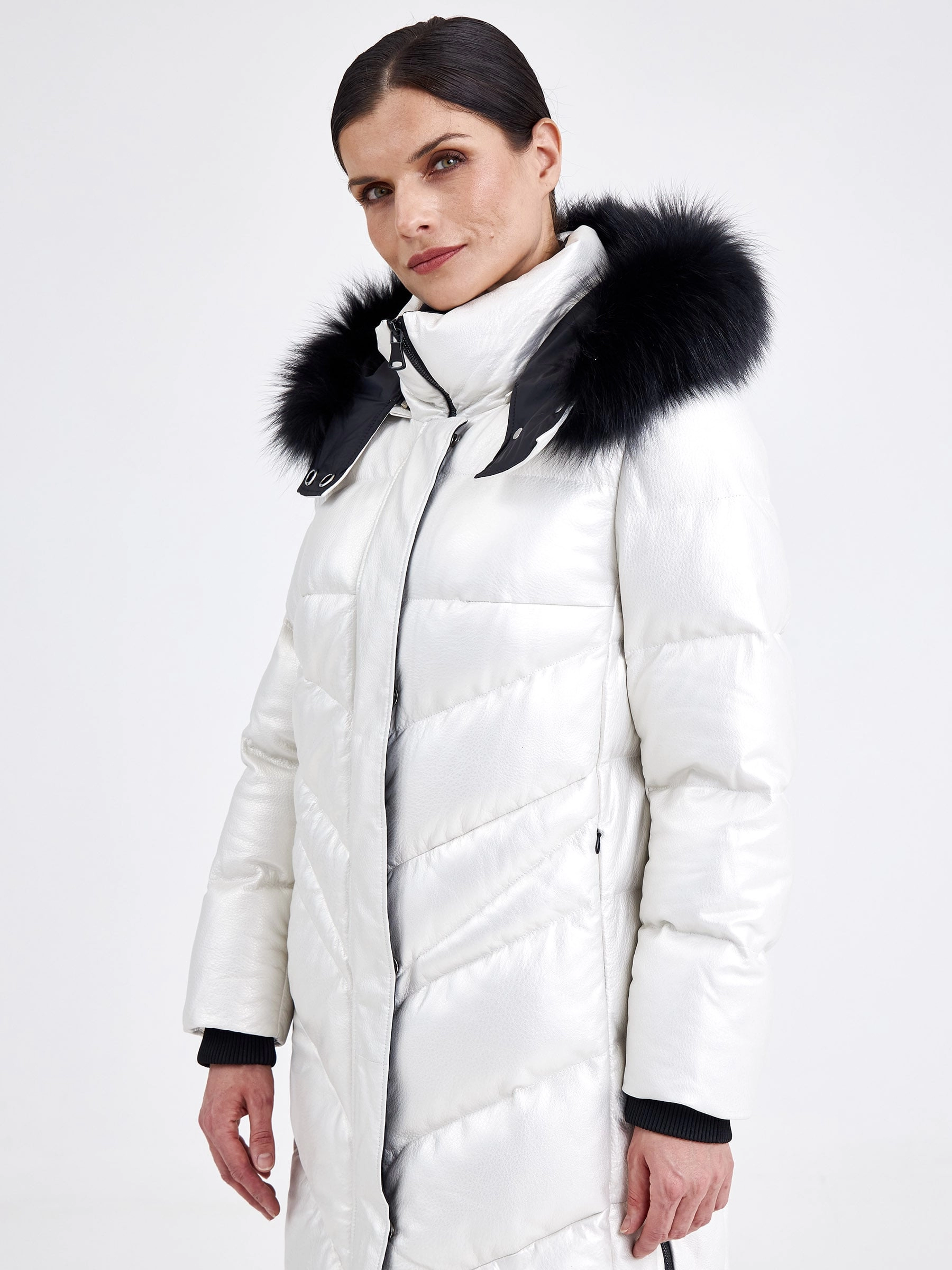Прямое стеганное пальто выполнили из белой зернистой перламутровой кожи. Застежка - молния закрыта клапоном. Изменить силуэт можно при помощи широкого пояса. Утеплителем послужил немецкий синтепон Френденберг. За дополнительный комфорт отвечают глубокий съемный капюшон который декорировали пушистым мехом песца. Завершили модель высокими боковыми разрезами застегивающимися молнией.