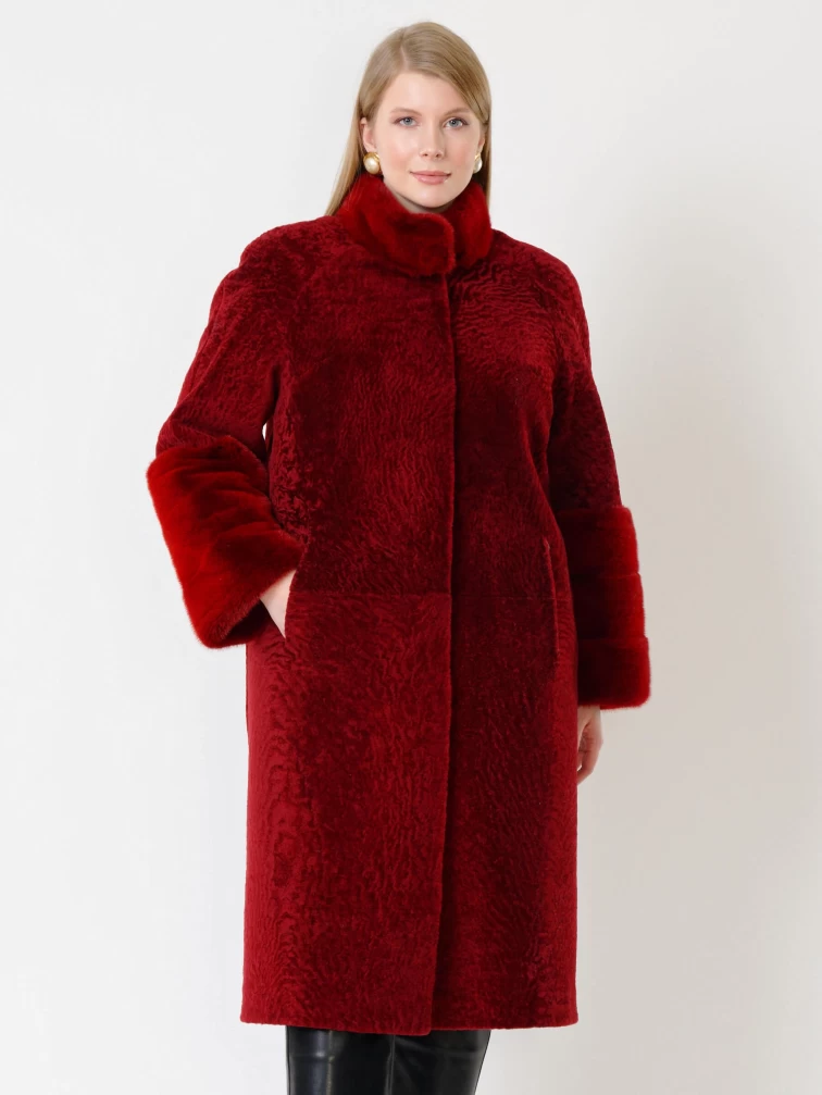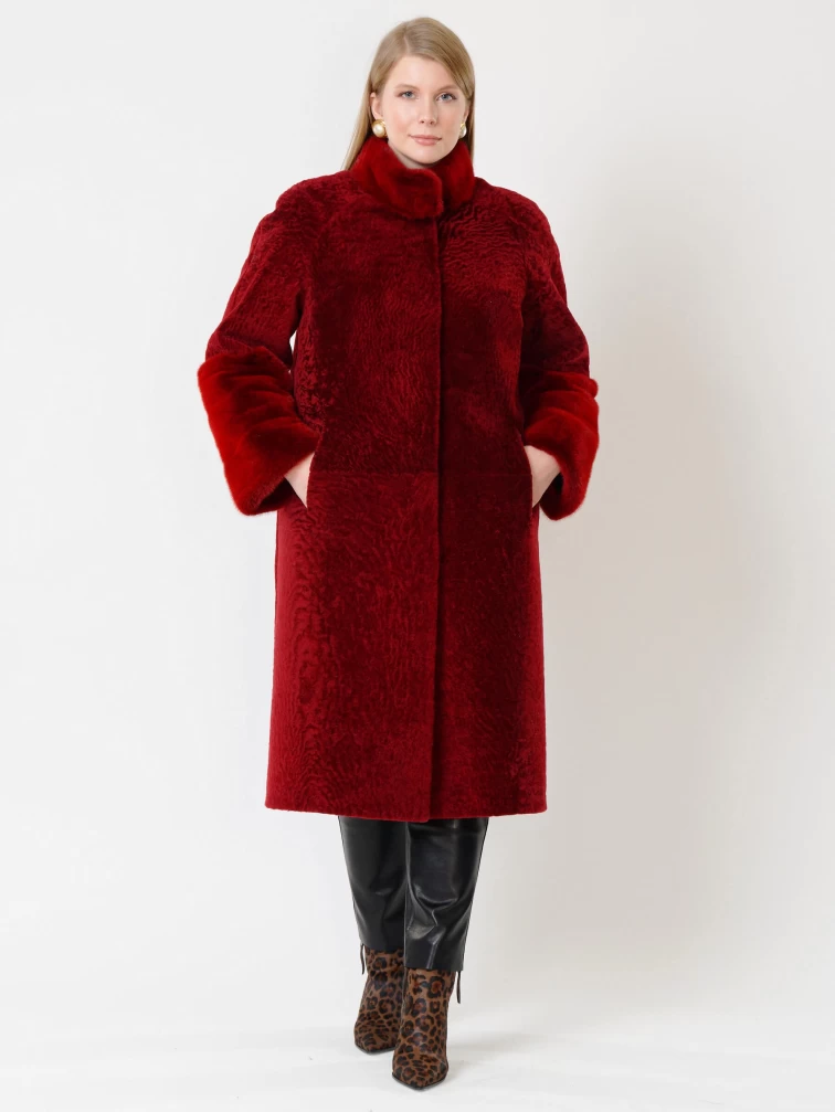 Товар дубленка из астрагана с отделкой мехом норки для женщин 52мех, бордовая, размер 48, артикул 17540 выполнен из астраган с застежкой кнопки. Рассчитан на сезон: осень-зима. Длина изделия 110 см, силуэт прямой.