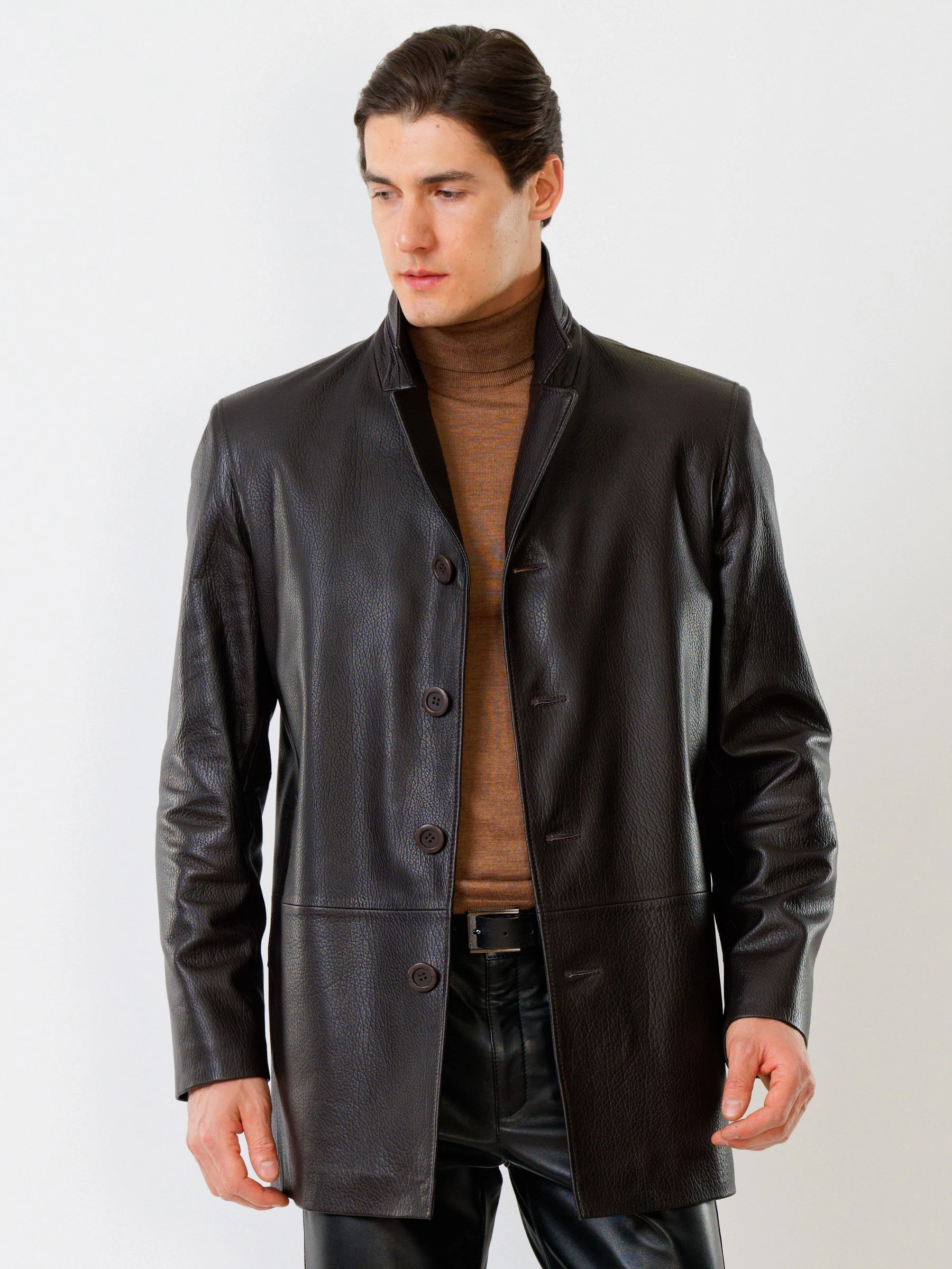 Товар кожаный костюм мужской: пиджак 21/1 + брюки 01, коричневый/черный, р. 48, артикул 140010 выполнен из натуральной кожи. Рассчитан на сезон: демисезон.