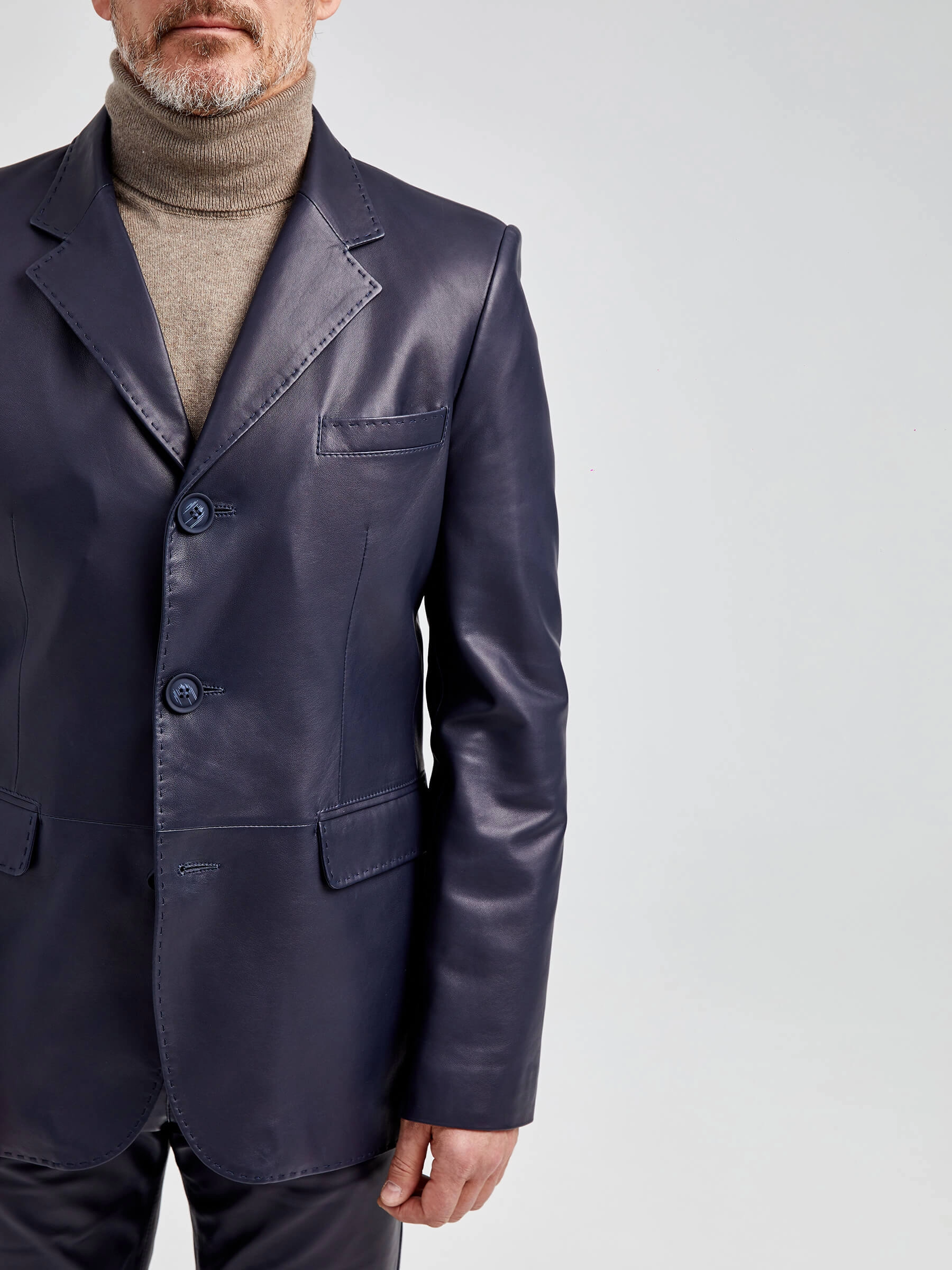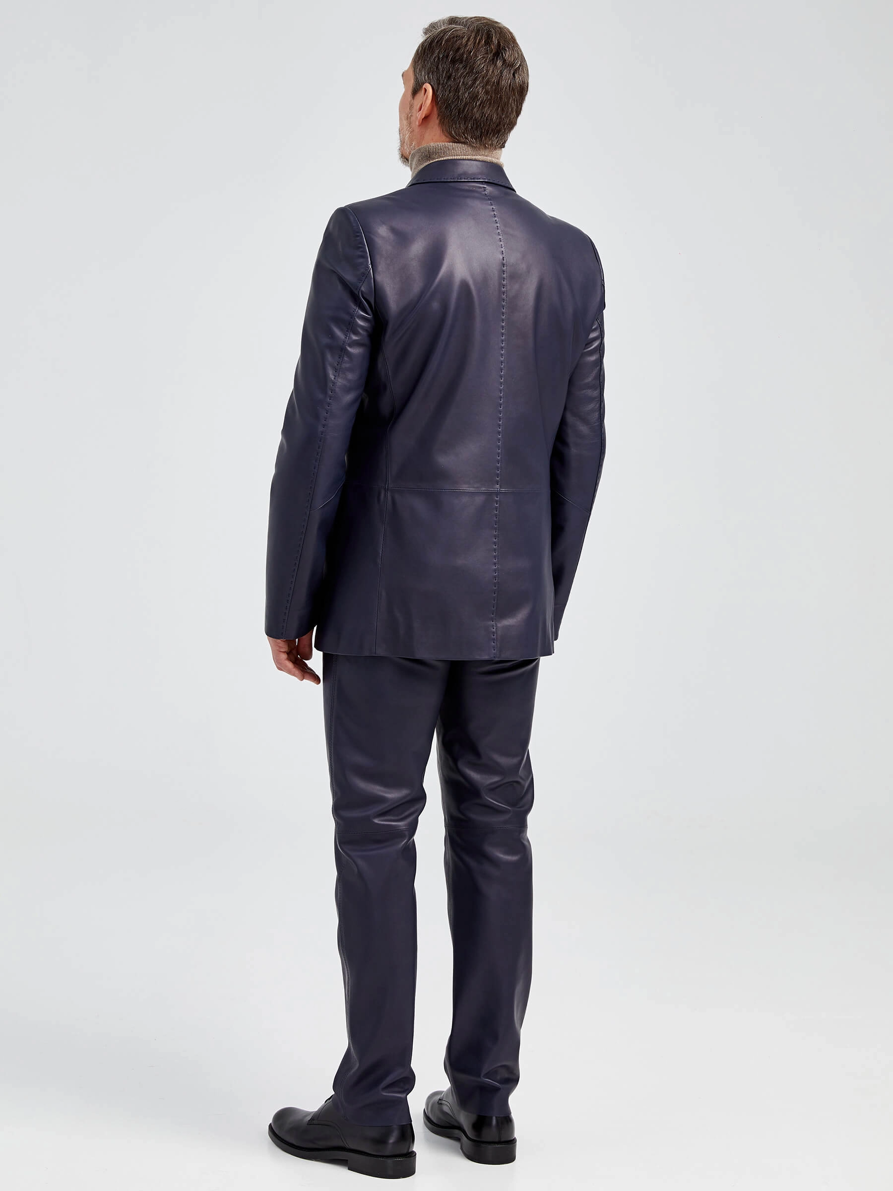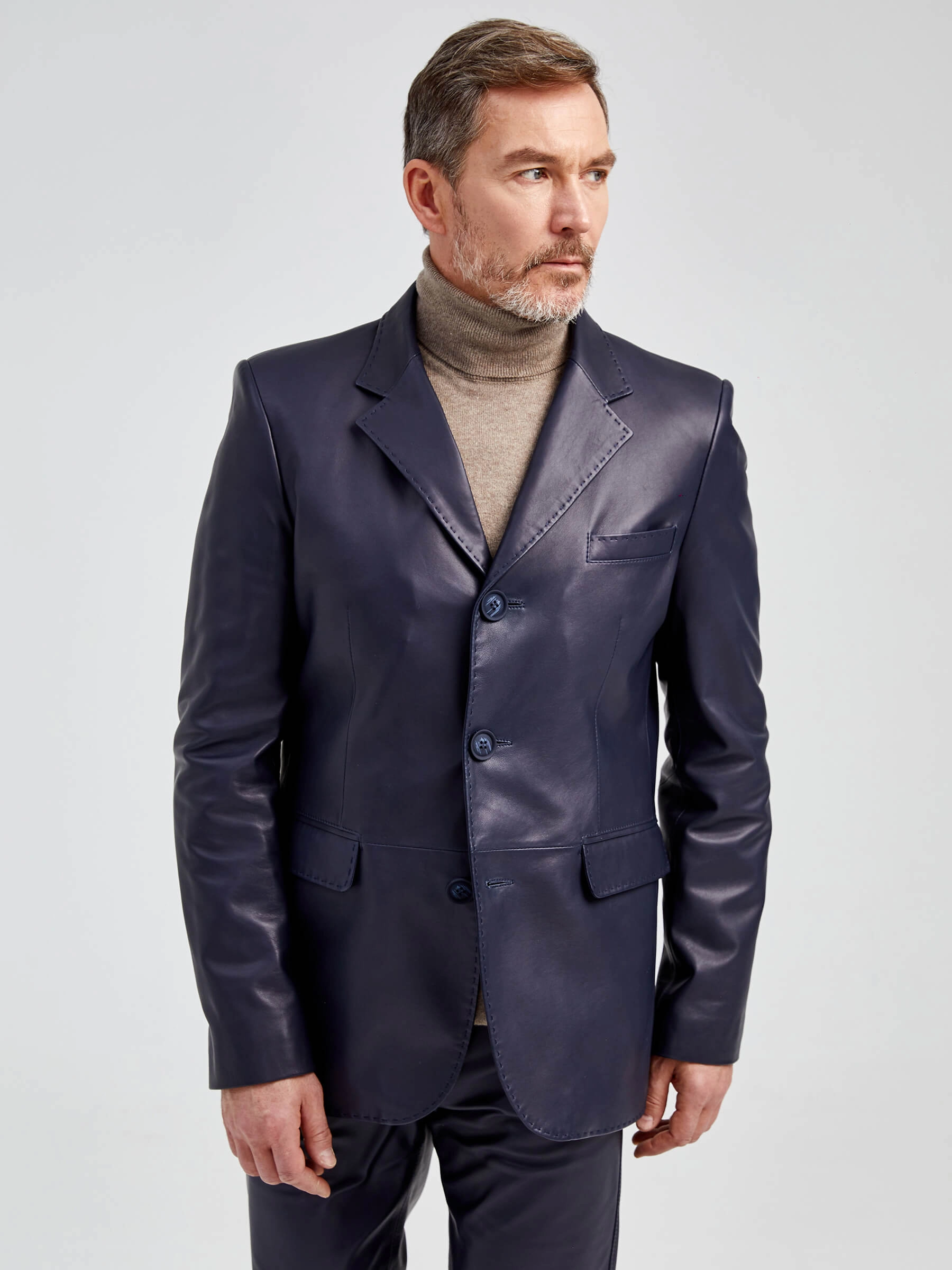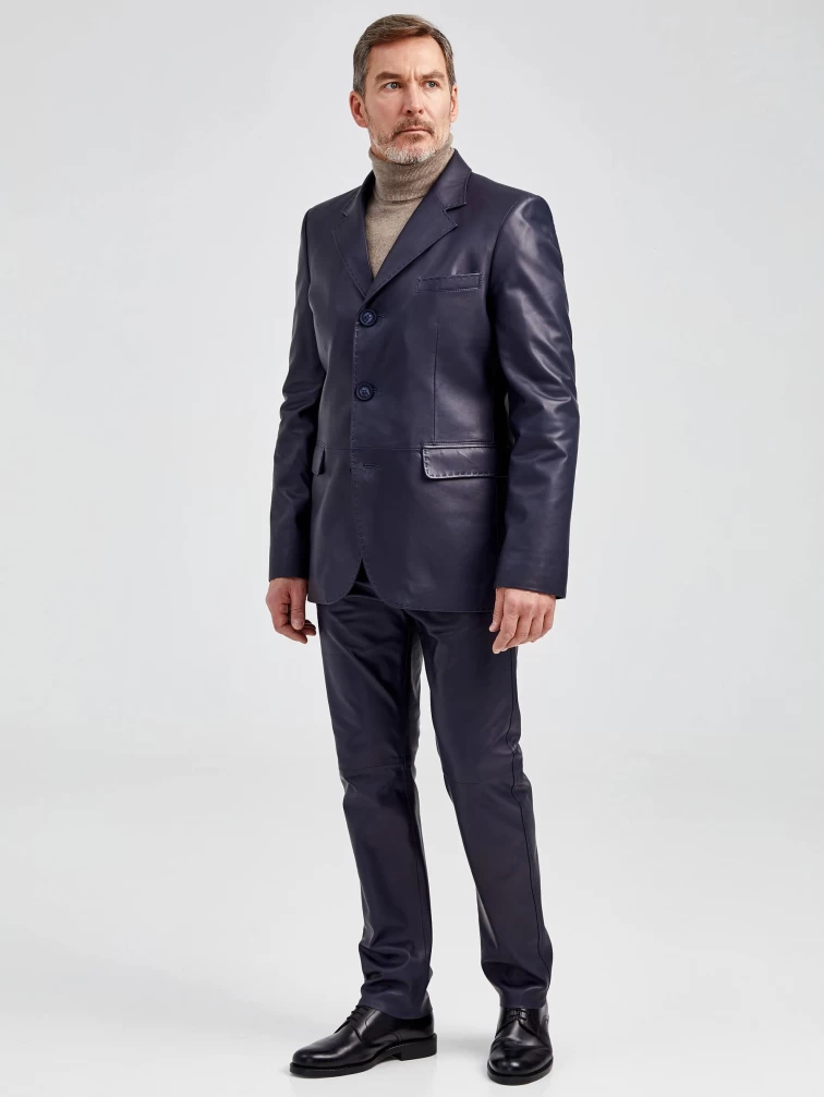 Товар мужской кожаный пиджак на ручном стежке премиум класса 543, синий, размер 50, артикул 28962 выполнен из натуральной кожи с застежкой пуговицы. Рассчитан на сезон: весна-лето. Длина изделия 78 см, силуэт полуприлегающий.