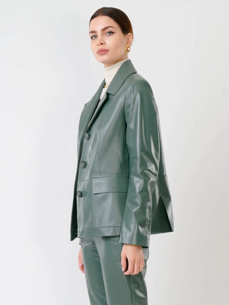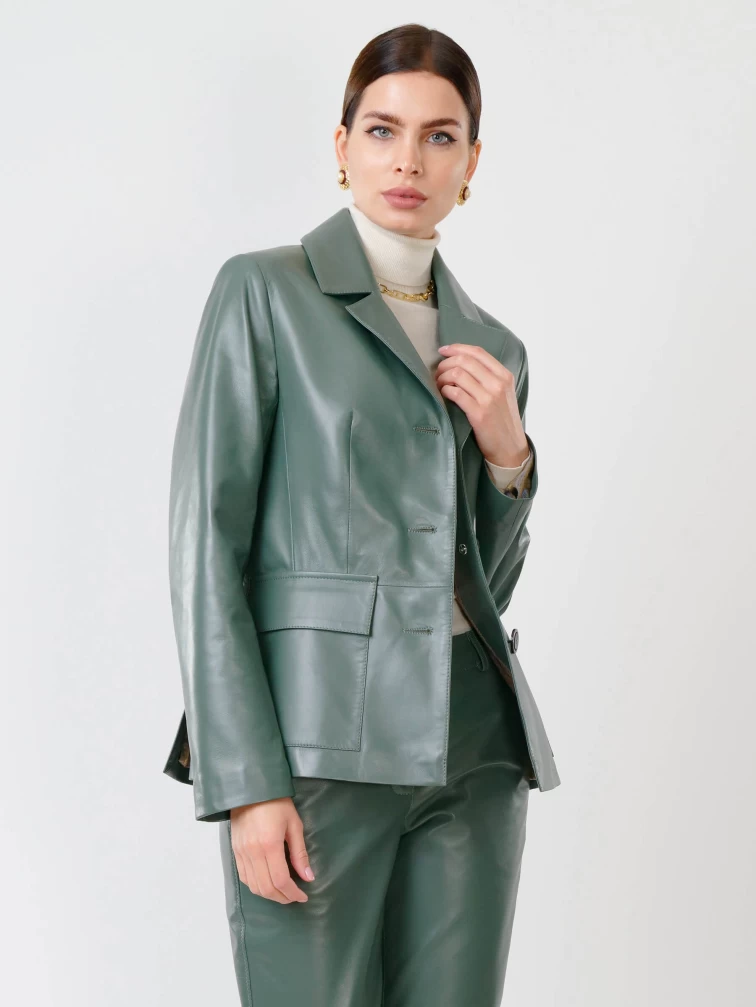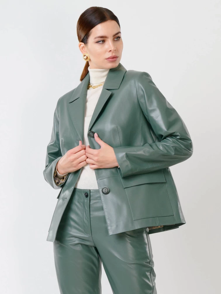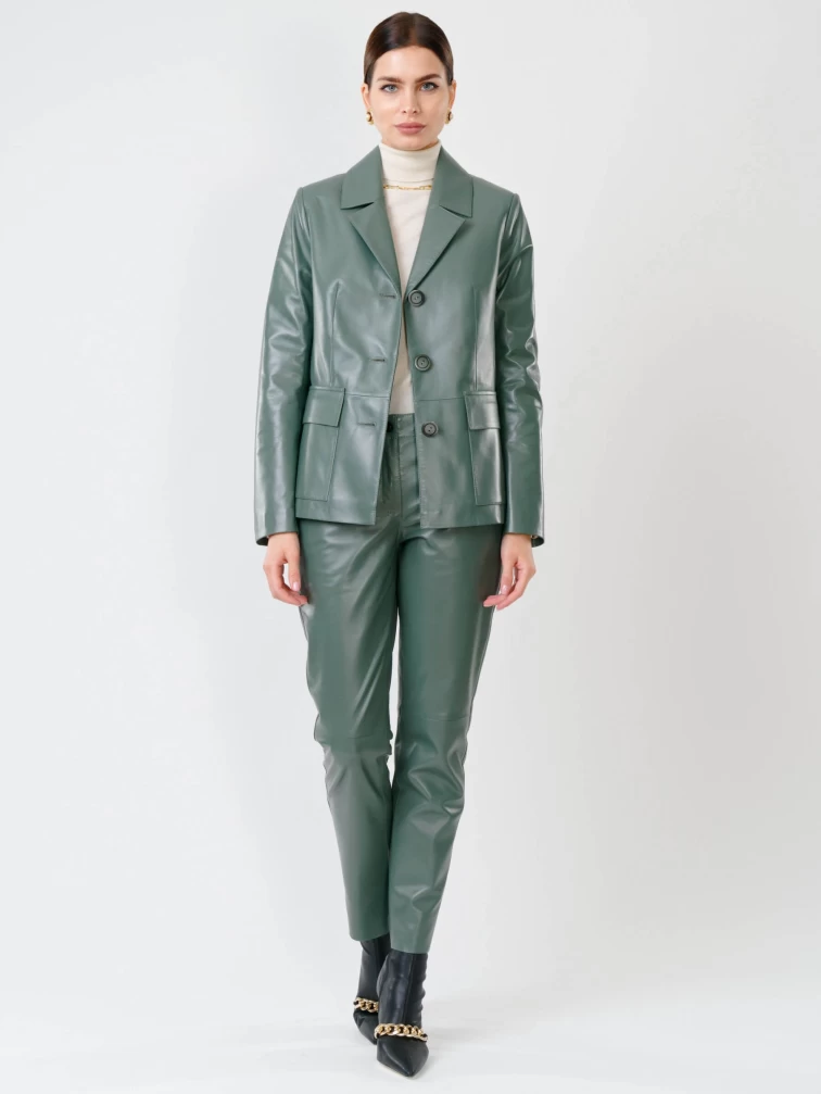Товар женский кожаный пиджак 3007, оливковый, размер 48, артикул 90711 выполнен из натуральной кожи с застежкой пуговицы. Рассчитан на сезон: весна-лето. Длина изделия 63 см, силуэт полуприлегающий.