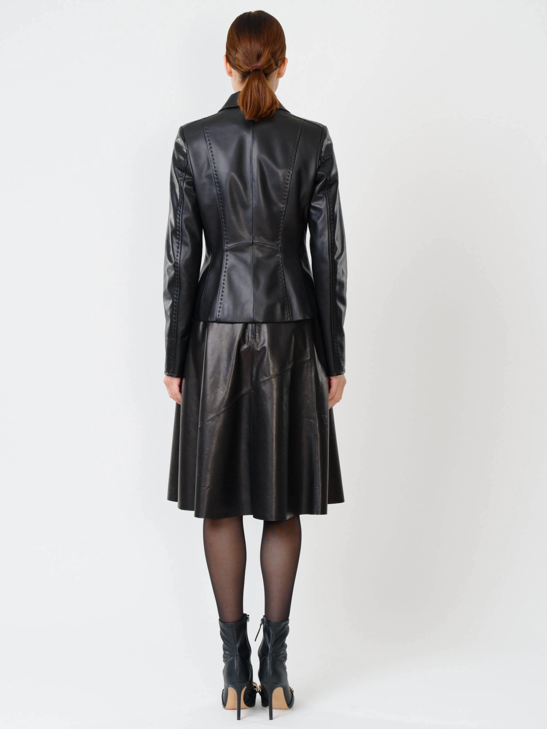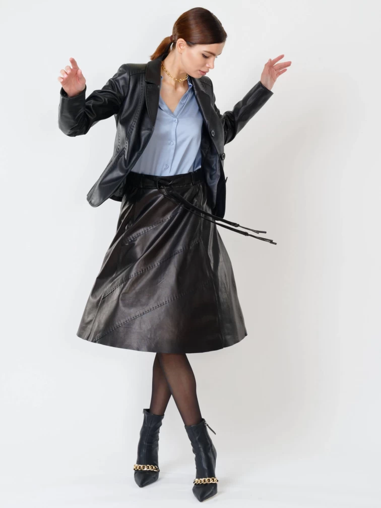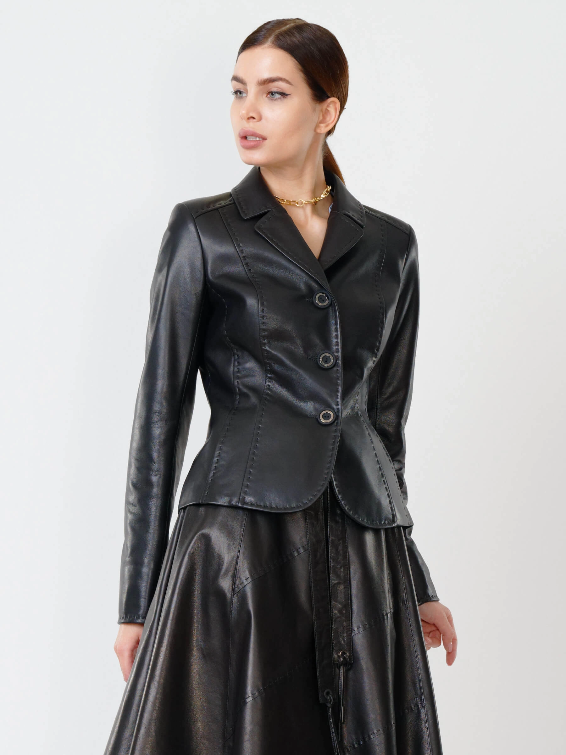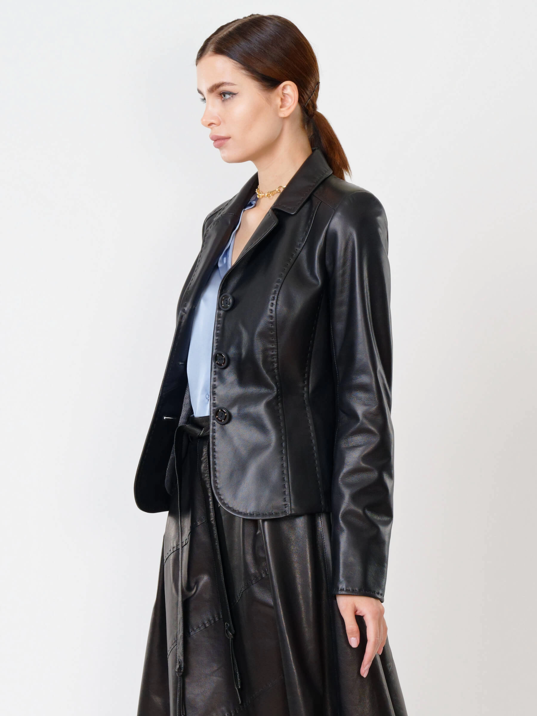 Изысканный кожаный пиджак длиной 50 см: полуприлегающий силуэт с акцентом на талию, классический английский воротник и ручная стежка подчеркивают аристократичную элегантность. Выполнен из мягкой натуральной кожи с врезными карманами и застёжкой на пуговицах с филигранной гравировкой. Создавайте выразительные контрасты: сочетайте с кожаными брюками-карго для дерзкого монохрома, с атласным платьем-чехлом для игры текстур или с зауженными джинсами и броги для смарт-кэжуал с намёком на роскошь. Этот пиджак — хамелеон вашего гардероба, трансформирующий образ от делового до авангардного.