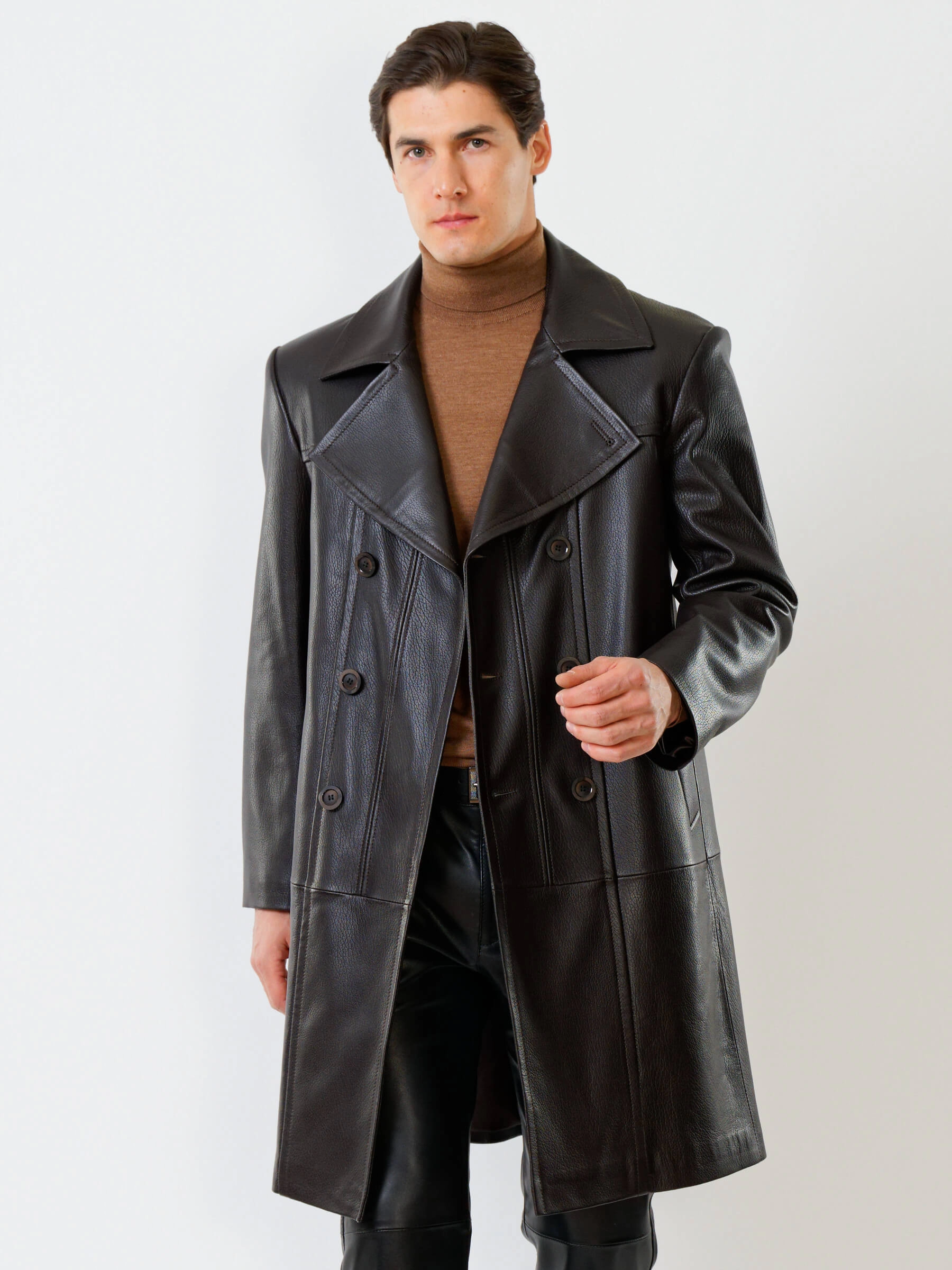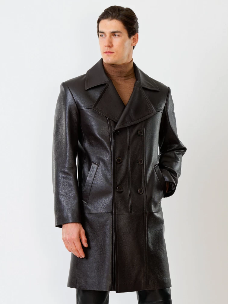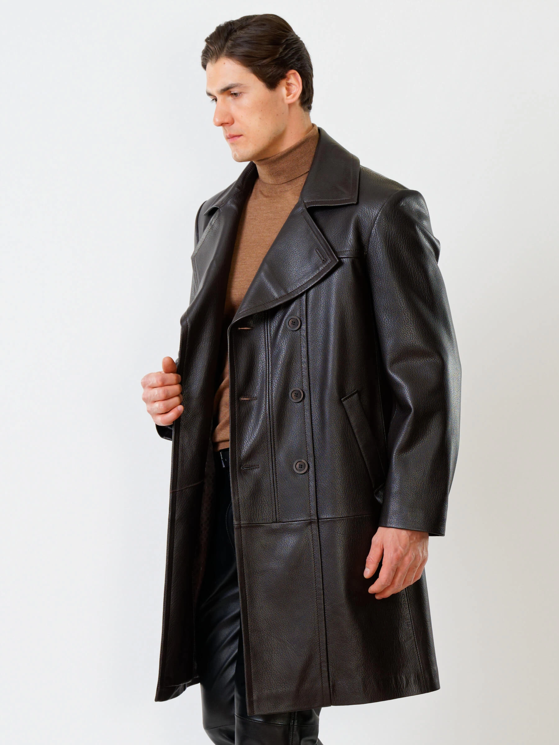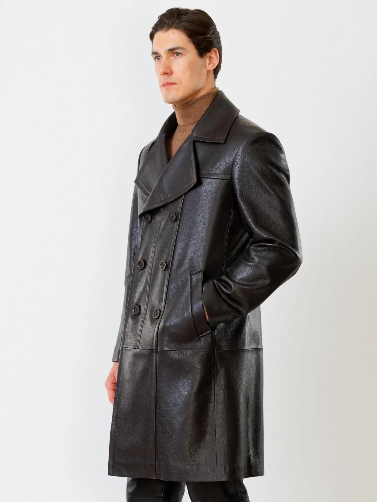 Товар двубортный мужской кожаный плащ премиум класса чикаго, коричневый, размер 46, артикул 28801 выполнен из натуральной кожи с застежкой пуговицы. Рассчитан на сезон: демисезон. Длина изделия 110 см, силуэт полуприлегающий.