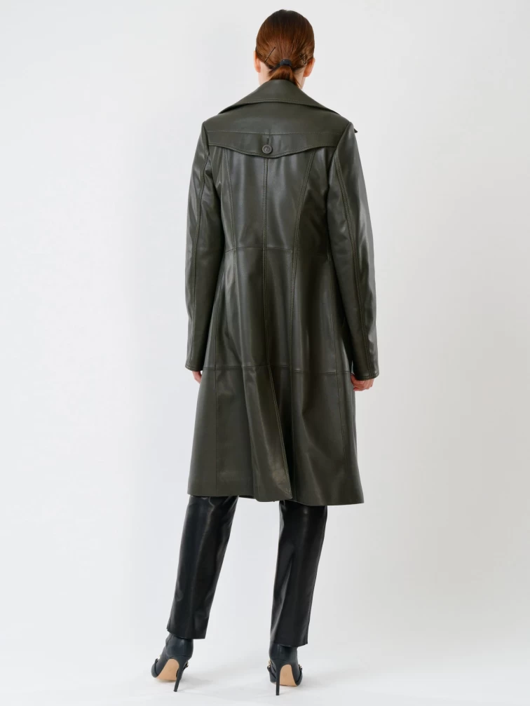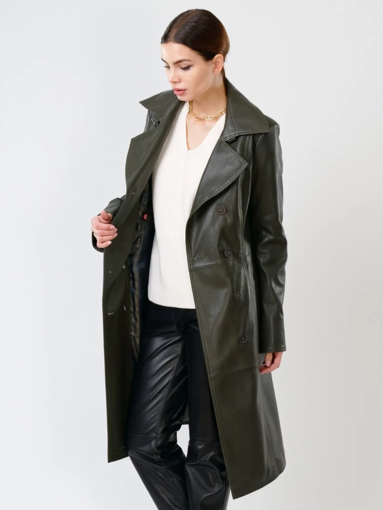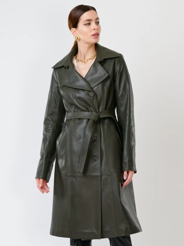 Товар кожаный двубортный женский плащ с поясом 3003, оливковый, размер 48, артикул 15640 выполнен из натуральной кожи с застежкой пуговицы. Рассчитан на сезон: демисезон. Длина изделия 108 см, силуэт полуприлегающий.