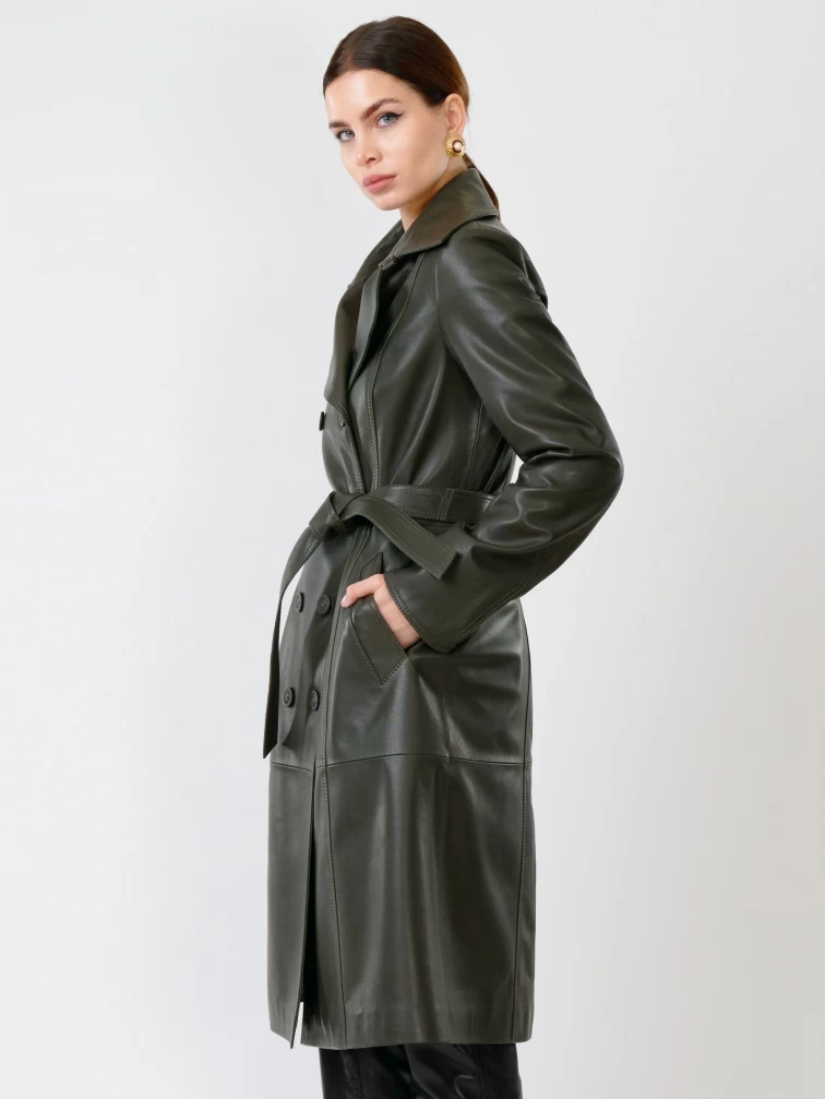Кожаный двубортный женский плащ с поясом 3003, оливковый, размер 48, артикул 15640