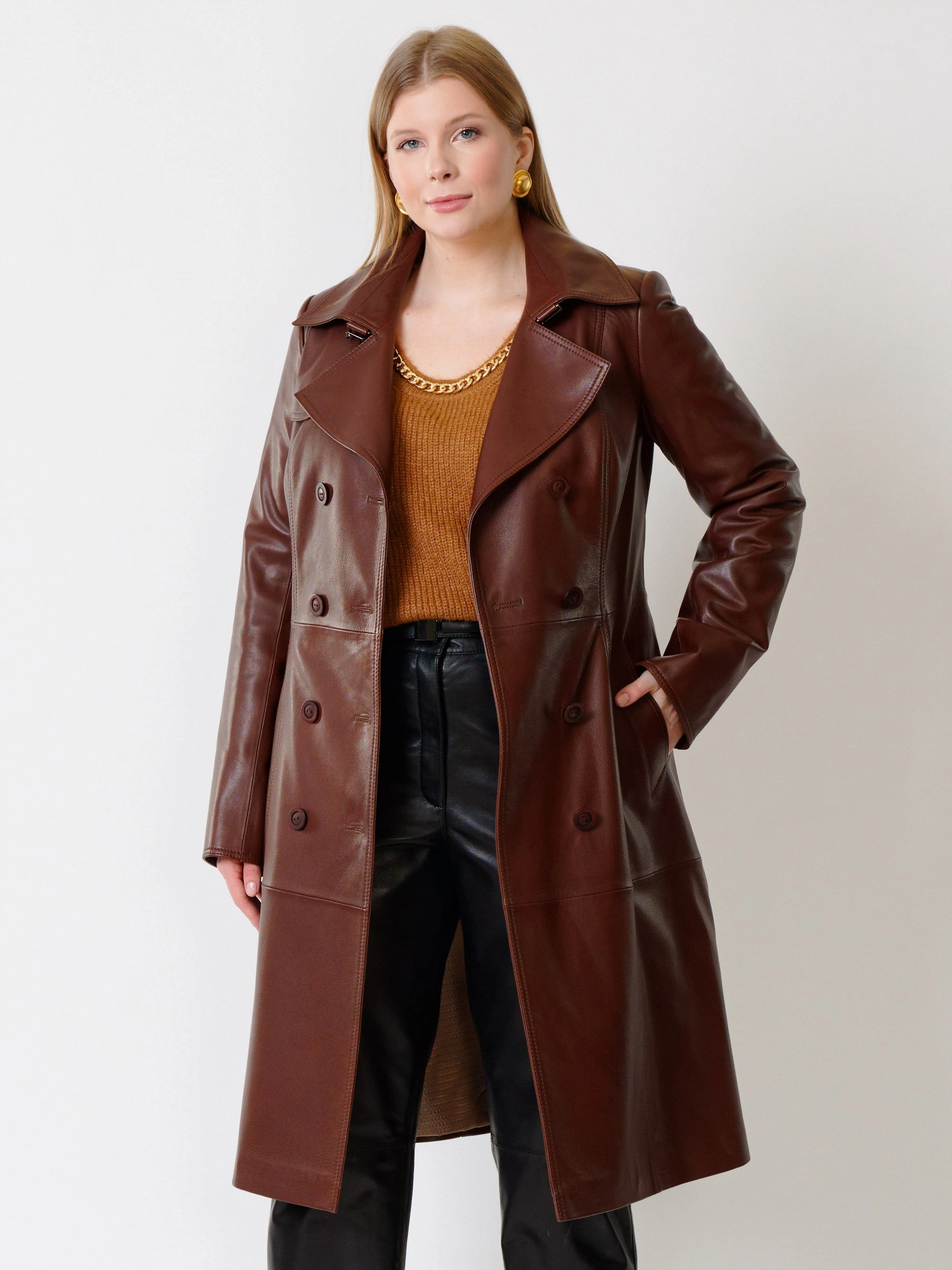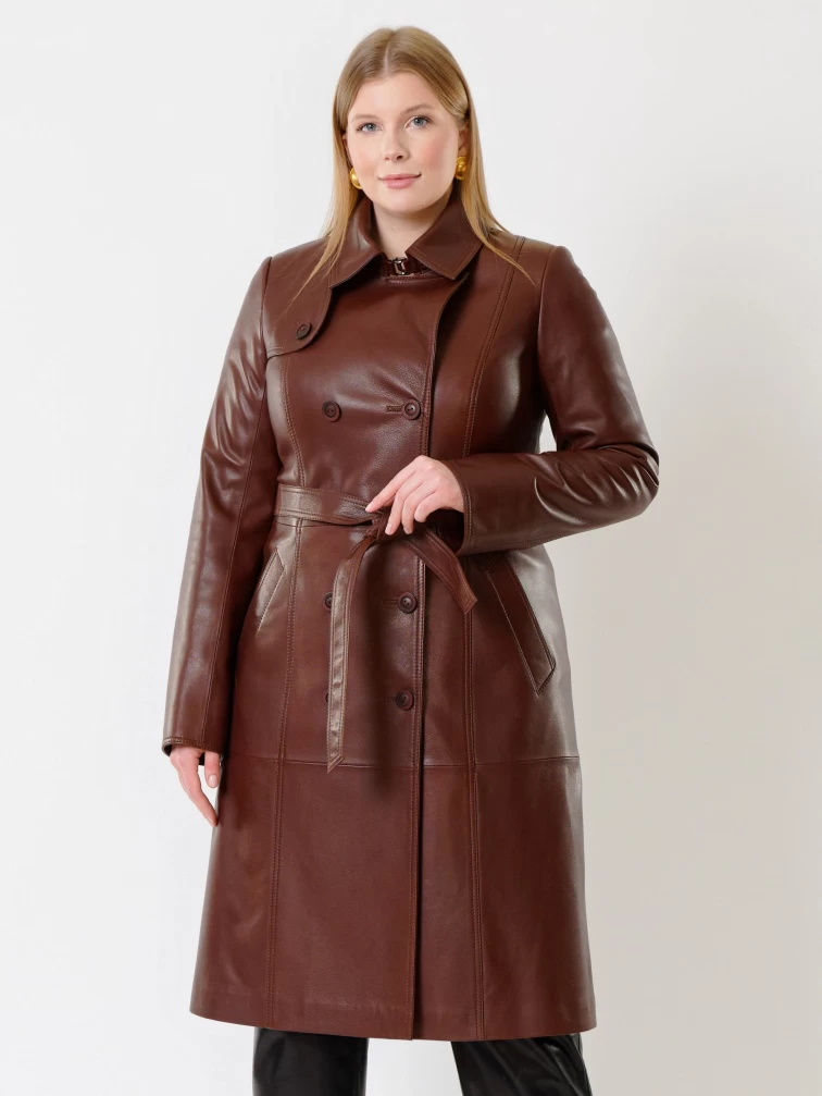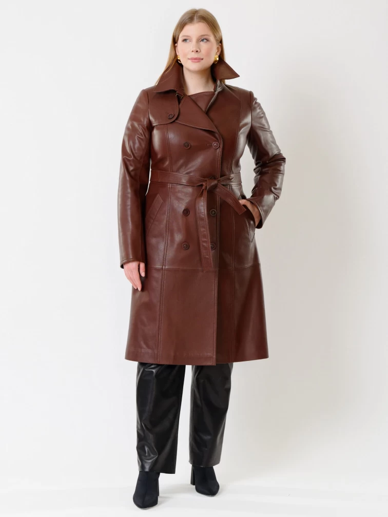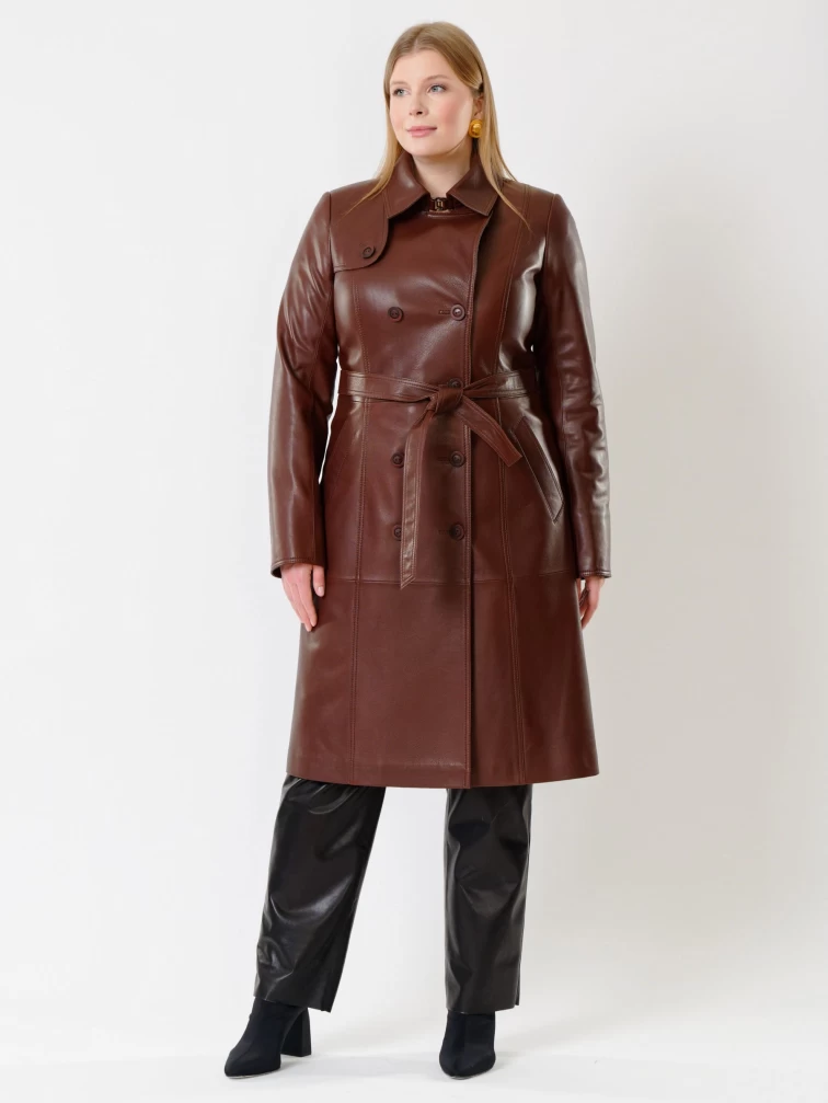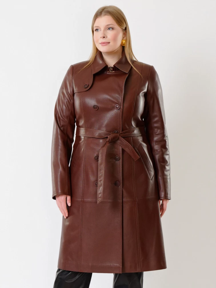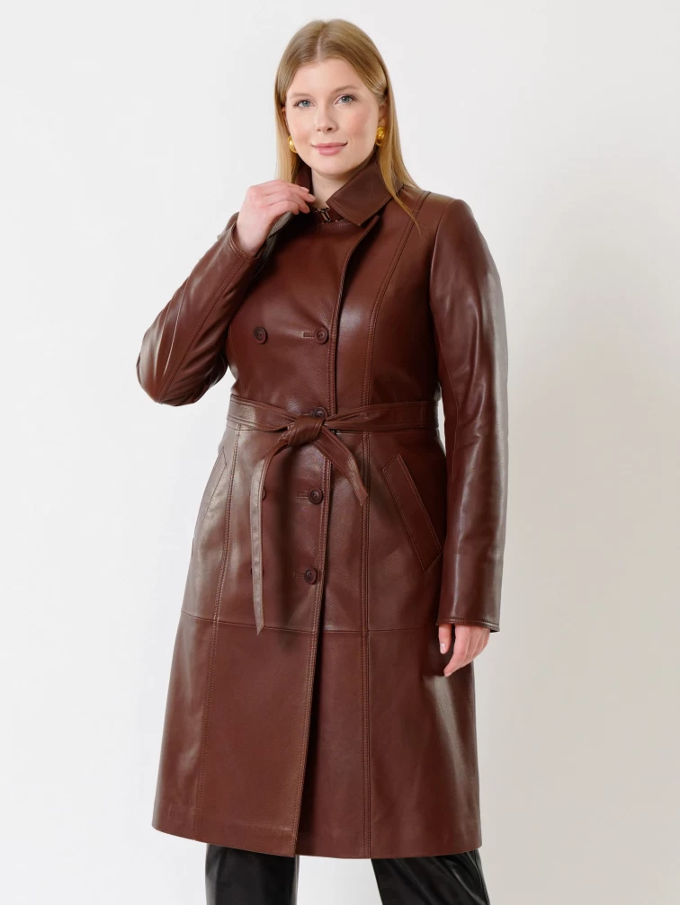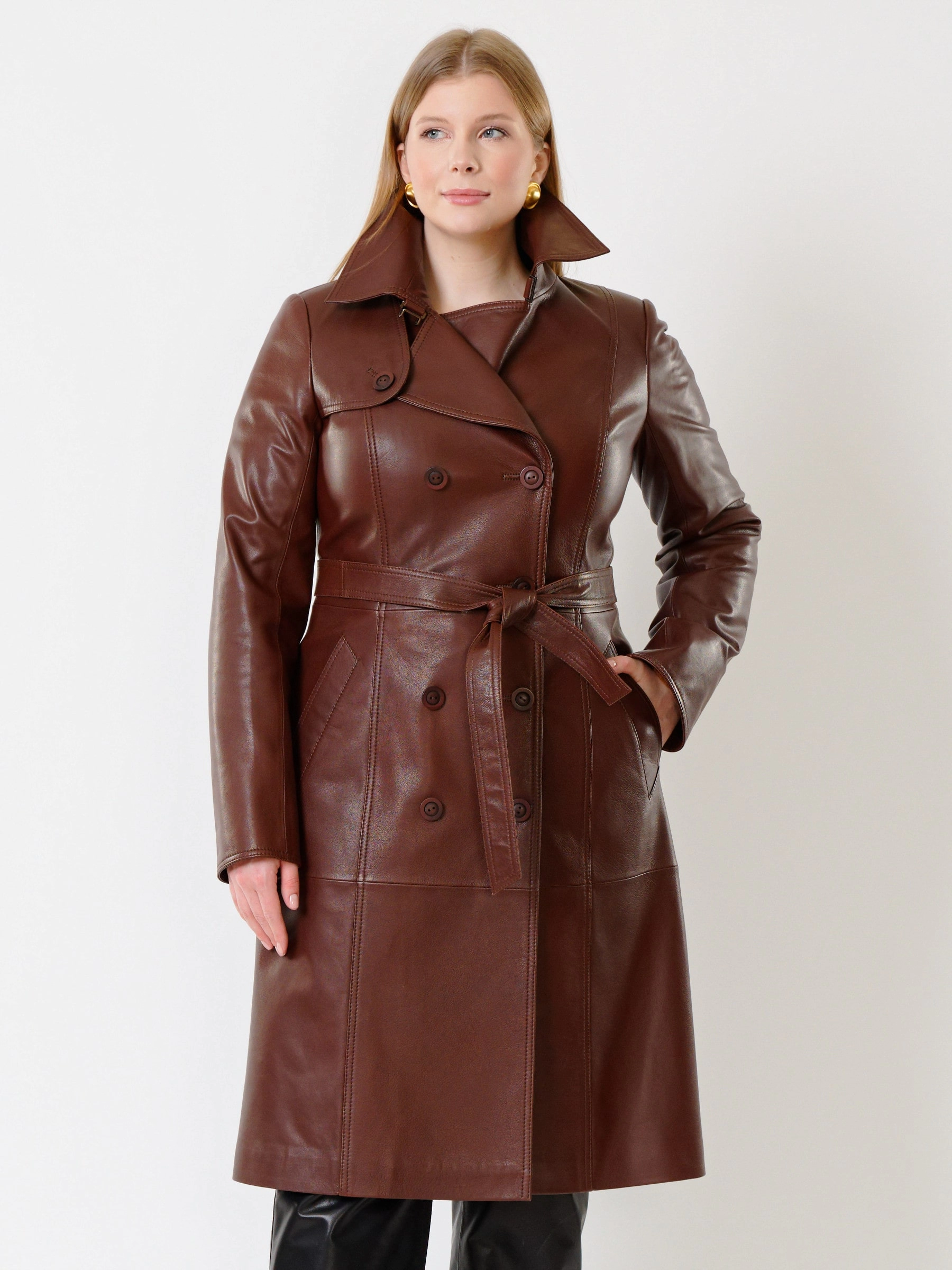 Кожаный двубортный женский плащ с поясом 3003, ореховый, размер 48, артикул 91362