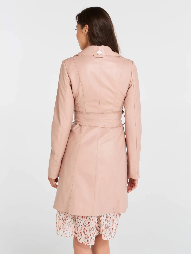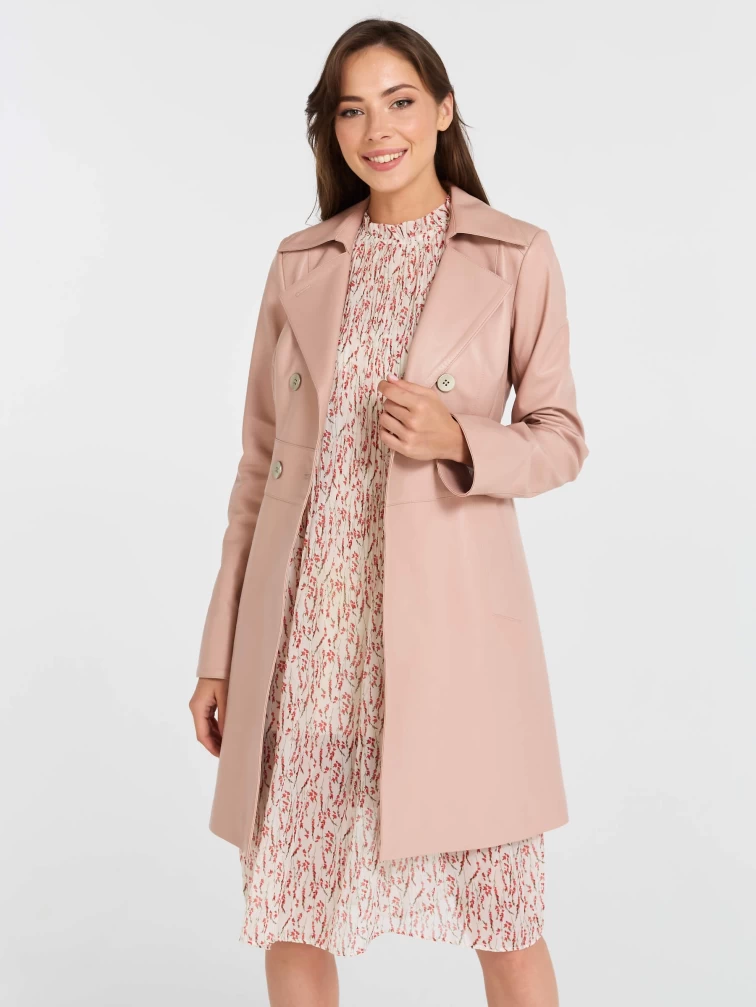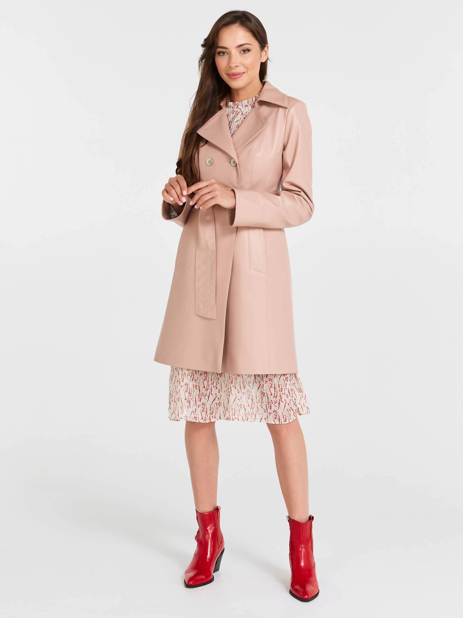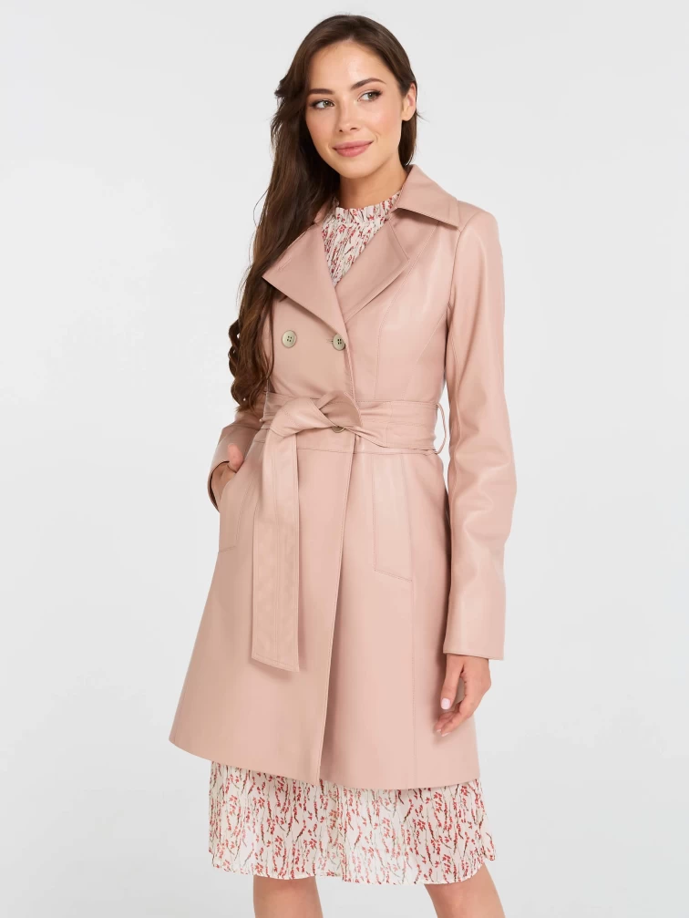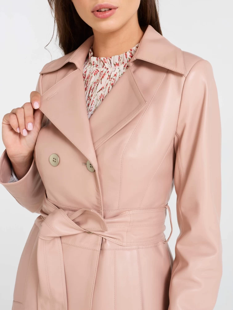 Кожаный двубортный женский плащ с поясом 338, пудровый, размер 44, артикул 18720