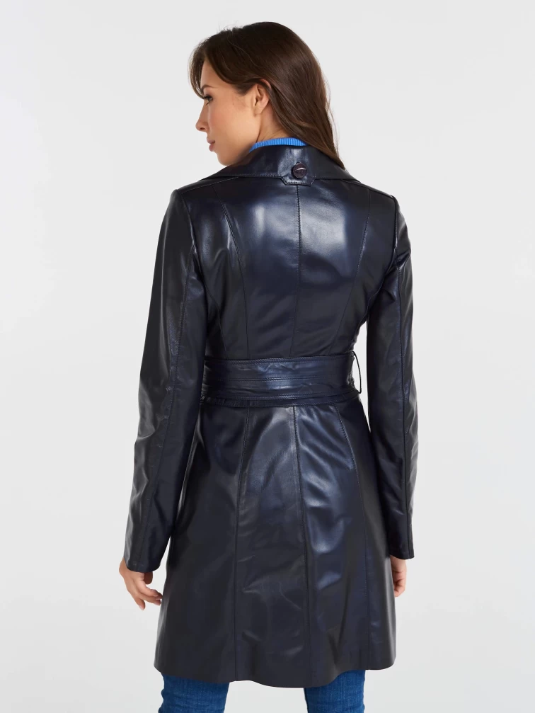 Кожаный двубортный женский плащ с поясом 338, синий перламутр, размер 46, артикул 90460