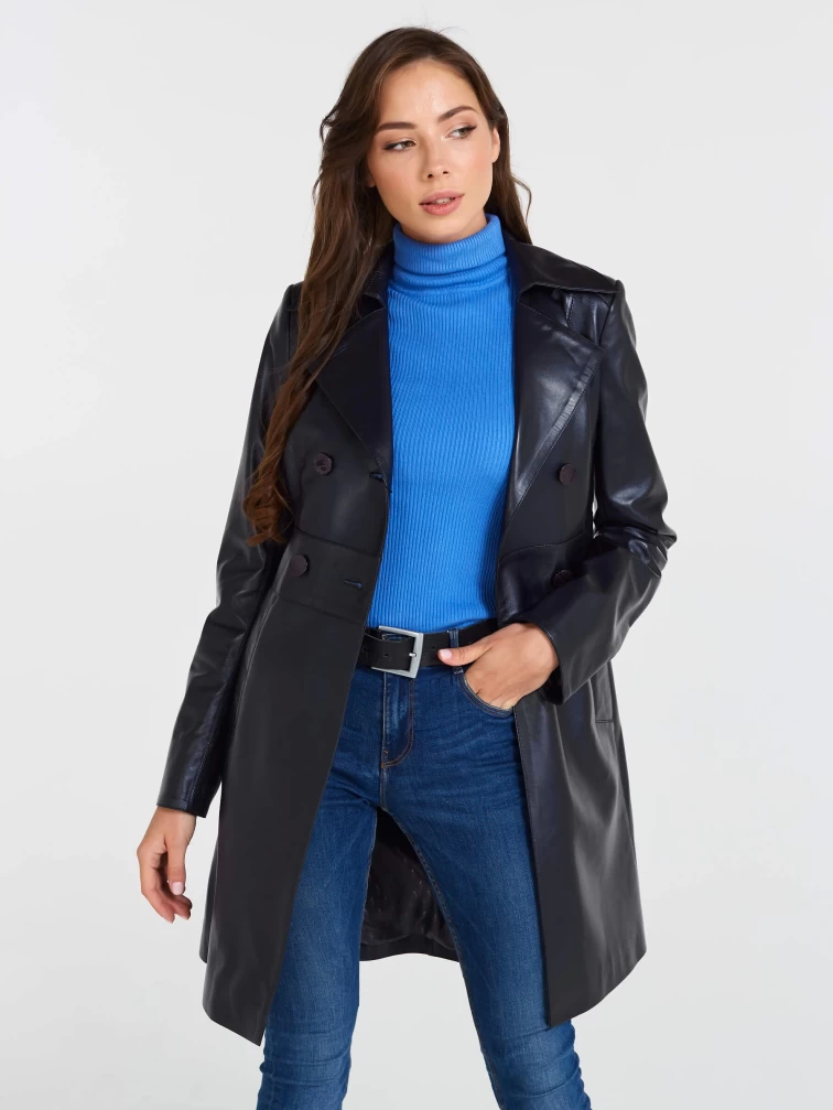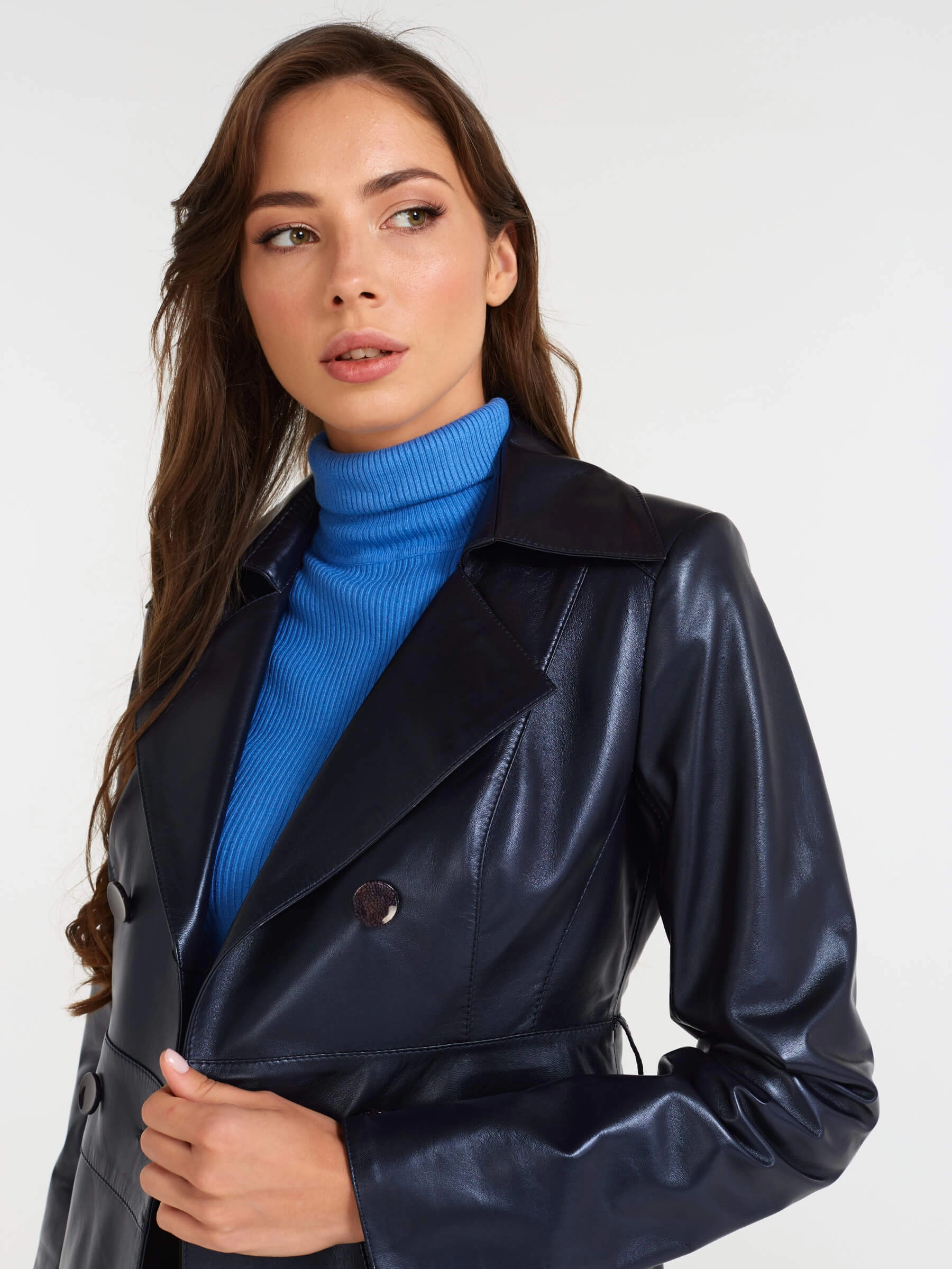Двубортный плащ из натуральной кожи цвета «синий перламутр» на пуговицах: приталенный силуэт с английским воротником, втачными рукавами с регулируемыми манжетами-отворотами, врезными карманами и широким поясом обеспечивает идеальную посадку. Изготовлен из кожи премиум-класса с мягкой выделкой. Сочетайте с водолазкой и джинсами или с платьем-миди и ботильонами.