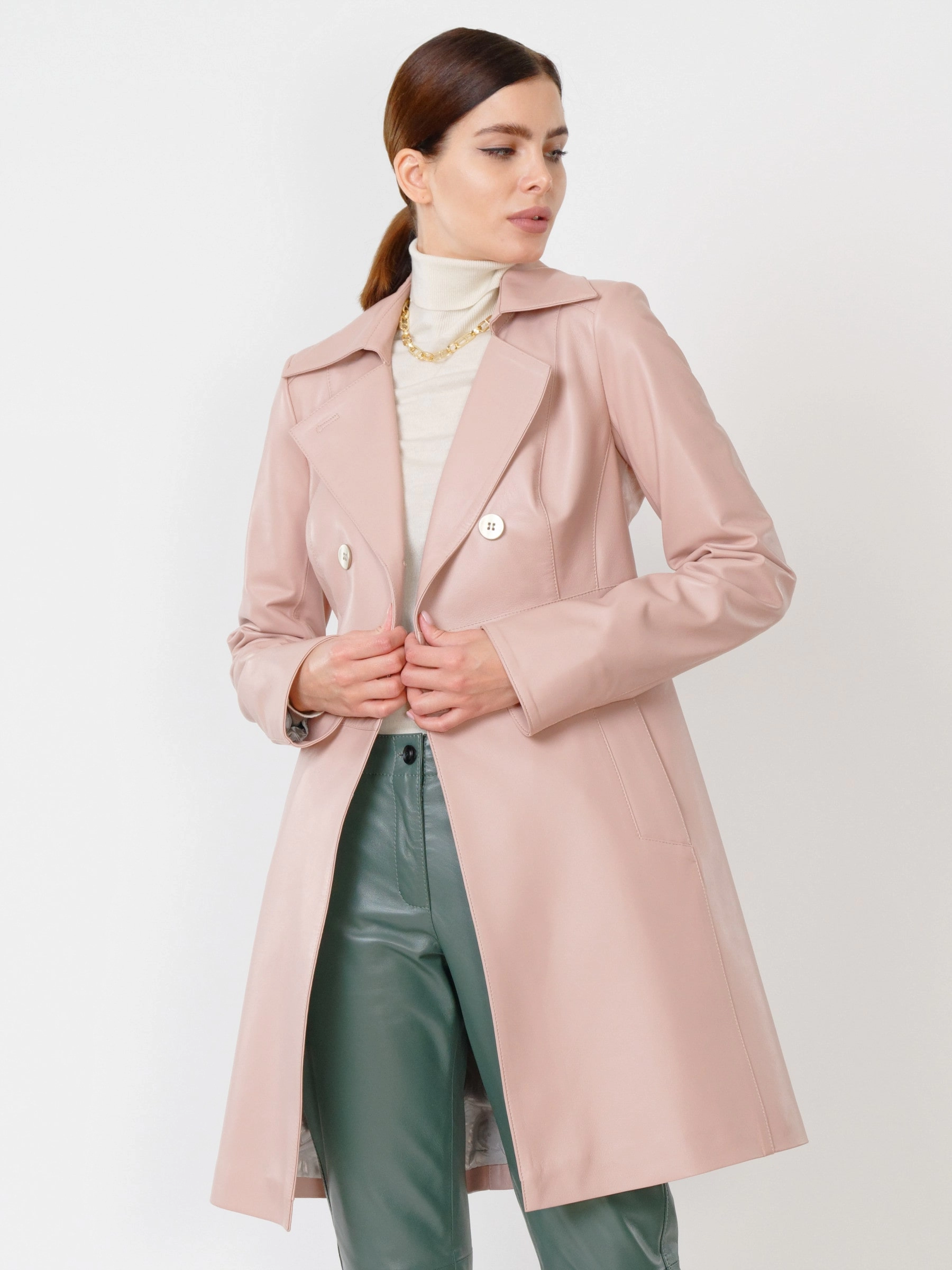 Кожаный двубортный женский плащ с поясом 338, пудровый, размер 44, артикул 90971