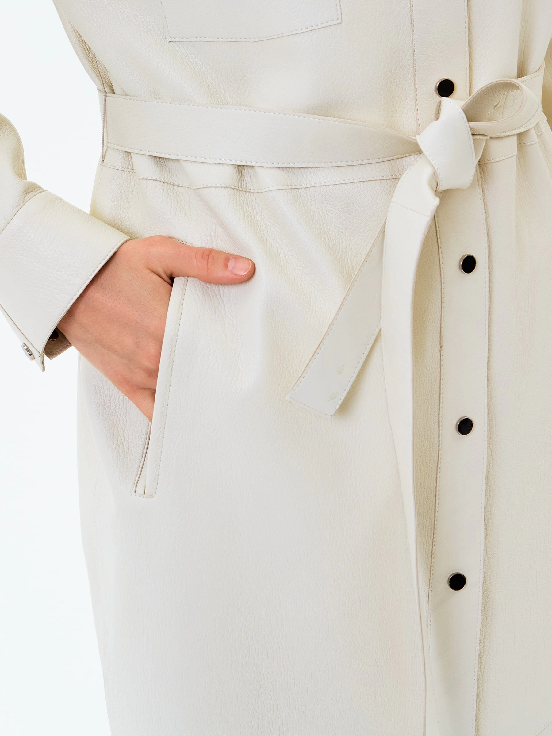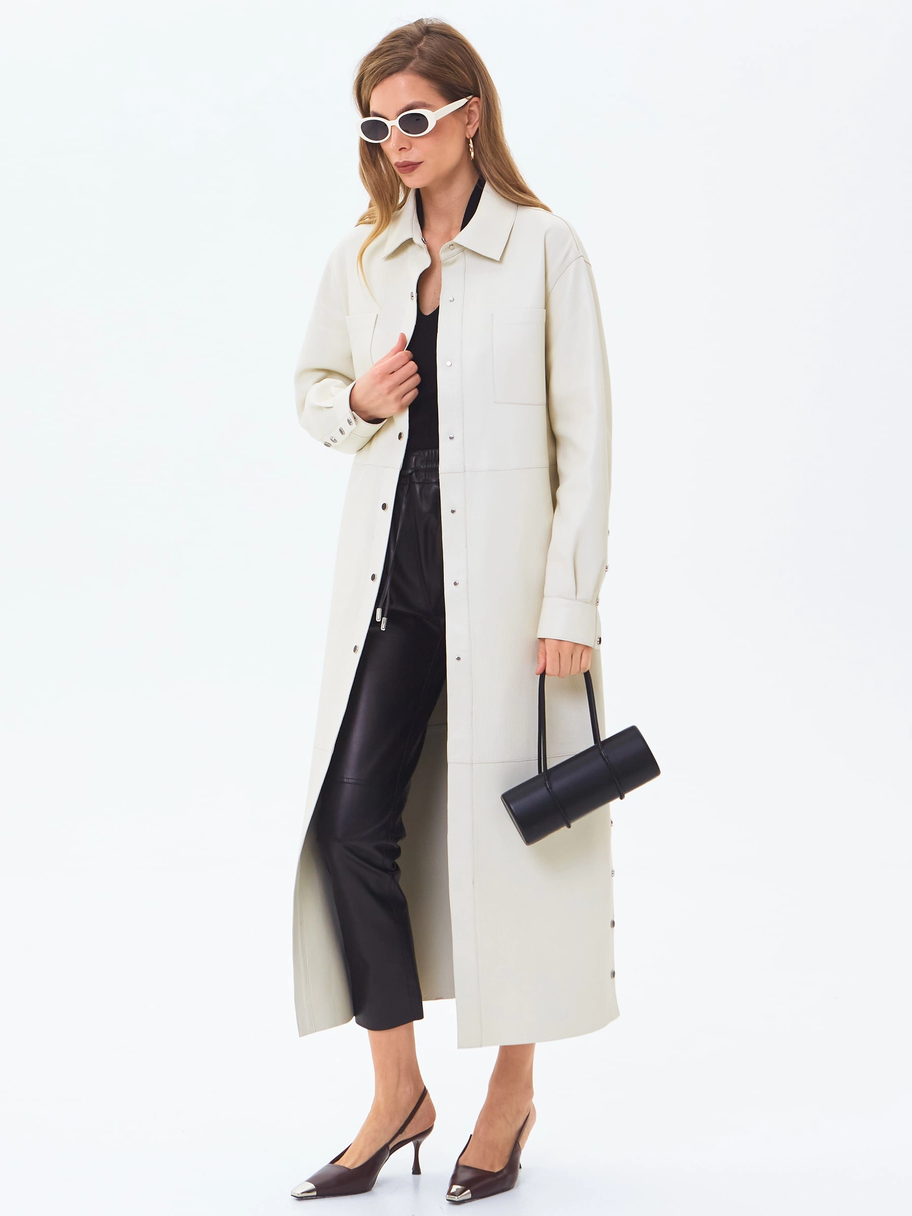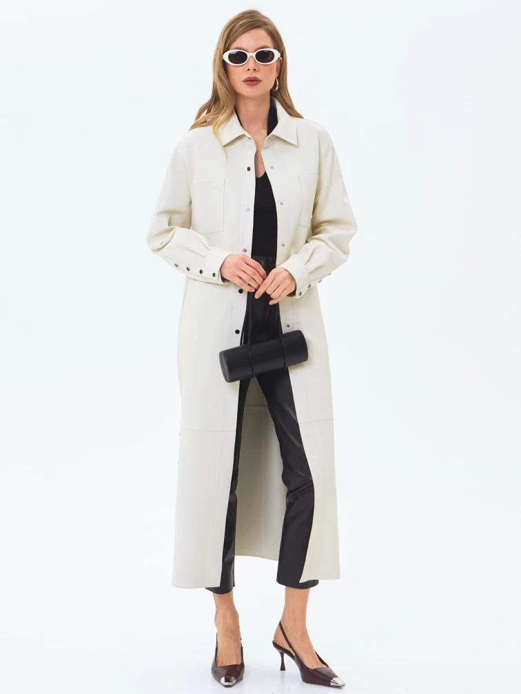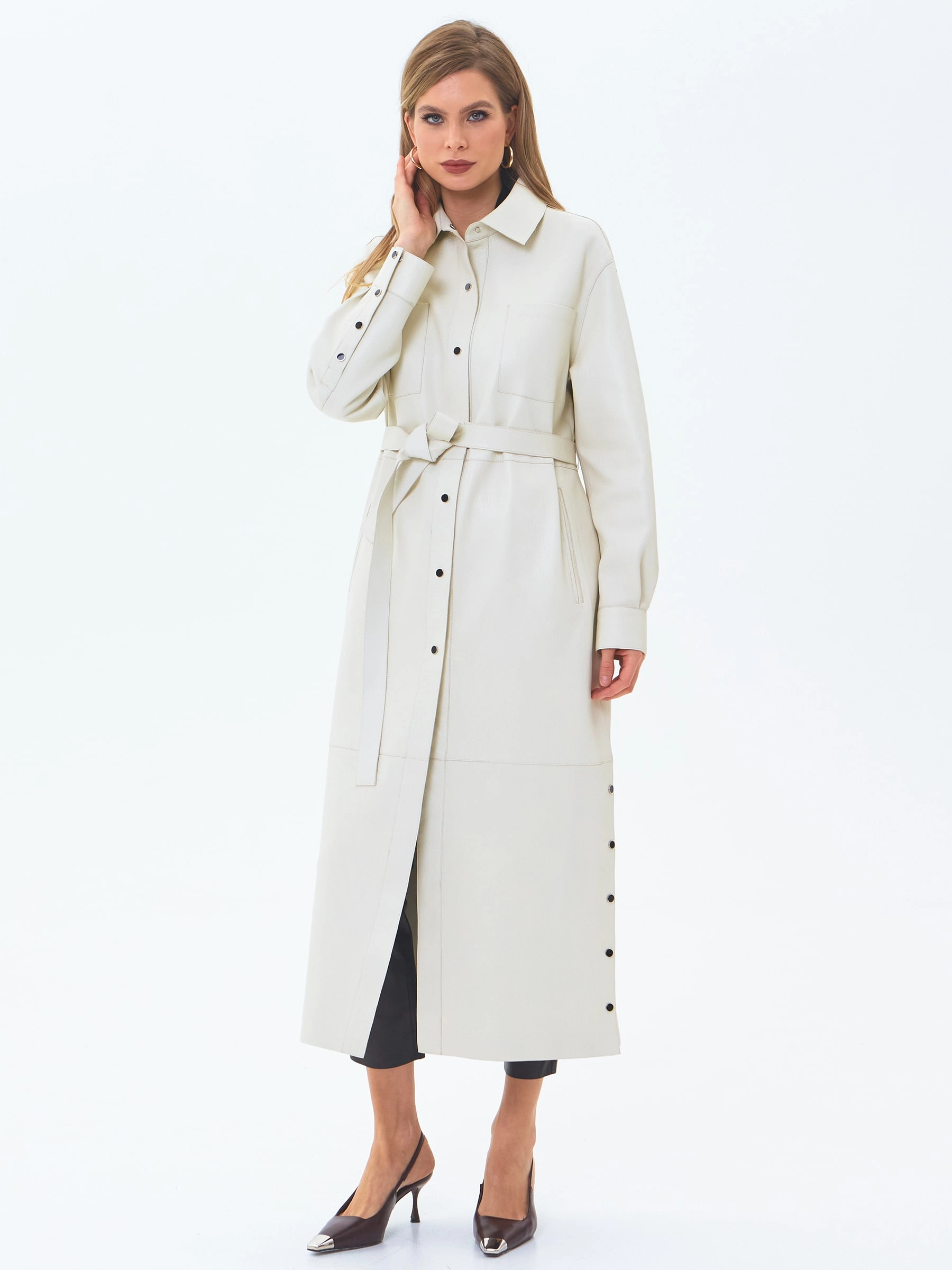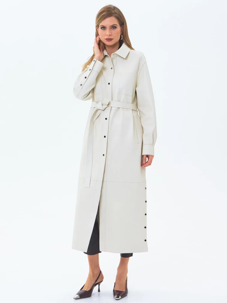 Товар плащ женский кожаный премиум класса 3091, белый, размер 44, артикул 24410 выполнен из натуральной кожи с застежкой кнопки. Рассчитан на сезон: весна-лето. Длина изделия 129 см, силуэт прямой.