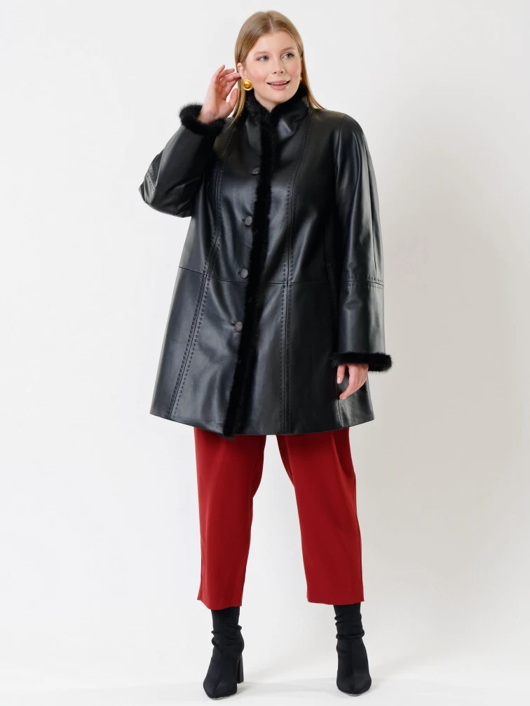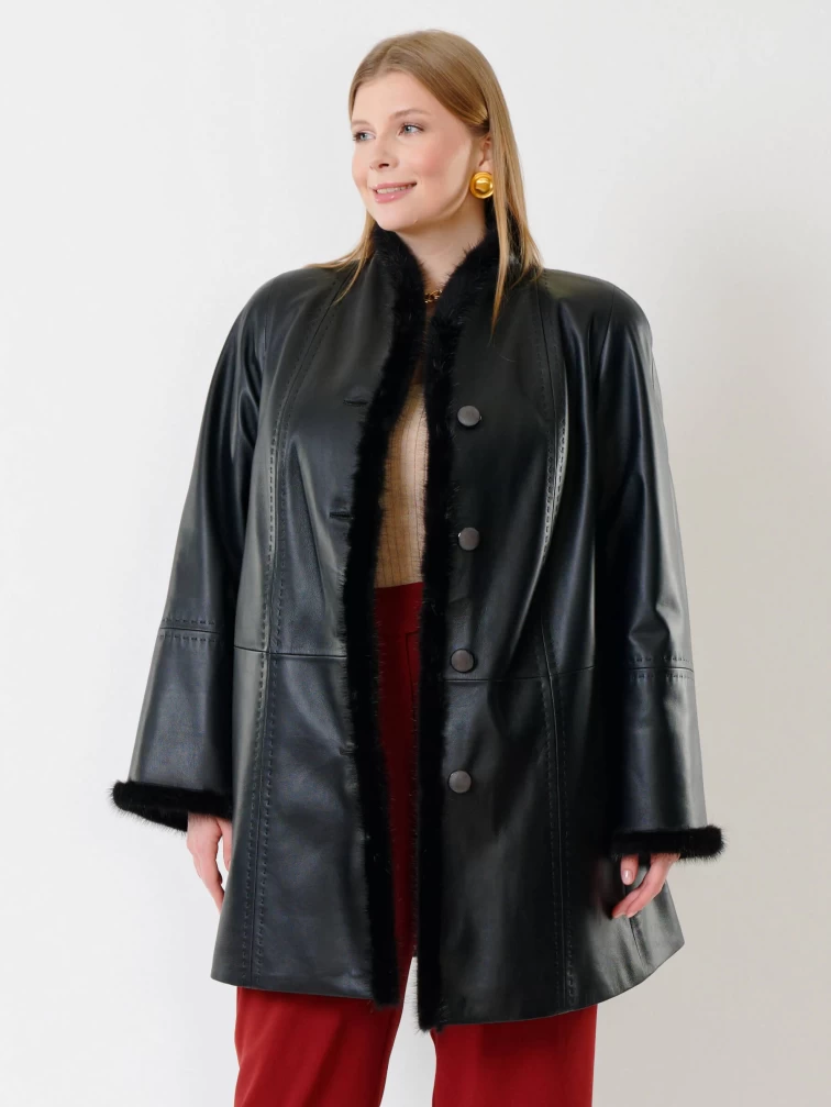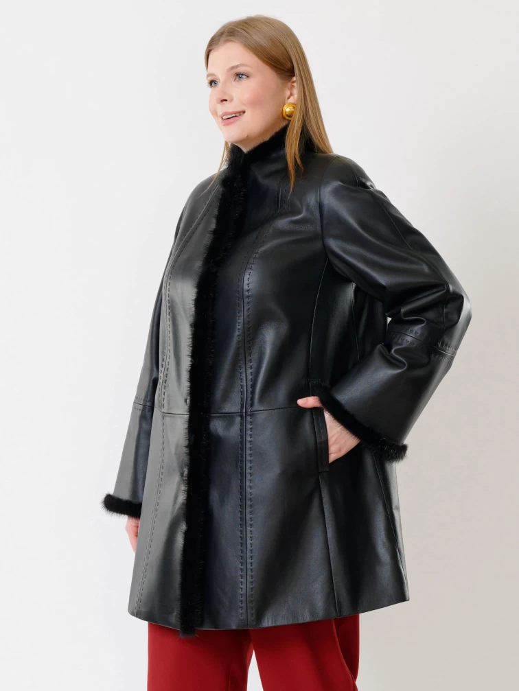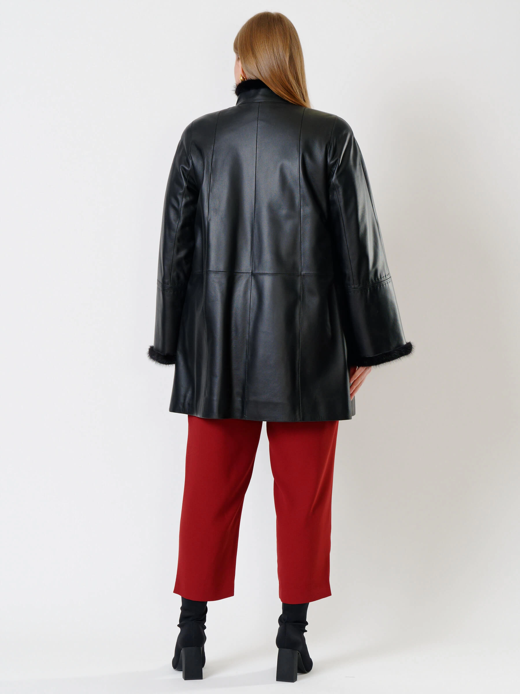 Утепленный женский кожаный плащ с норкой 312рс, черный, размер 44, артикул 23710