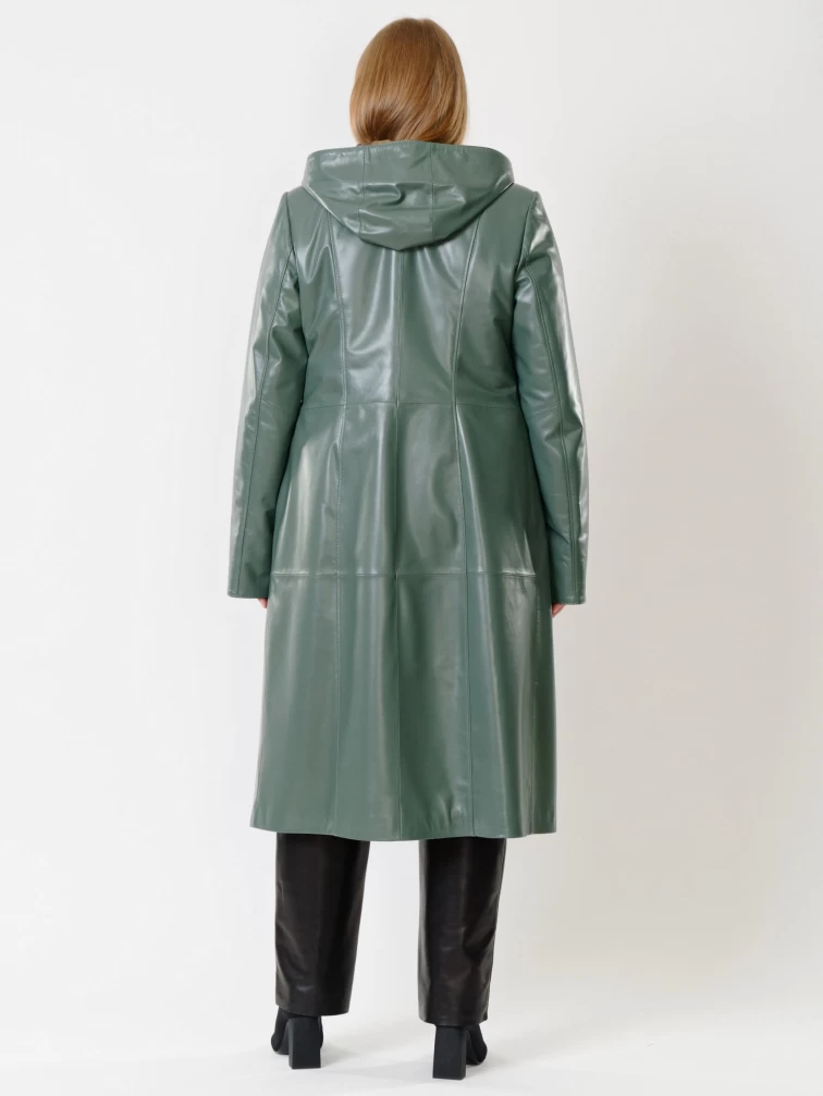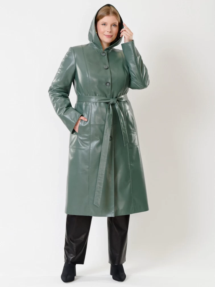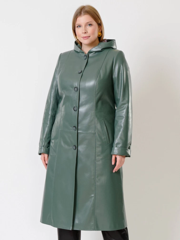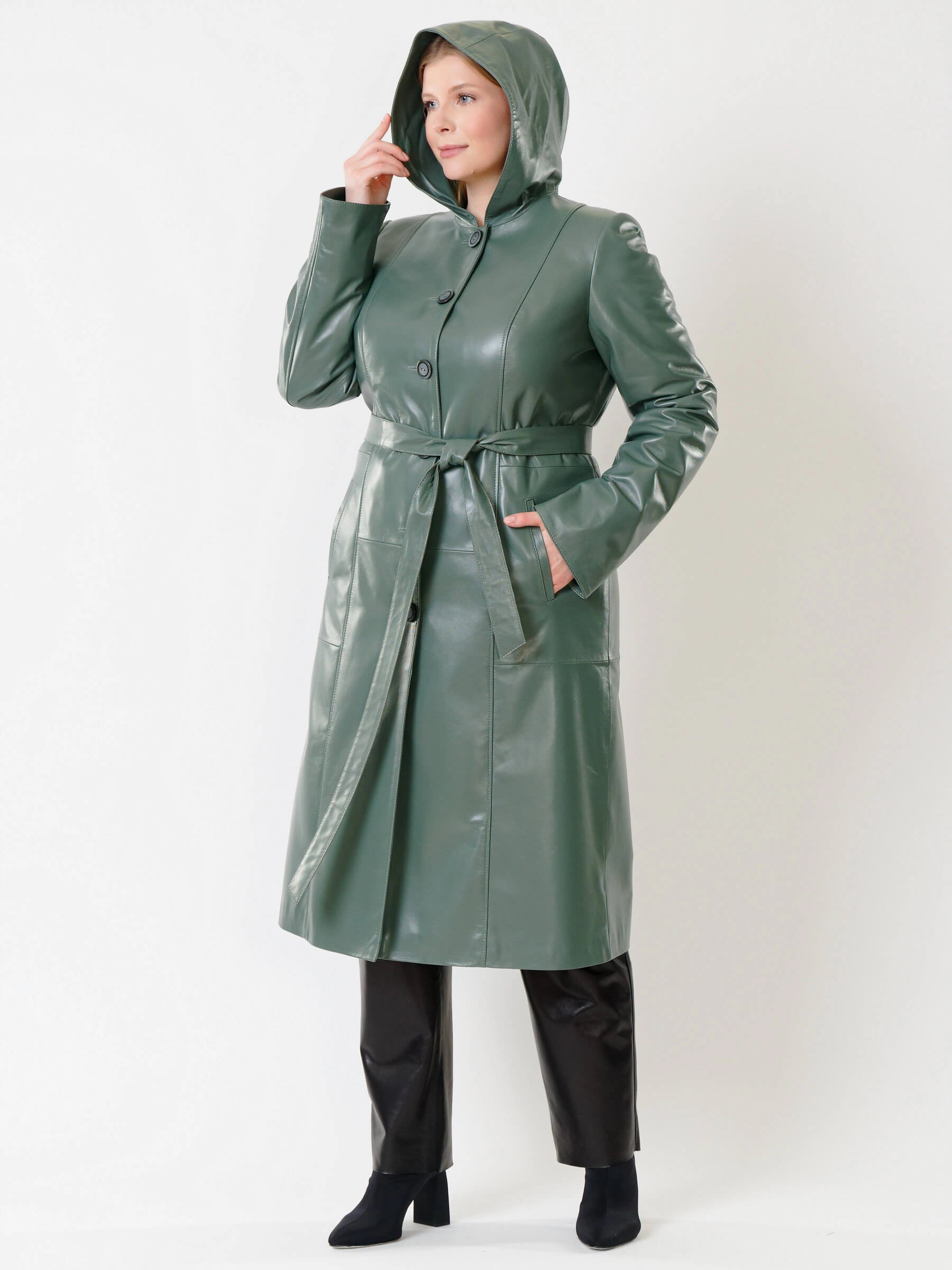 Кожаный женский утепленный плащ с капюшоном 380нш, оливковый, размер 50, артикул 91280