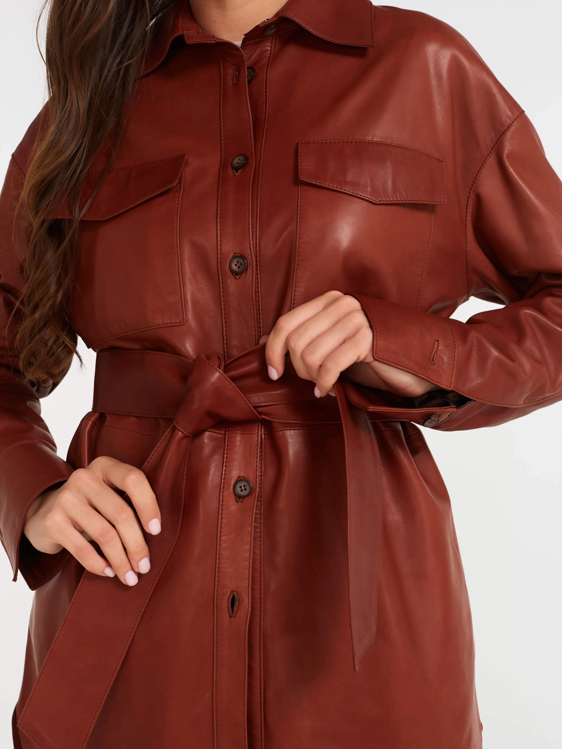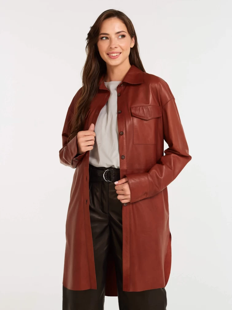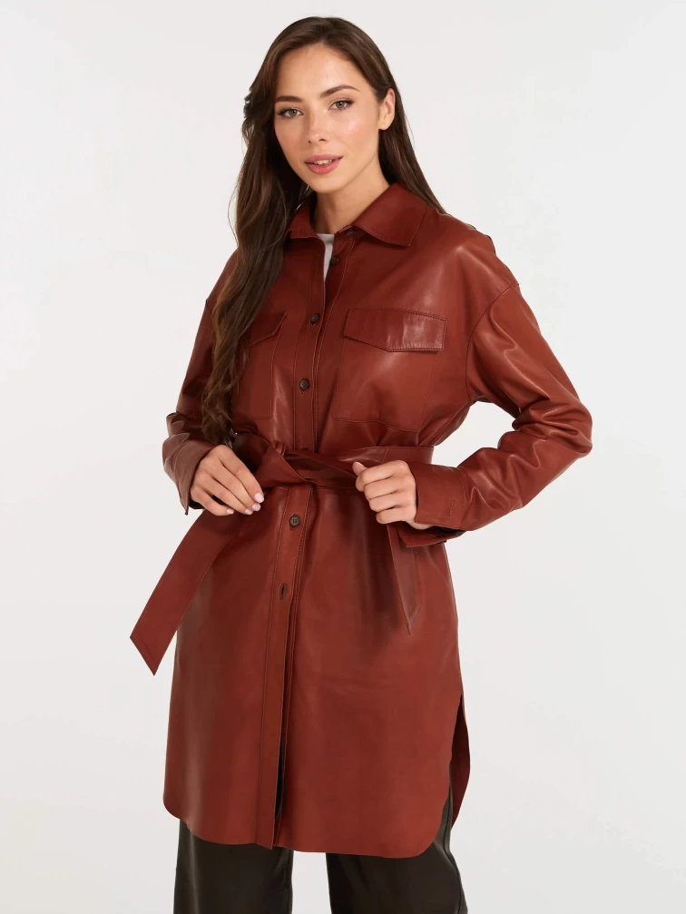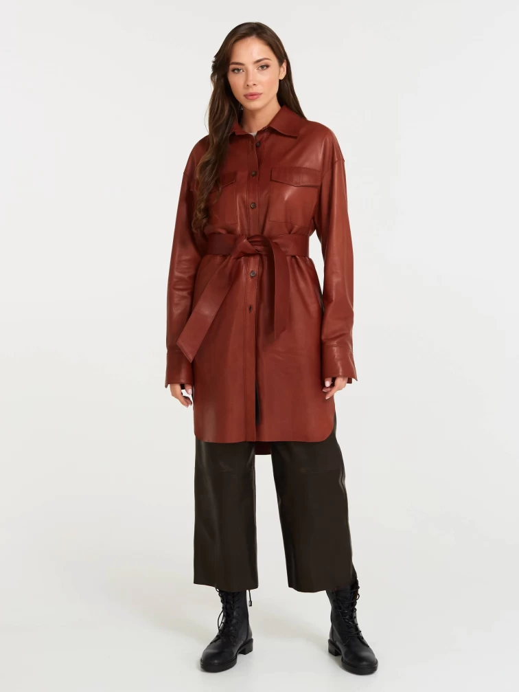 Элегантное платье-рубашка из натуральной кожи в теплом коньячном оттенке сочетает в себе утонченный прямой силуэт с практичными деталями. Модель с застежкой на пуговицах по всей длине дополнена стильными нагрудными карманами с клапанами, удобными врезными карманами и широким кожаным поясом, который подчеркивает талию. Боковые разрезы добавляют образу легкость и динамику, а универсальный дизайн позволяет создавать разные луки: сочетайте с облегающими лосинами и сапогами для смелого городского образа или с воздушными босоножками и деликатными аксессуарами для романтичного настроения.