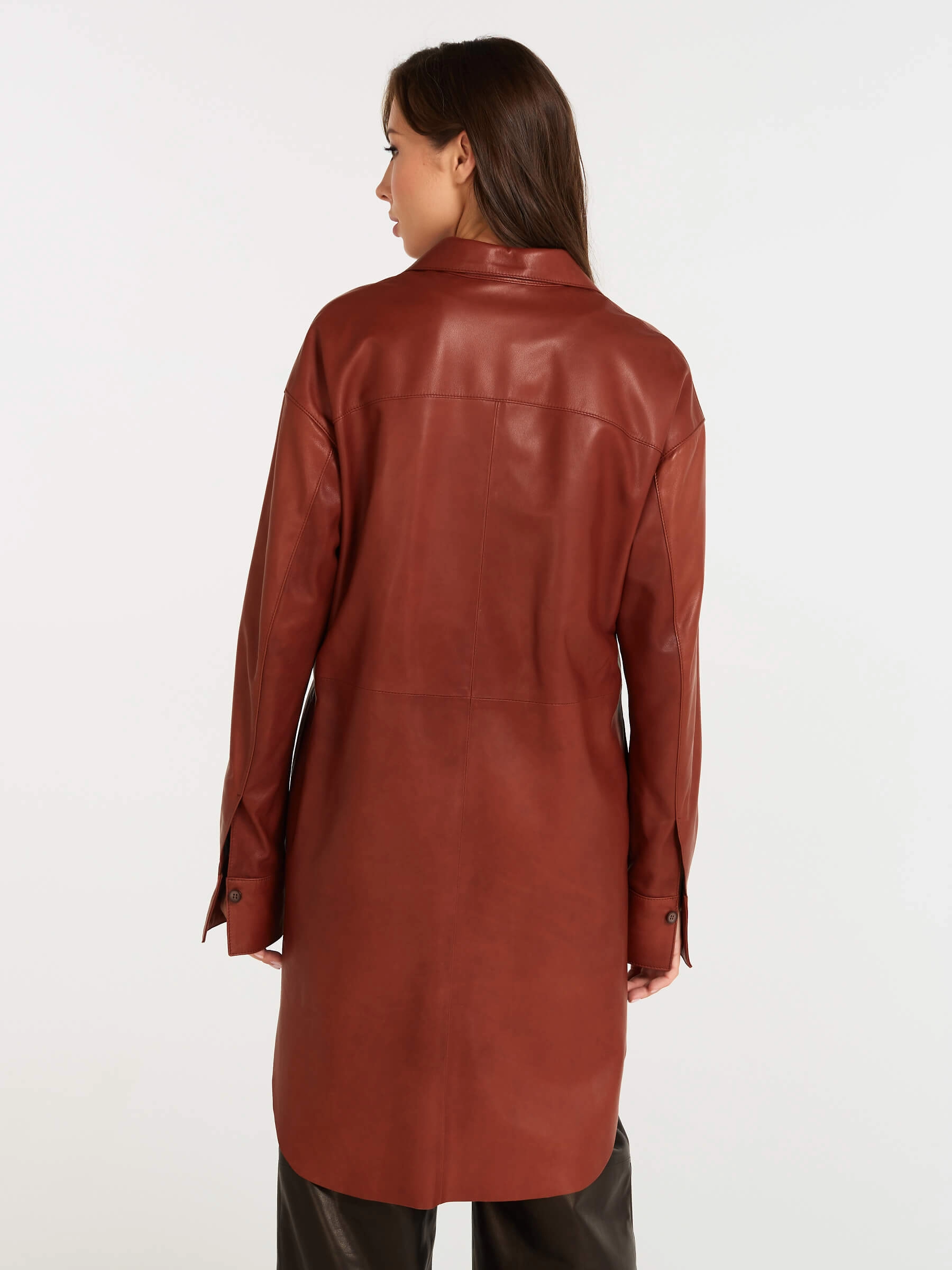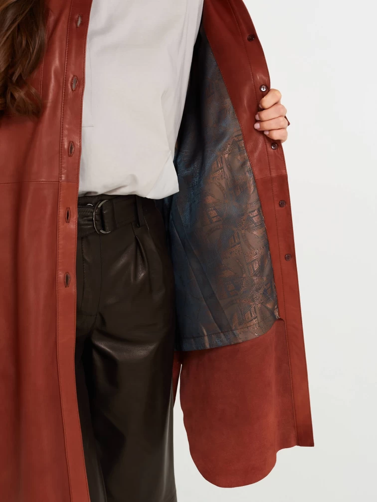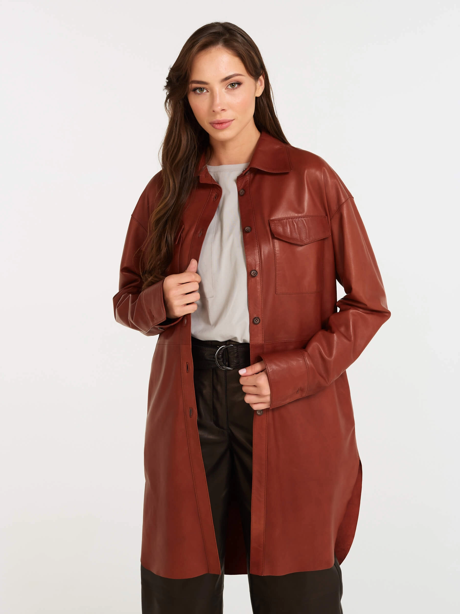 Элегантное платье-рубашка из натуральной кожи в теплом коньячном оттенке сочетает в себе утонченный прямой силуэт с практичными деталями. Модель с застежкой на пуговицах по всей длине дополнена стильными нагрудными карманами с клапанами, удобными врезными карманами и широким кожаным поясом, который подчеркивает талию. Боковые разрезы добавляют образу легкость и динамику, а универсальный дизайн позволяет создавать разные луки: сочетайте с облегающими лосинами и сапогами для смелого городского образа или с воздушными босоножками и деликатными аксессуарами для романтичного настроения.