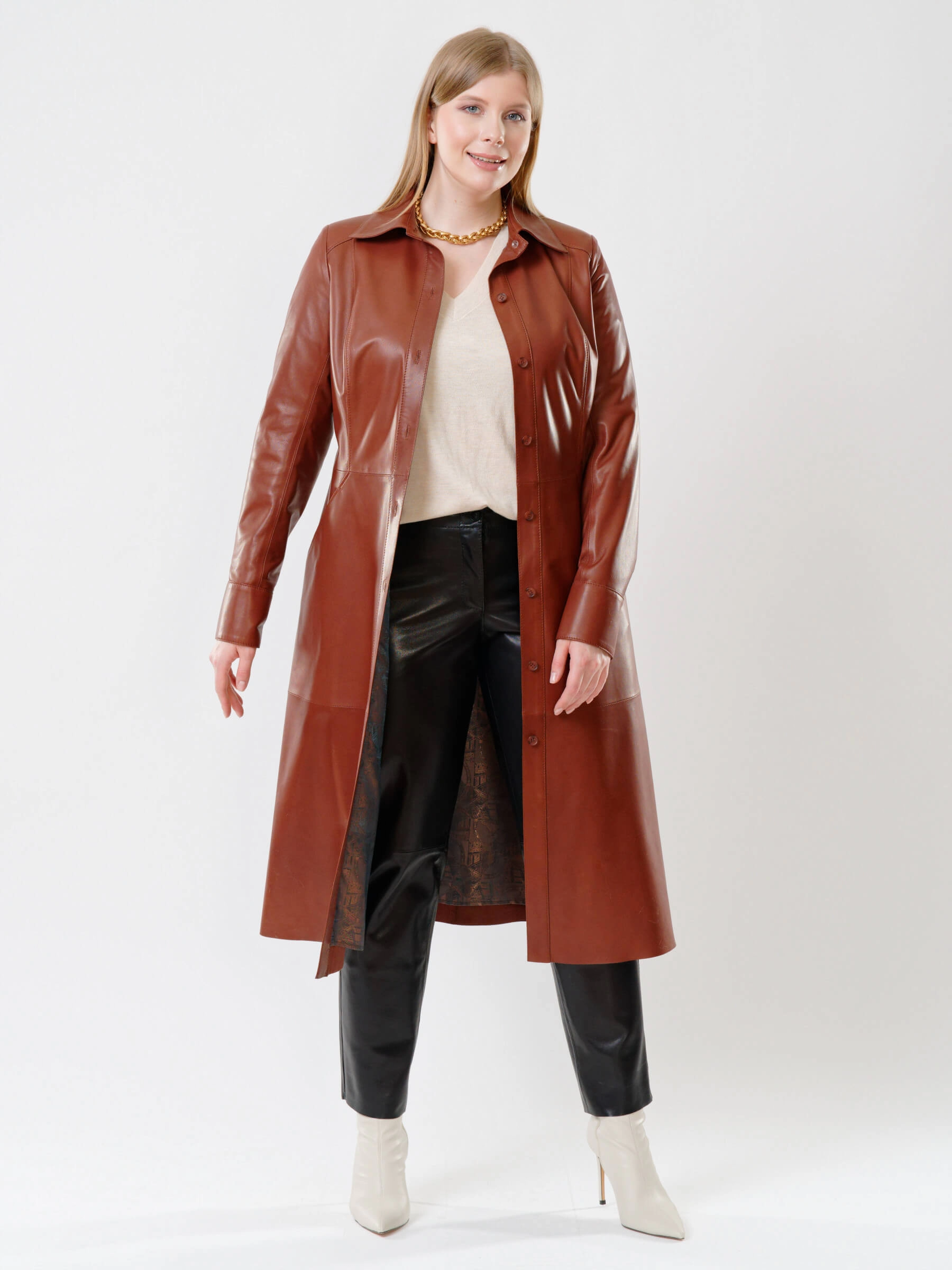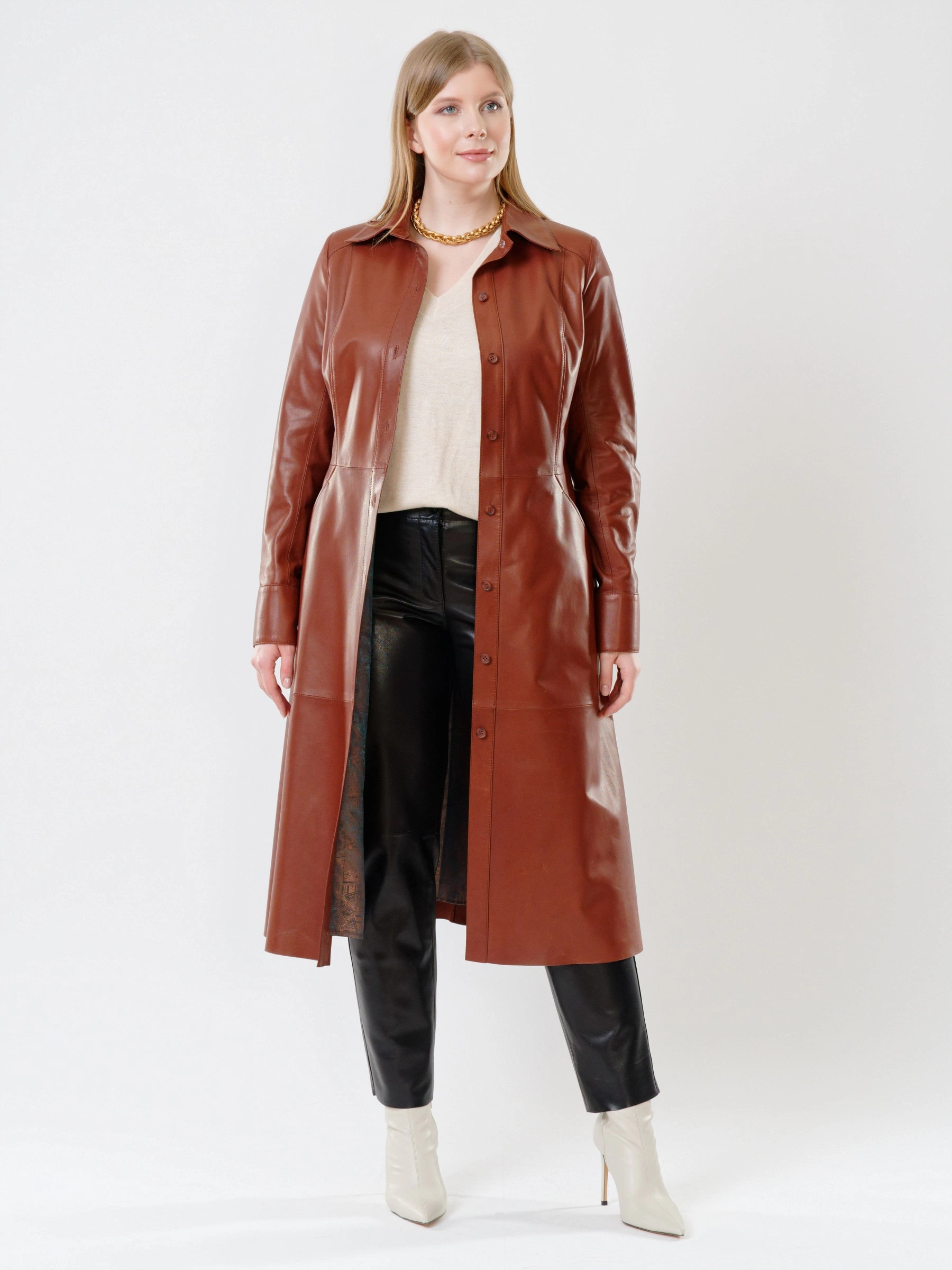 Товар женское кожаное платье рубашка из натуральной кожи 02, коричневое, размер 50, артикул 91460 выполнен из натуральной кожи с застежкой пуговицы. Рассчитан на сезон: весна-лето. Длина изделия 117 см, силуэт полуприлегающий.