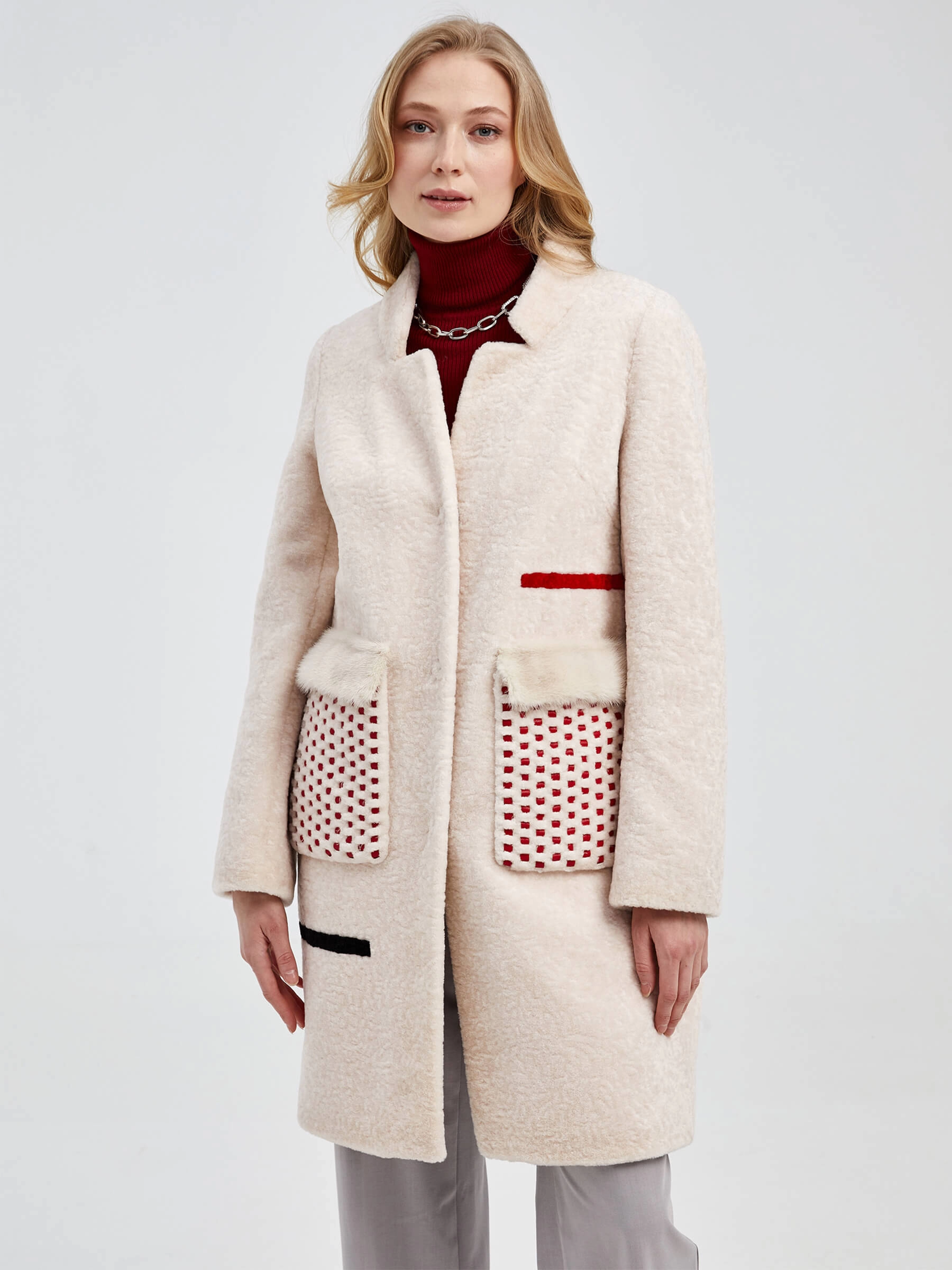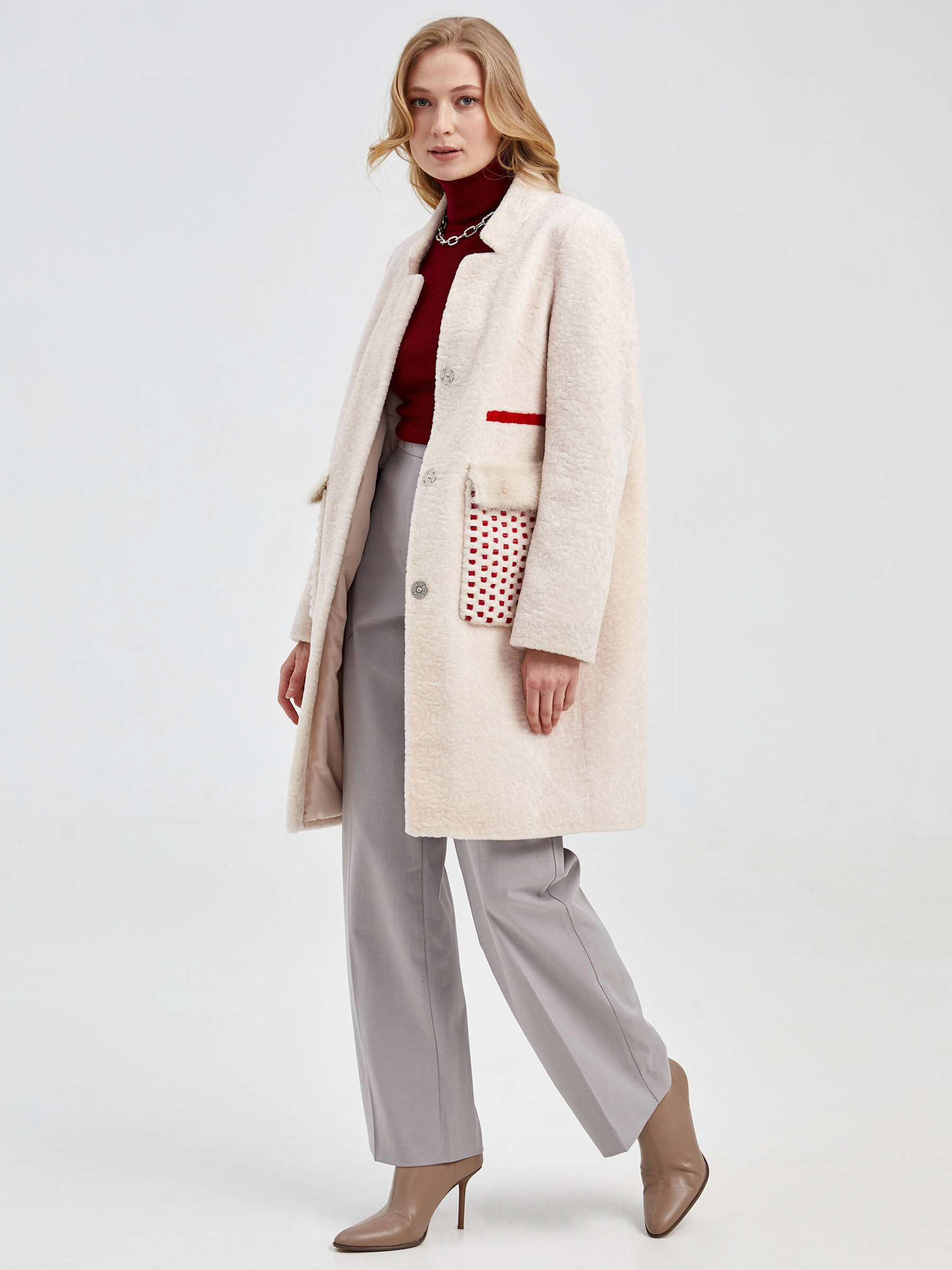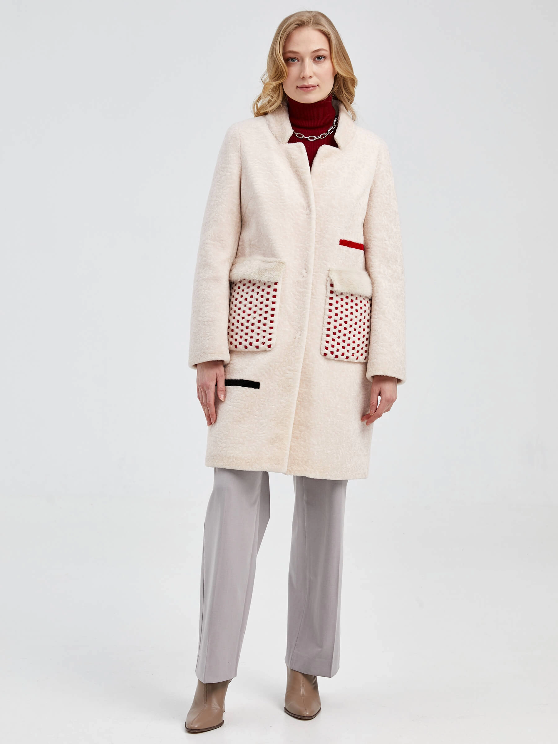 Стильное полупальто из мягкой шерсти жемчужного оттенка с прямым силуэтом и отделкой из натурального меха норки. Укороченная длина 75-90 см, крупные накладные карманы с кожаными вставками и застёжка на кнопках формируют универсальный образ. Низкая стойка воротника добавляет лаконичности — сочетайте его с кожаными брюками и ботинками на платформе для дерзкого образа или с джинсами-скинни и кроссовками для повседневного стиля.