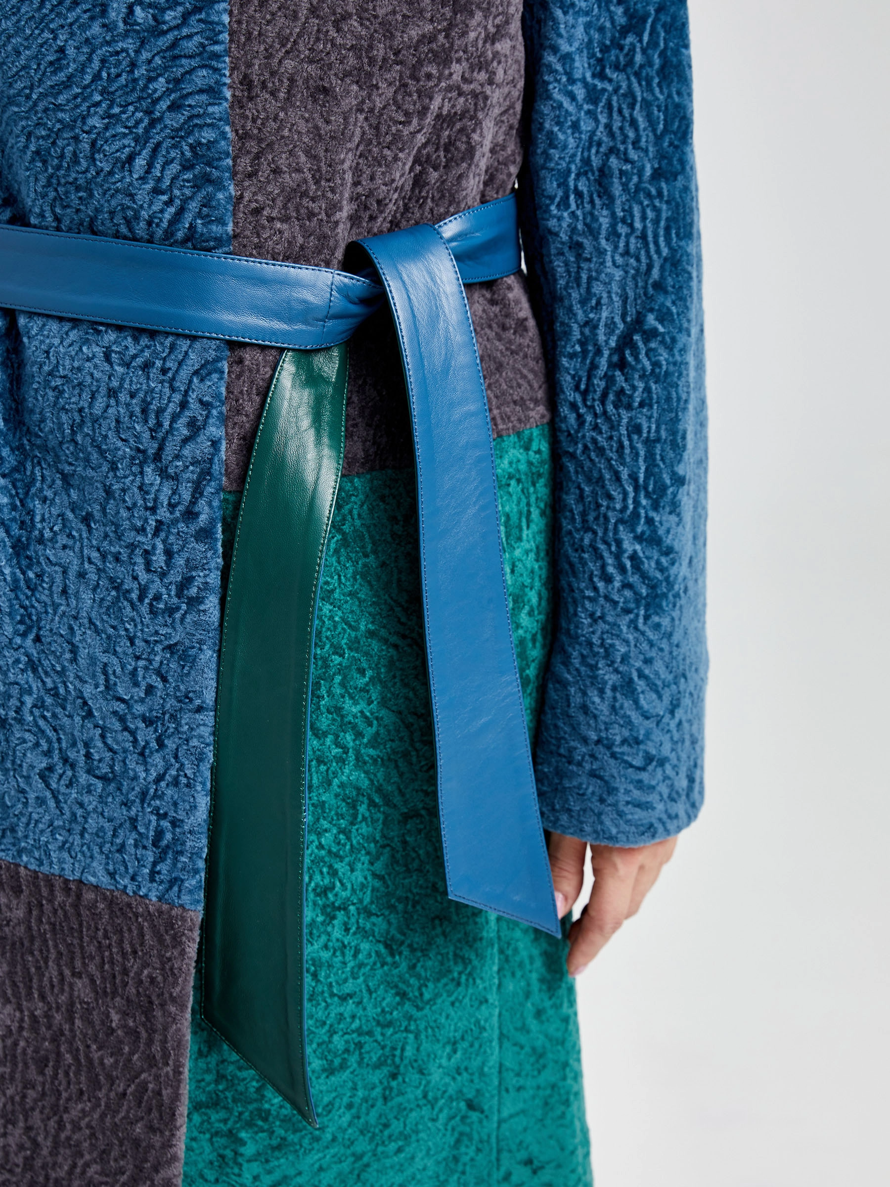Комбинированная женская дубленка из астрагана с поясом 33мех, мультиколор, размер 40, артикул 17380