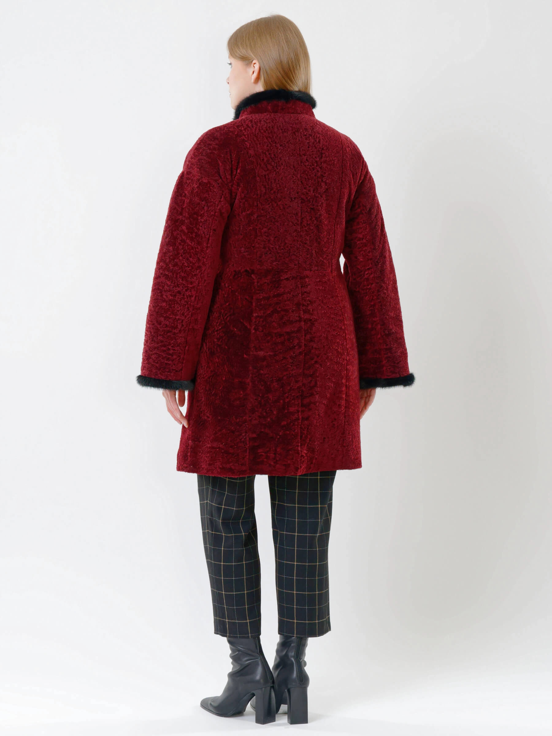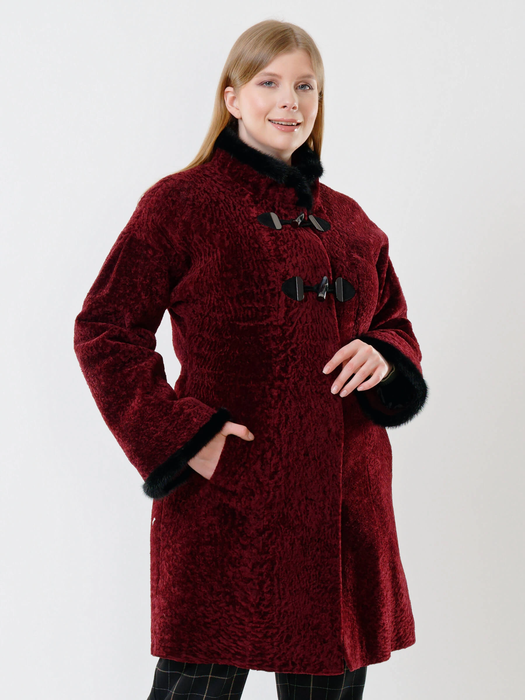 Товар женская дубленка из астрагана с отделкой из меха норки 34мех, бордовая, размер 46, артикул 17390 выполнен из астраган с застежкой пуговицы. Рассчитан на сезон: осень-зима. Длина изделия 90 см, силуэт полуприлегающий.