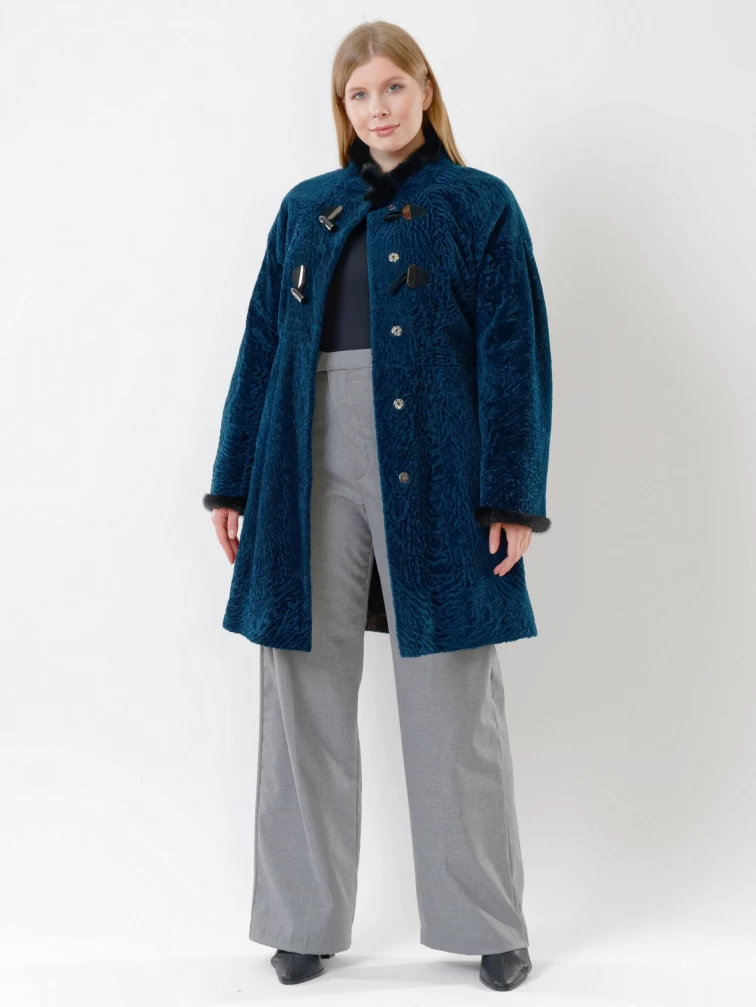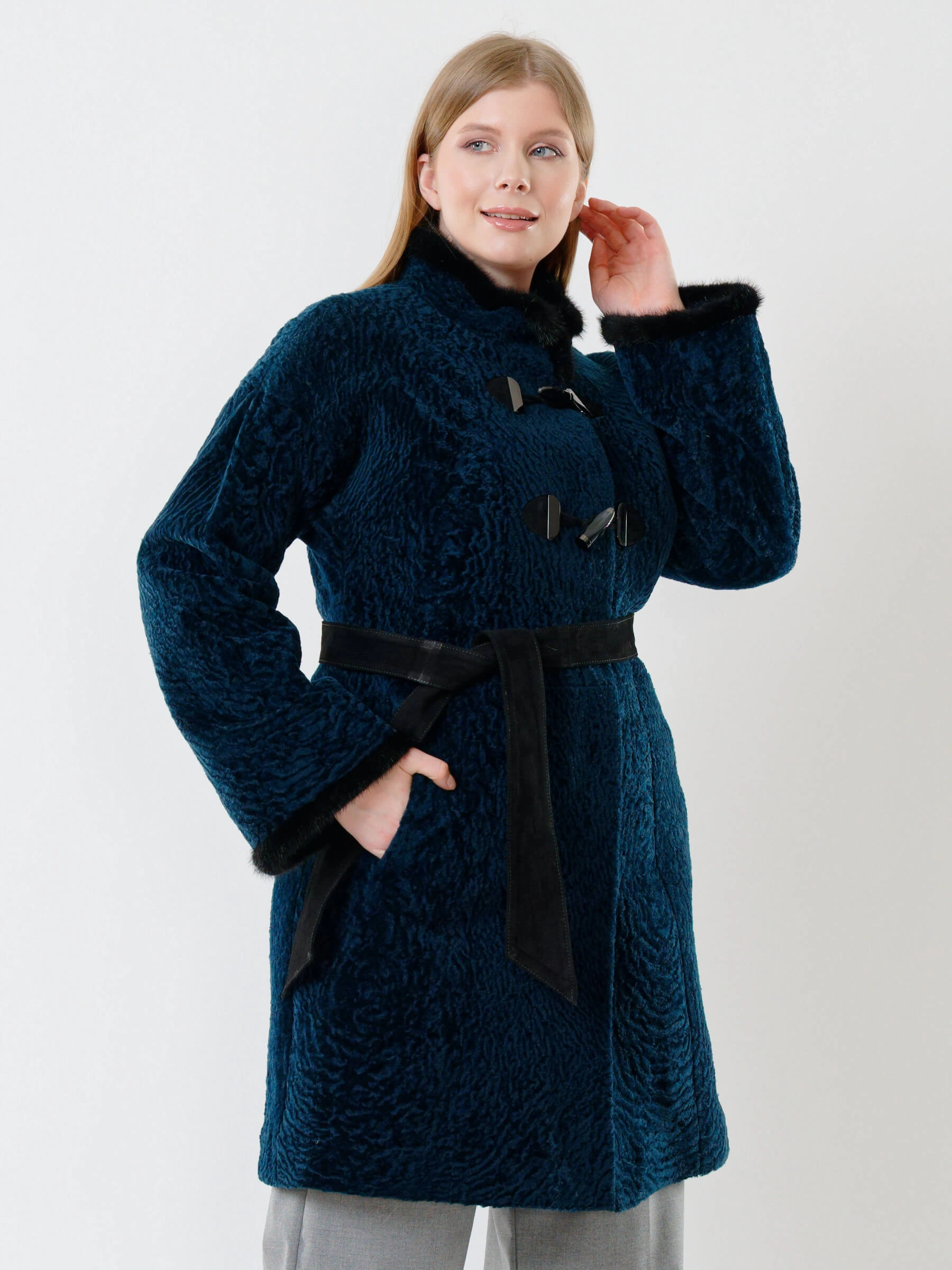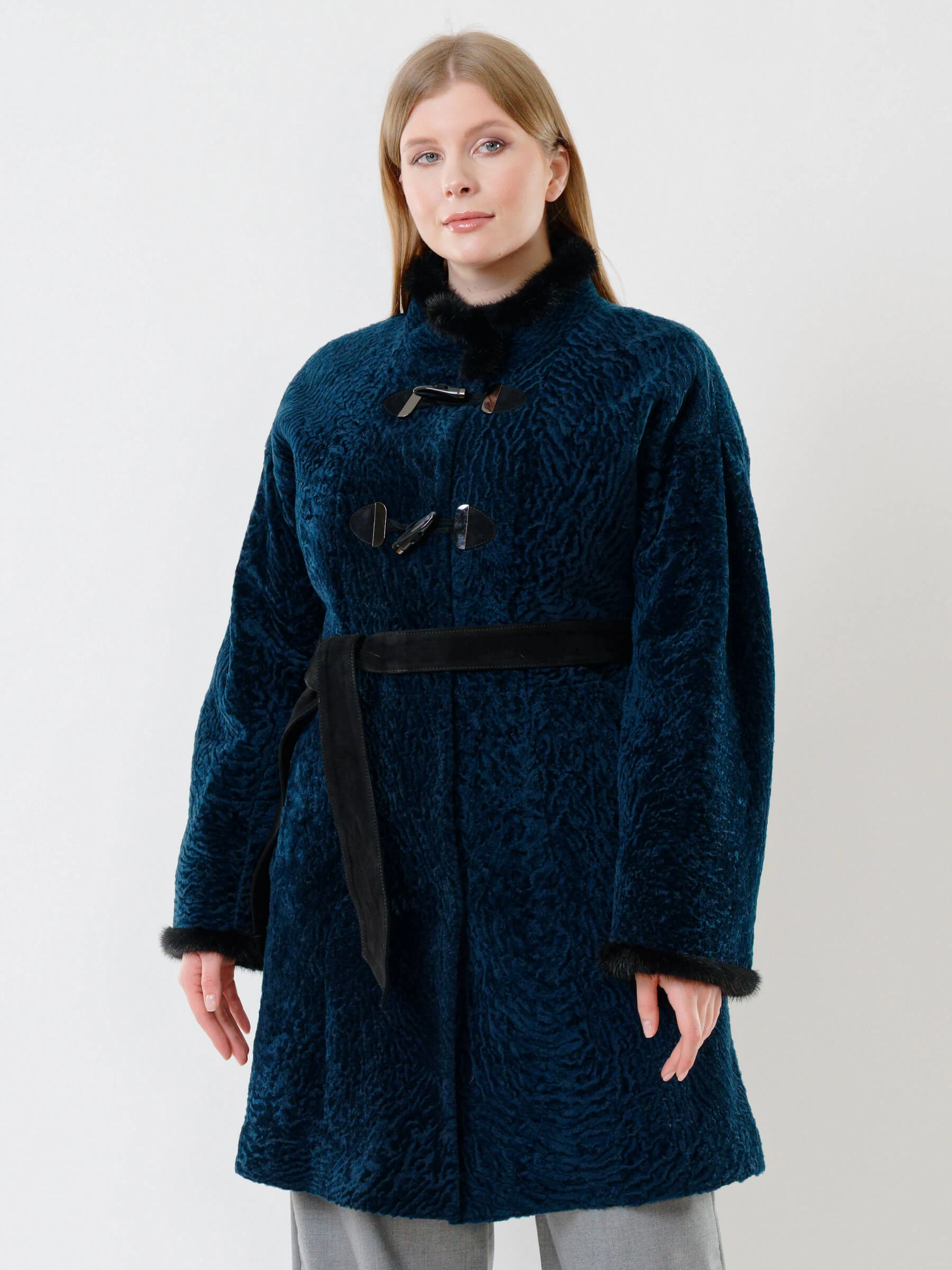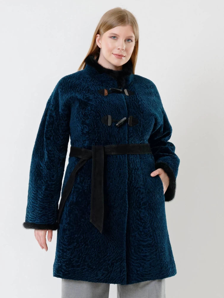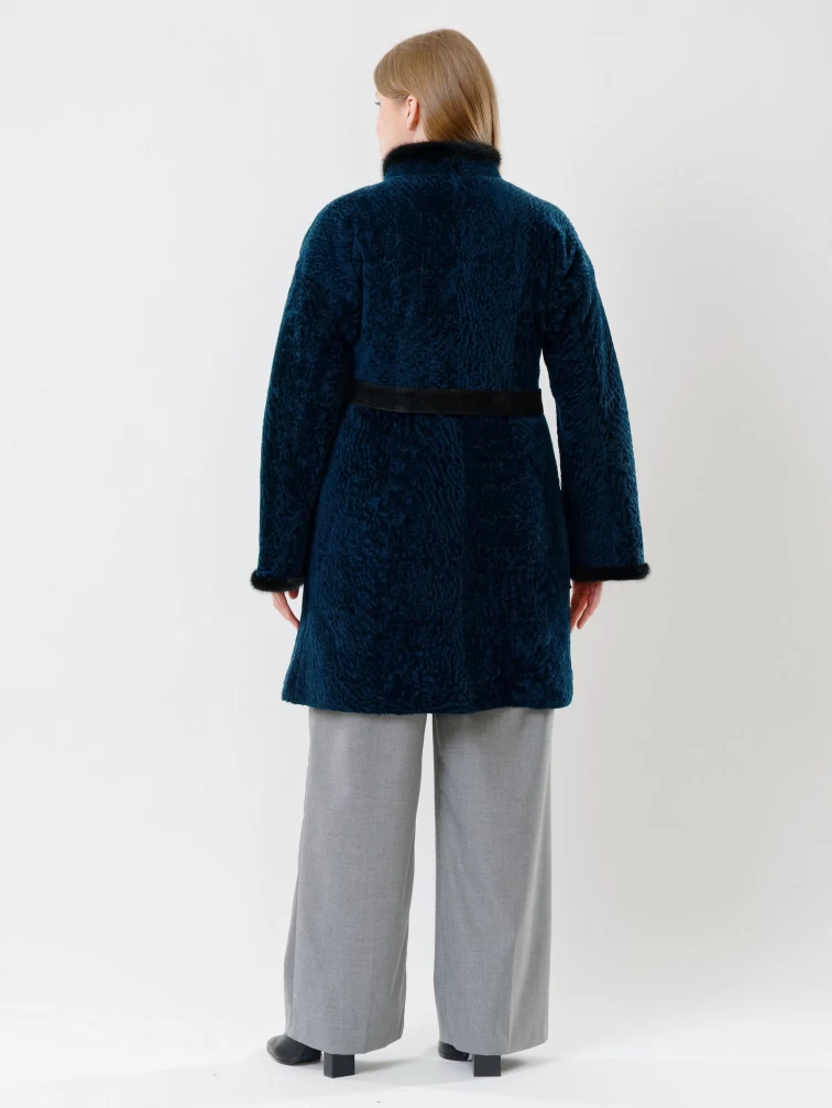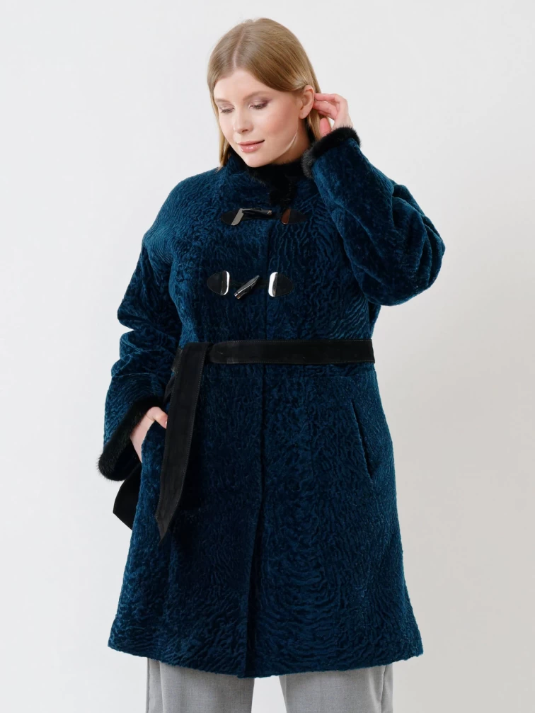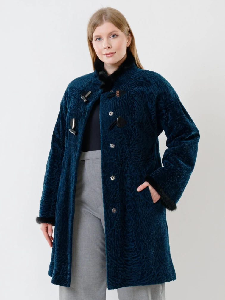 Товар женская дубленка из астрагана с отделкой из меха норки 34мех, синяя, размер 46, артикул 17230 выполнен из астраган с застежкой пуговицы. Рассчитан на сезон: осень-зима. Длина изделия 90 см, силуэт полуприлегающий.