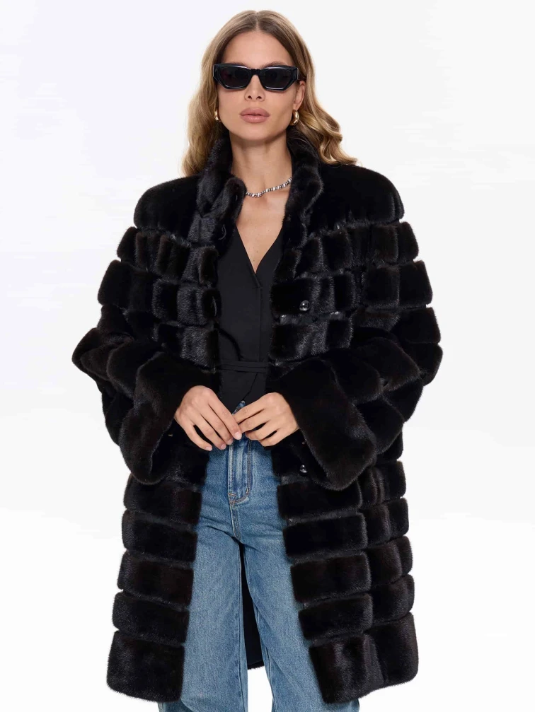 Женская шуба BRASCHI из натурального меха норки выполнена по уникальной технологии поперечной укладки меха, представленная в классическом прямом силуэте универсальной длины миди около 90 см. Поперечное расположение шкурок создает эффектный пледовый рисунок, обеспечивая невероятную мягкость, пластичность и роскошный объем. Модель оснащена строгим вертикальным воротником-стойкой без капюшона, а отсутствие декоративной отделки подчеркивает красоту натурального меха. Шуба застегивается на крупные пуговицы и имеет комфортную вискозную подкладку, выполненная в глубоком теплом оттенке мокко, который особенно выигрышно сочетается с уникальной поперечной укладкой меха, что делает ее идеальным выбором для холодной зимы.