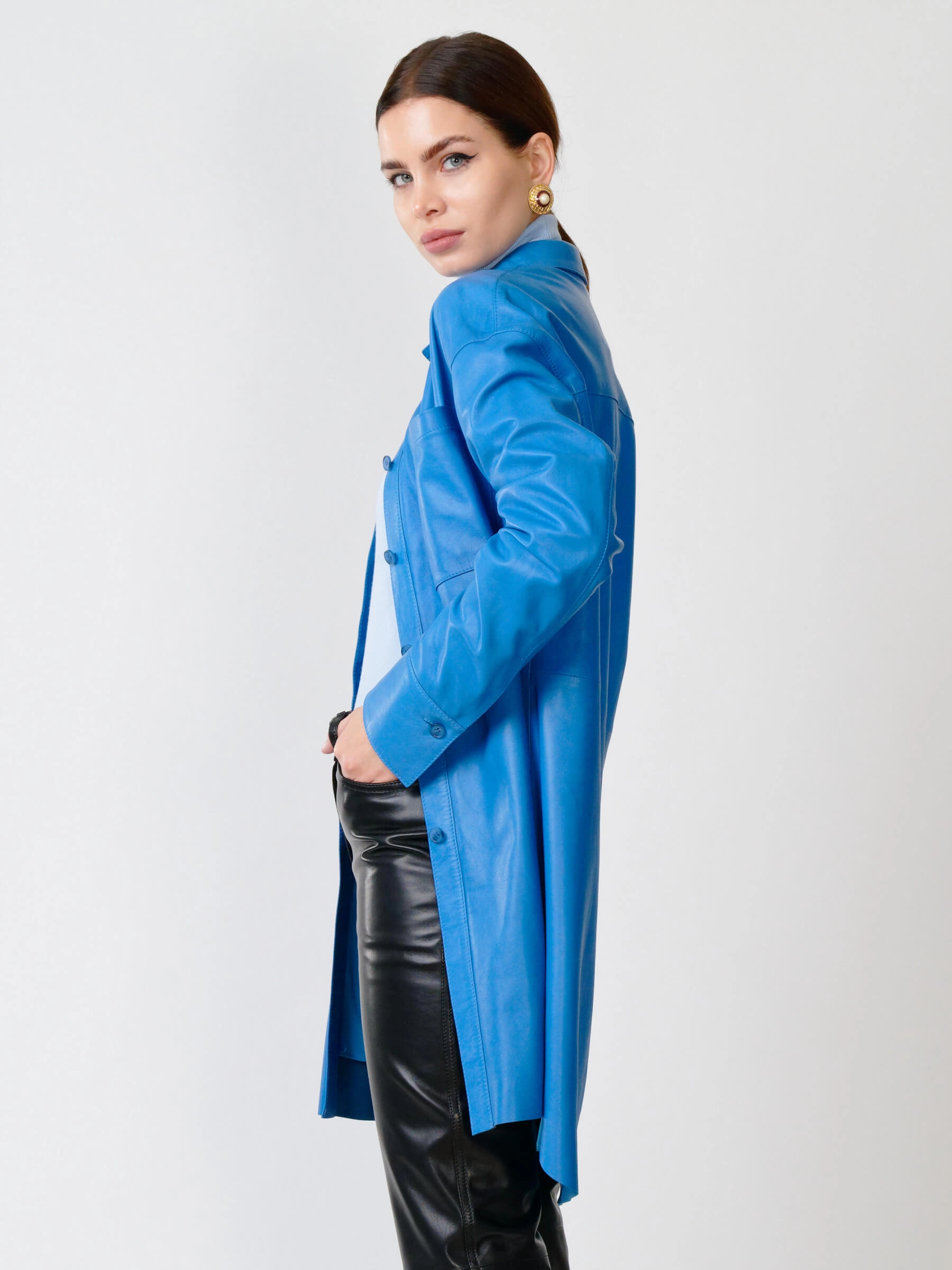 Женская рубашка из мягкой натуральной кожи в четырех цветах — идеальный баланс стиля и практичности. Прямой силуэт с застежкой на пуговицах оформлен изысканным отложным воротником и аккуратными манжетами, а функциональный нагрудный карман и изящные закругленные разрезы по бокам добавляют образу характер. Широкий кожаный пояс подчеркивает талию, позволяя варьировать образ от бунтарского с кожаными брюками и ботильонами до непринужденного с джинсами и кедами. Особую прелесть модели придает бархатистая фактура кожи, которая великолепно играет со светом, сохраняя при этом комфорт при носке. Универсальный оттенки, удобная посадка и продуманные детали делают эту рубашку must-have для ценительниц небанальных решений в повседневном гардеробе.
